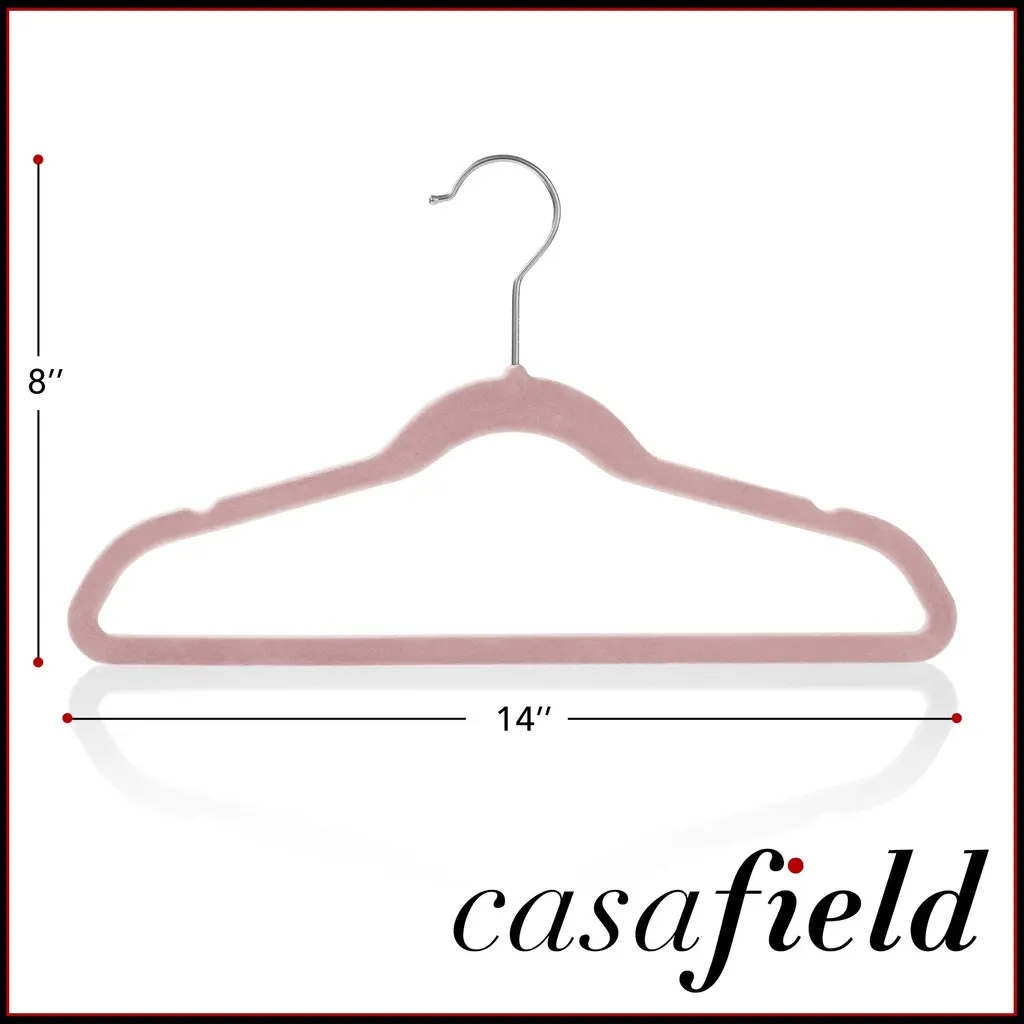 Set includes: 100 Velvet Flocked 14" Kids HangersMaximize your closet space: Unclutter your kid's closet and add up to 50 percent more space with the ultra-thin profile of these slim, space-saving hangers from Casafield.Lightweight, sturdy design: Durable yet lightweight. Stylish yet practical. Our flexible children's hangers feature a shiny chrome hook with 360-degree swivel, which will not rust. Not only are they attractive, but our clothes hangers can hold up to 5 pounds, making them ideal for hanging everything as your child grows, from puffy winter coats to school uniforms to strappy summer dresses.Easy on kid's clothes: The soft velvet flocking helps clothes maintain their shape. The textured fabric and precisely-cut shoulder notches secure strappy tanks, shirts and dresses with ease. The velvet flocked pant bar is designed to grip and prevent creasing, leaving their denim jeans, dress pants and skirts in place and no longer wrinkled on the closet floor.Double-duty design: Instantly organize and streamline your child's closet space with our velvet hangers. Hang tops, pants, or both on these perfectly sized kid's hangers from Casafield. Featuring 14-inch wide, contoured shoulders and a horizontal pant cross-bar design, the hanging and organizing possibilities are endless. Give you child's closet an instant makeover and organize the closet of your dreams with these non-slip, space-saving velvet flocked kids hangers from Casafield. Never again will you have to deal with their clothes slipping off, losing shape and becoming wrinkled due to the use of standard plastic or wire hangers. Maximize their closet space with the ultra-thin profile of these velvet flocked clothes hangers. The slim design of our kid's hangers free up to 50 percent more closet space. Our textured clothes hangers feature precisely cut notches and contoured shoulders gripping items like tank tops and strappy dresses with ease. These velvet kid's hangers from Casafield feature a horizontal cross-bar that securely grips jeans, pants, trousers, skirts and sweaters while preventing creases and clothing piles on the closet floor. The double-duty design is perfect for hanging both pants and tops together allowing you and your child to organize all their outfits making them ready to wear. The strong, 360-degree swivel hooks easily allow you to easily hang any garment in either direction. Our shiny chrome hooks also resist rusting for lasting use. Casafield velvet kid's hangers are designed to hold up to 5 lbs., making them great for hanging children's coats, outerwear, and much more. Dimensions: Overall: 14" x 1/4" x 8" Distance from pant bar to top of hook: 7-1/2" Using Your Hangers: These flexible, lightweight yet sturdy hangers combine luxurious design with an affordable value for lasting performance. Before the first use, we recommend that you rinse your hangers under cold water for 30 seconds to remove any residue and then lightly twist the hook to engage the swivel. We do not recommend using our velvet flocked hangers to hang-dry wet clothing and other laundered items. Casafield is an industry leader in affordable home accessories and organizational solutions perfect for any style and budget.
