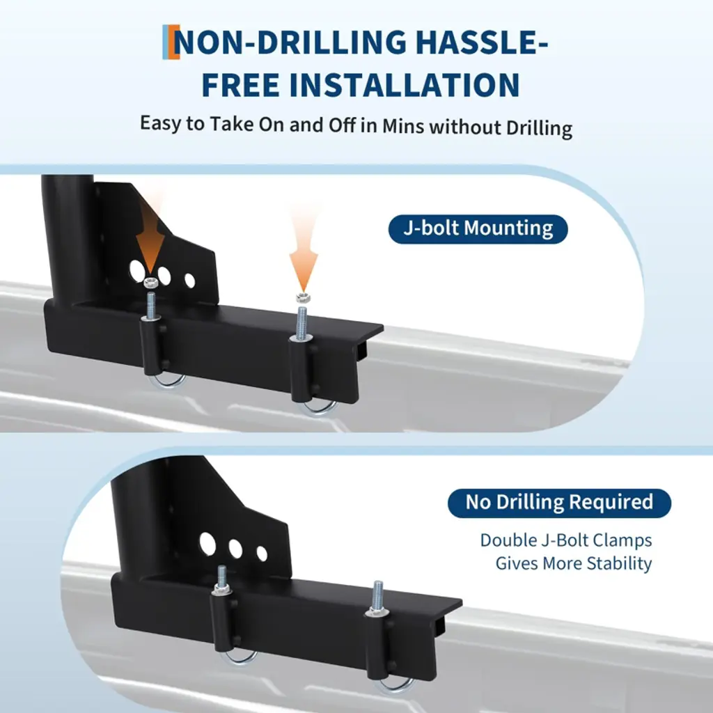 Universal Fit Design: Adjustable side rails (35"-67") and crossbar (52"-82") ensure compatibility with most full-size pickups including F-150 models for versatile use. Heavy Duty Construction: Made from powder-coated alloy steel with reinforced triangular gussets, this rack supports up to 1000 lbs, ideal for ladders, lumber, rooftop tents, and job site gear. No-Drill Installation: Comes with 8 J-bolts for quick, no-drill mounting that prevents vehicle damage and allows easy removal or repositioning to accommodate different cargo needs. Secure Tie-Down Points: Features 10 rope holes, side hooks, and flexible crossbar placement to safely secure kayaks, surfboards, ladders, and outdoor adventure equipment. Adjustable Height & Versatility: Height adjusts from 52" to 82" to fit various cargo sizes, making it perfect for rooftop tents, surfboards, and heavy-duty transport tasks.