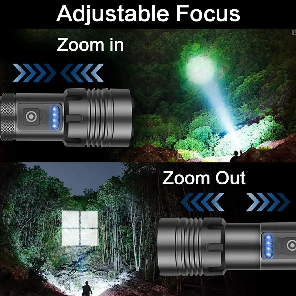 Must-have at home, in case of power outages! Must-have outdoors, no longer in the dark when walking at night! Essential for camping, enjoy the freedom of night activities at any time! Necessary for emergencies, In case of a sudden emergency! The new power output design makes our flashlight can be used as a power bank,5V/1A 10000mAh output,don't worry about running out of power on your mobile device outdoors.(Output port is next to the charging port.) 6.85 inches long, the zoomable stretch range is about 1 inch. It does not take up storage space and can be easily put into a backpack.Suitable for carrying both at home and outdoors. Features Light Mode:4 modes (High-Low-Red-Red Strobe) Switching method:Double-click the switch quickly to change to side light,then short click the switch to the mode you want. Product size: 17.4*4.3*3.5CM Net weight: 205G Material: Aluminum alloy Battery: 1*26650 (Built-in) Charging method: USB charging, support output Indicator light: 4 blue LED power display, power consumption jumps once, the LED flashes and is fully lit when charging, the blue indicator at the switch is the switch indicator XHP70 3 Gears : Strong light-Weak light-Flash Double-click to switch COB mode COB 4 Gears: Strong light-Weak light-Red light strong light-Red light flashing Zoom method: telescopic zoom Waterproof level: IPX4 Package Includes: 1x 100000 Lumens Led Flashlight 1 x 26650 batteries(Built-in) 1 x USB Cable 1 x Rope [Super Bright Flashlight] Led flashlight built-in advanced led lamp bead,maximum brightness up to 100000 lumens,easily light up an entire room or focus on objects up to 1000 feet away!Suitable for home and outdoor use .It can be used as a long-distance tactical flashlight. [7 Modes and Upgrade Side Lighting] Our led flashlight has 7 lighting modes ,3 modes for main lighting(High/Low/Strobe) by short pressing the switch. 4 modes for upgrade side lighting(High/Low/Red/Red Strobe) by quickly double-press the switch,then short press to change mode.2 ways to turn off : 1.Press the switch to change the brightness mode and turn off in cycle. 2.Long press the switch 2-3 seconds to directly turn off . [Usb Charging and Power Output] USB rechargeable flashlight is powered by 1 * 26650 rechargeable lithium batteries, which can be used for up to 5 hours each time. What's more, our LED flashlight has the power output function, so you can use it as a power bank to charge your phone. [Zoomable and Wateroproof] Made of high quality Aluminum Alloy, the flashlight is durable and water resistant, allows the convenient usage in various extreme weather.Use the adjustable zoom to focus in on faraway objects or zoom out to light up a wide area,just need to push the front of the flashlight firmly to adjust. [Long Lasting] Emit more brightness than average light, powered by 22650 batteries (include) , enables hours working time.
