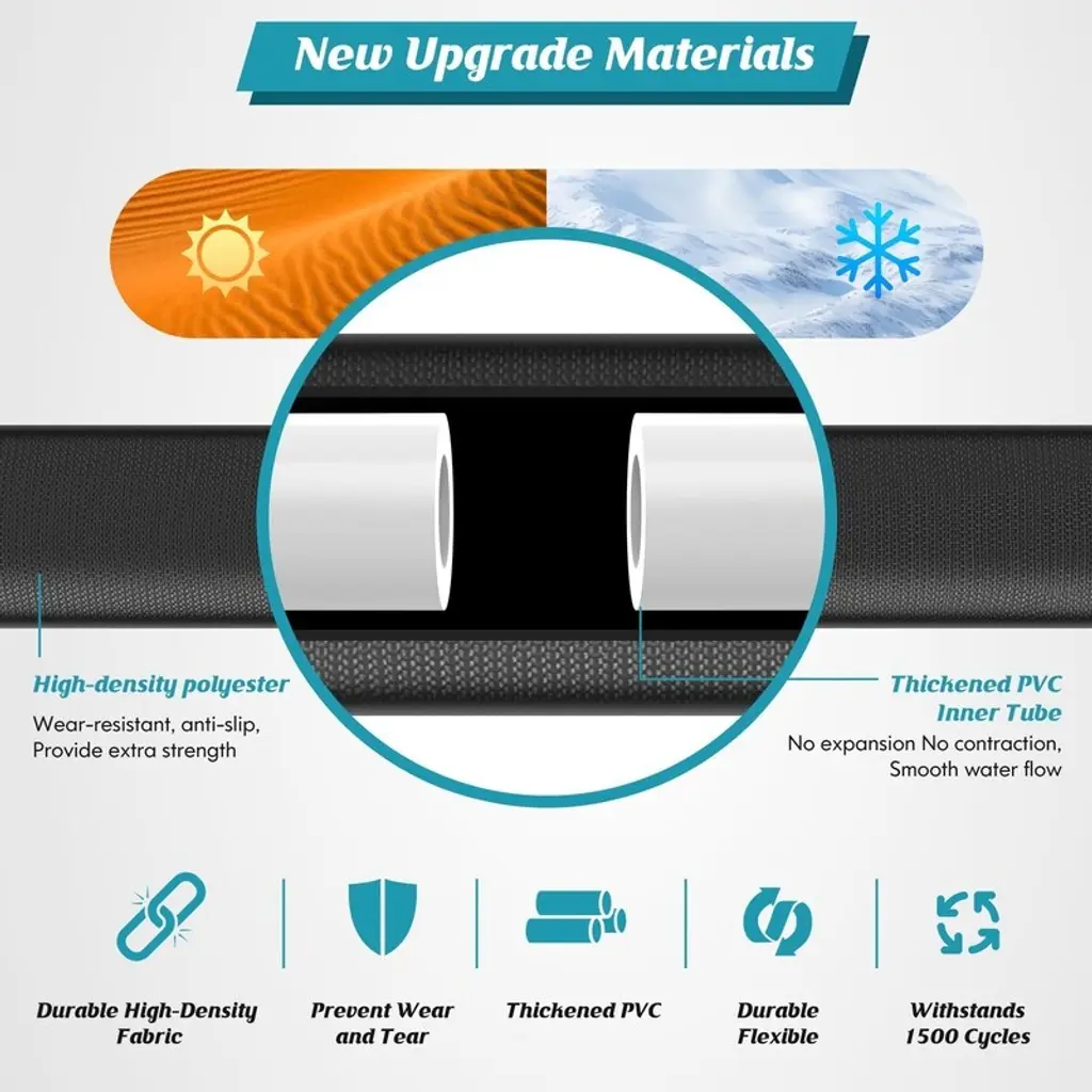 100ft Long & Lightweight – Covers large areas without heavy lifting or tangling. Kink-Free Design – Stays flat and flexible for smooth water flow and easy storage. 10-Function Spray Nozzle – Adjustable settings for watering, washing, and more. Durable Non-Expanding Build – Consistent water pressure without ballooning or bursting. Multi-Use Versatility – Perfect for garden, yard, car wash, RV, marine, and camper needs.