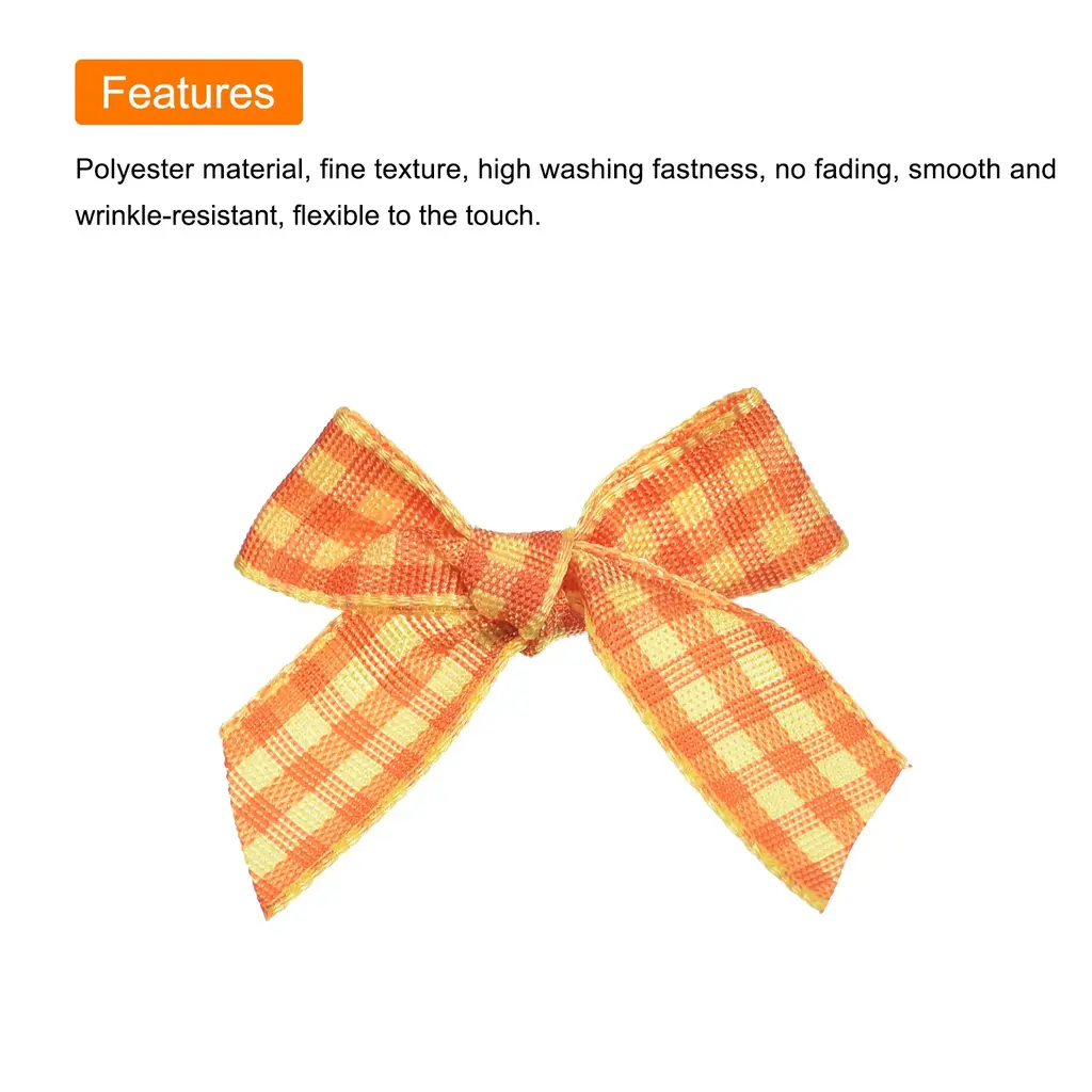 What is this?These ribbon bows are mostly used in the hemming and decoration of leather goods, bags, sleeping bags, tents, and clothing. Because polyester ribbon is soft, they are mostly used for the hemming of softer fabrics.What will I get?The Mini Ribbon Bow, we provide here, is in size of:Material: PolyesterColor: OrangeDimension: 42 x 39mm/1.65 x 1.54 inch (L*W)In the package of: 100 x Mini Ribbon BowsAre there any advantages of the product?1. Polyester material, fine texture, high washing fastness, no fading, smooth and wrinkle-resistant, flexible to the touch.2. The product is bright in color, fashionable and new in design, and can be used on many occasions. It is suitable for hair accessories, clothing, Christmas gifts, baking decorations, gift box packaging, hotel decorations, wedding decorations, flower packaging, birthday arrangements, etc.How to use it?1. Choose the color of the Mini Ribbon Bow that matches your project or gift wrapping paper. 2. Use twist ties (not included here) or or glue to secure the mini ribbon bows to desired surfaces such as gift boxes, cards, or crafts. 3. Adjust the position of the bow if necessary to get the desired look.What should I notice?Manual measurement, please allow slight errors in size.Please note that there may be a slight color difference between the picture and the actual product, and the color is subject to the actual product received.