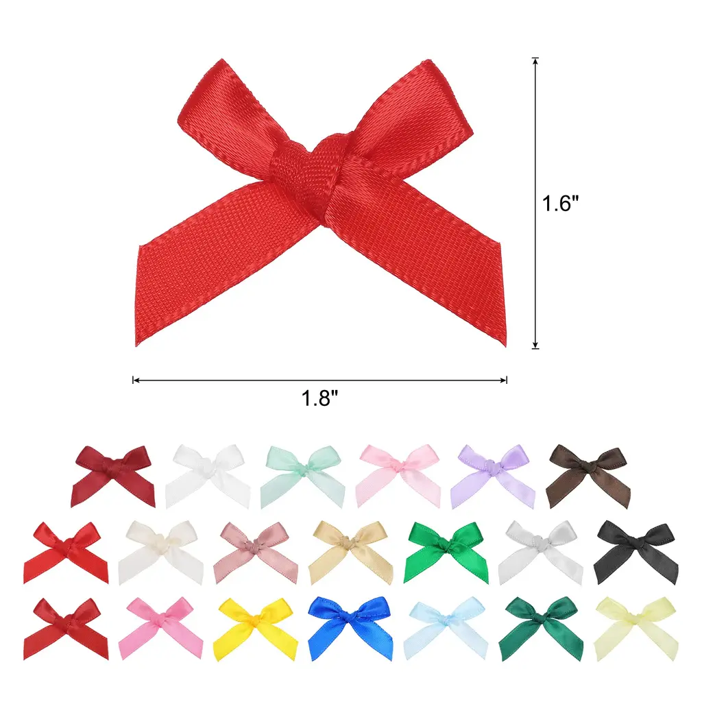 What is this?These ribbon bows are mostly used in the hemming and decoration of leather goods, bags, sleeping bags, tents, and clothing. Because polyester ribbon is soft, they are mostly used for the hemming of softer fabrics.What will I get?The Mini Ribbon Bow, we provide here, is in size of:Material: PolyesterColor: Black, Red, White, Pink, Dark Blue, Purple, Gray, Light Green, Bright Yellow, Rose Red,Light Blue, Light Yellow, Han Pink, Light Grey, Dark Red, Dark Coffee, Champagne, Deep Dark Green, Green, Wine Red, Beige.Dimension: 1.8x1.6 inchIn the package of: 100 x Mini Ribbon BowsAre there any advantages of the product?1. Premium polyester material, fine texture, high washing fastness, no fading, smooth and wrinkle-resistant, flexible to the touch.2. The product is bright in color, fashionable and new in design, and can be used on many occasions. It is suitable for hair accessories, clothing, Christmas gifts, baking decorations, gift box packaging, hotel decorations, wedding decorations, flower packaging, birthday arrangements, etc.How to use it?1. Choose the color of the Mini Ribbon Bow that matches your project or gift wrapping paper. 2. Use twist ties (not included here) or or glue to secure the mini ribbon bows to desired surfaces such as gift boxes, cards, or crafts. 3. Adjust the position of the bow if necessary to get the desired look.What should I notice?Manual measurement, please allow slight errors in size.Please note that there may be a slight color difference between the picture and the actual product, and the color is subject to the actual product received.