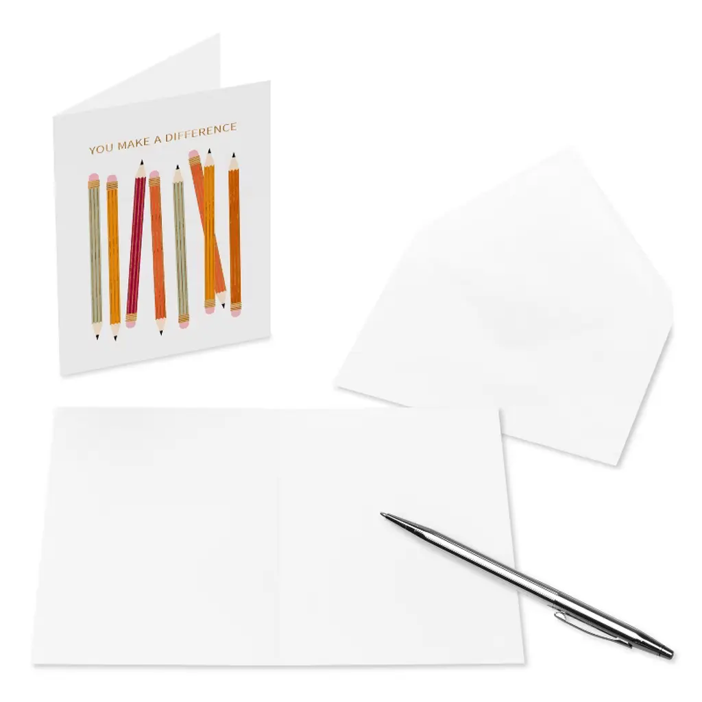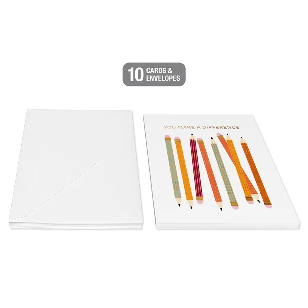Express your gratitude or thoughtful greetings with these unique stationery note cards. Each card features a colorful pencil design and the inspirational words 'You Make a Difference.' Blank on the inside, these cards are perfect for personalizing messages whether it's for a thank you, encouragement, or just keeping in touch. This pack of 10 allows you to spread kindness and appreciation throughout the autumn season. Envelopes are included to make your card sending complete. American Greetings offers exceptional greeting cards, gift wrap and celebration products so you can connect in ways that fit your personality and authentic style.