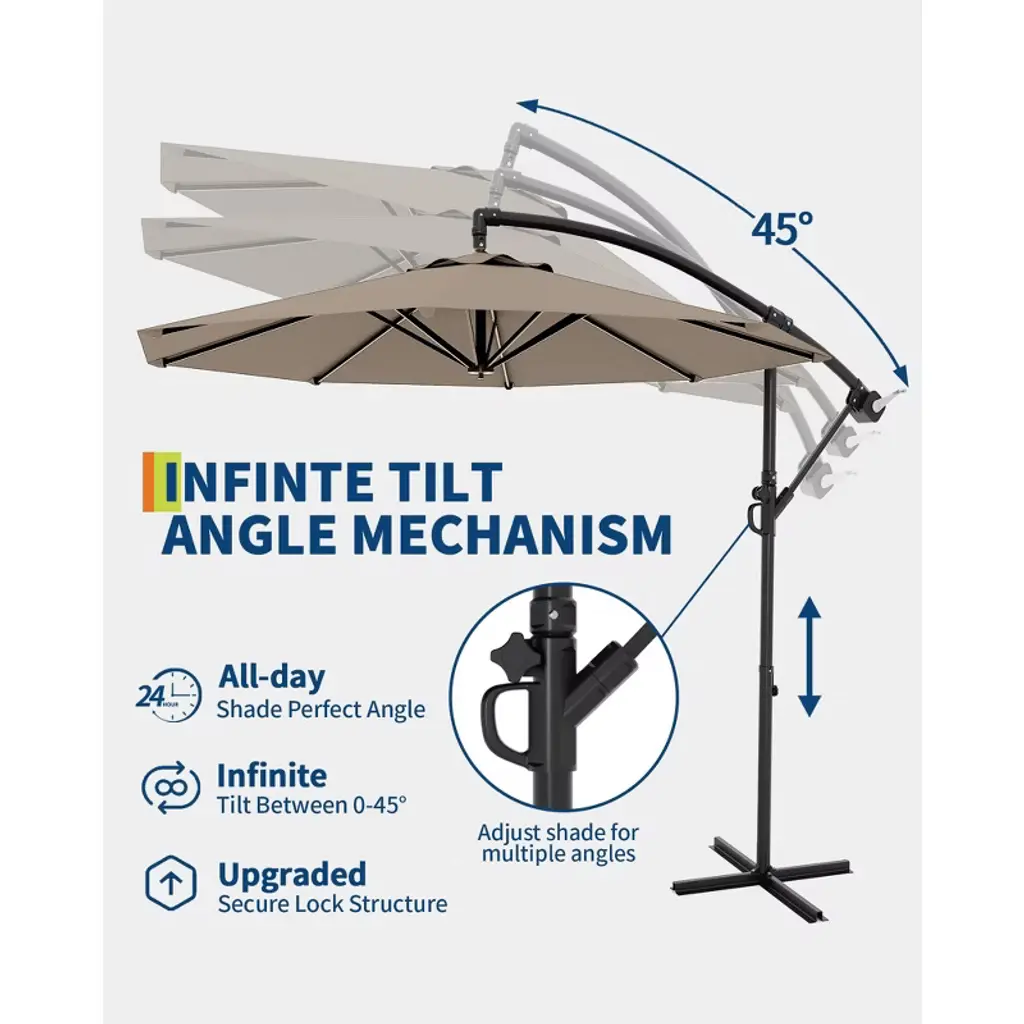 10ft Cantilever Patio Umbrella, Hanging Umbrella With Cross Base, Crank Lift & Tilt For Maximum Shade Coverage Brown