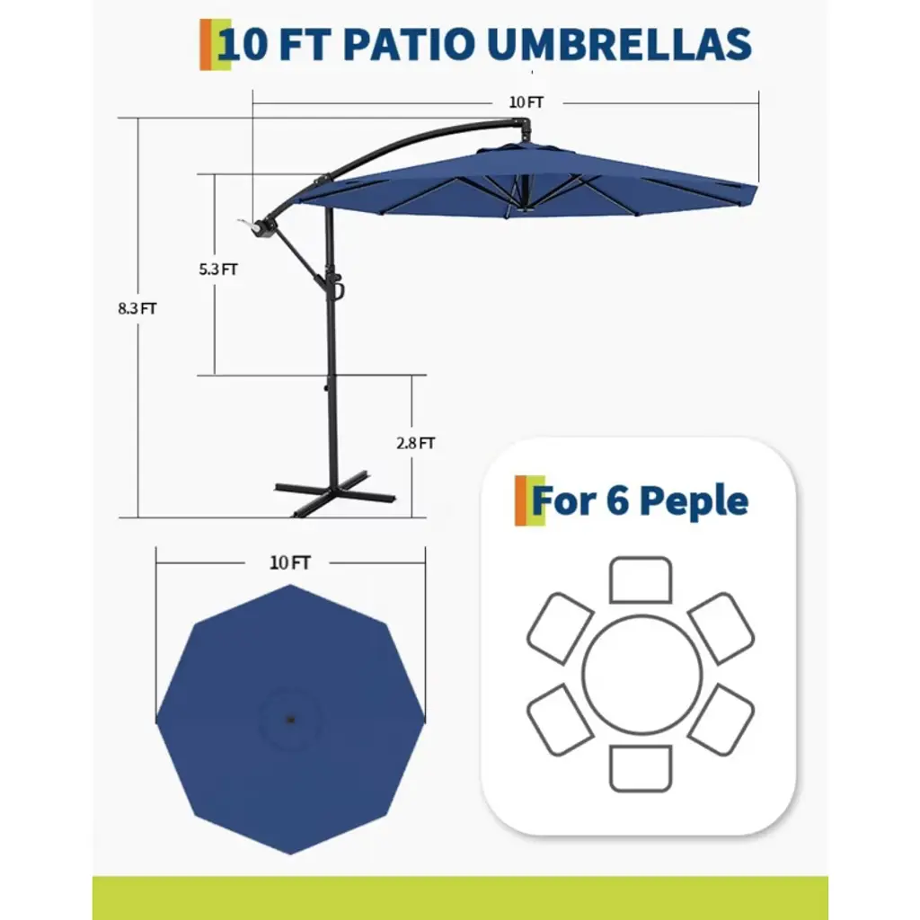 Stay cool and stylish with this 10FT Cantilever Umbrella, designed to provide wide shade coverage for 2–6 people. Featuring an easy-to-use crank lift and infinite tilt system, it allows precise angle adjustment to block sun from any direction. The durable, fade-resistant canopy and rust-resistant steel frame offer year-round reliability, while the included cross base adds stability for poolside, garden, patio, or deck use. Ideal for lounging, dining, or relaxing outdoors, this umbrella is your go-to solution for flexible, dependable shade.