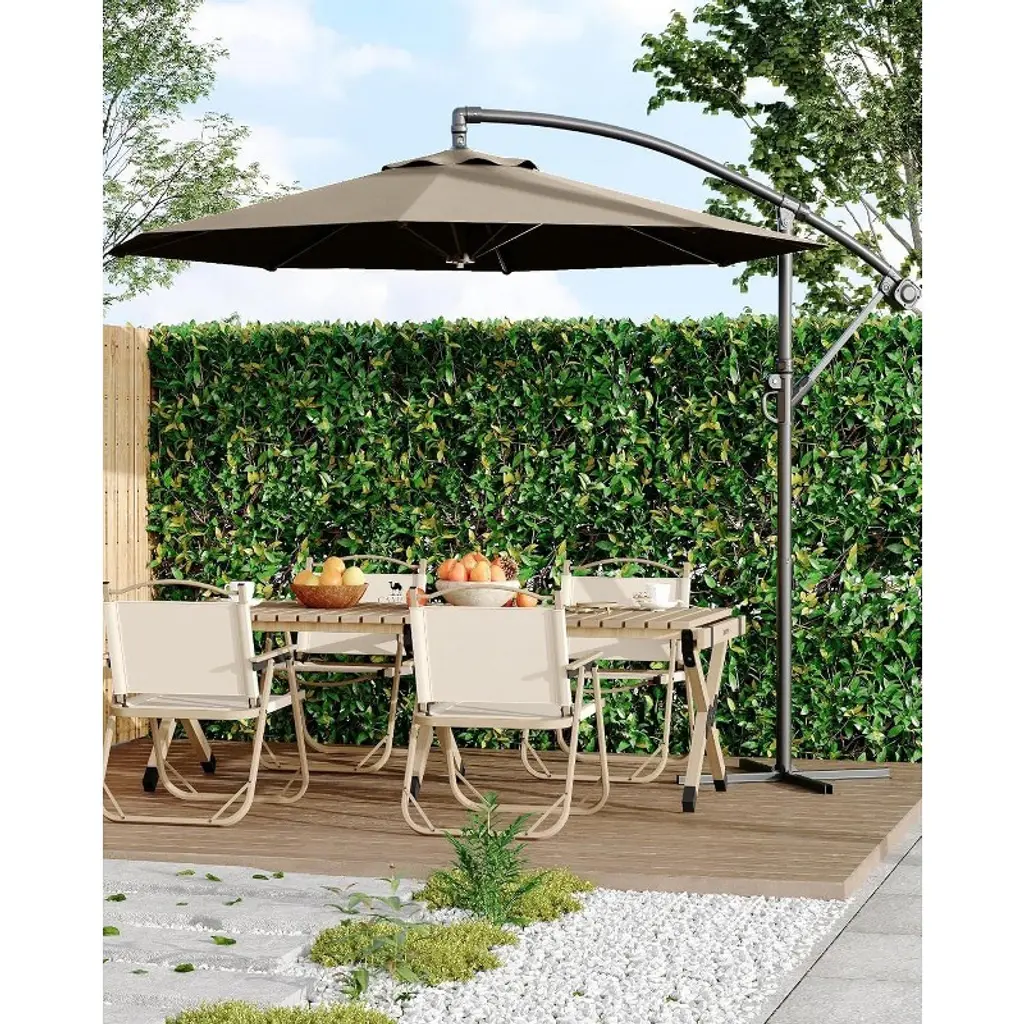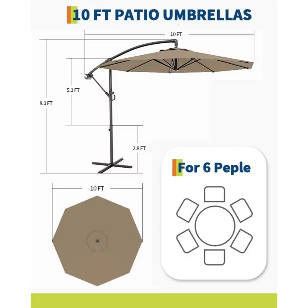 Stay cool and stylish with this 10FT Cantilever Umbrella, designed to provide wide shade coverage for 2–6 people. Featuring an easy-to-use crank lift and infinite tilt system, it allows precise angle adjustment to block sun from any direction. The durable, fade-resistant canopy and rust-resistant steel frame offer year-round reliability, while the included cross base adds stability for poolside, garden, patio, or deck use. Ideal for lounging, dining, or relaxing outdoors, this umbrella is your go-to solution for flexible, dependable shade.
