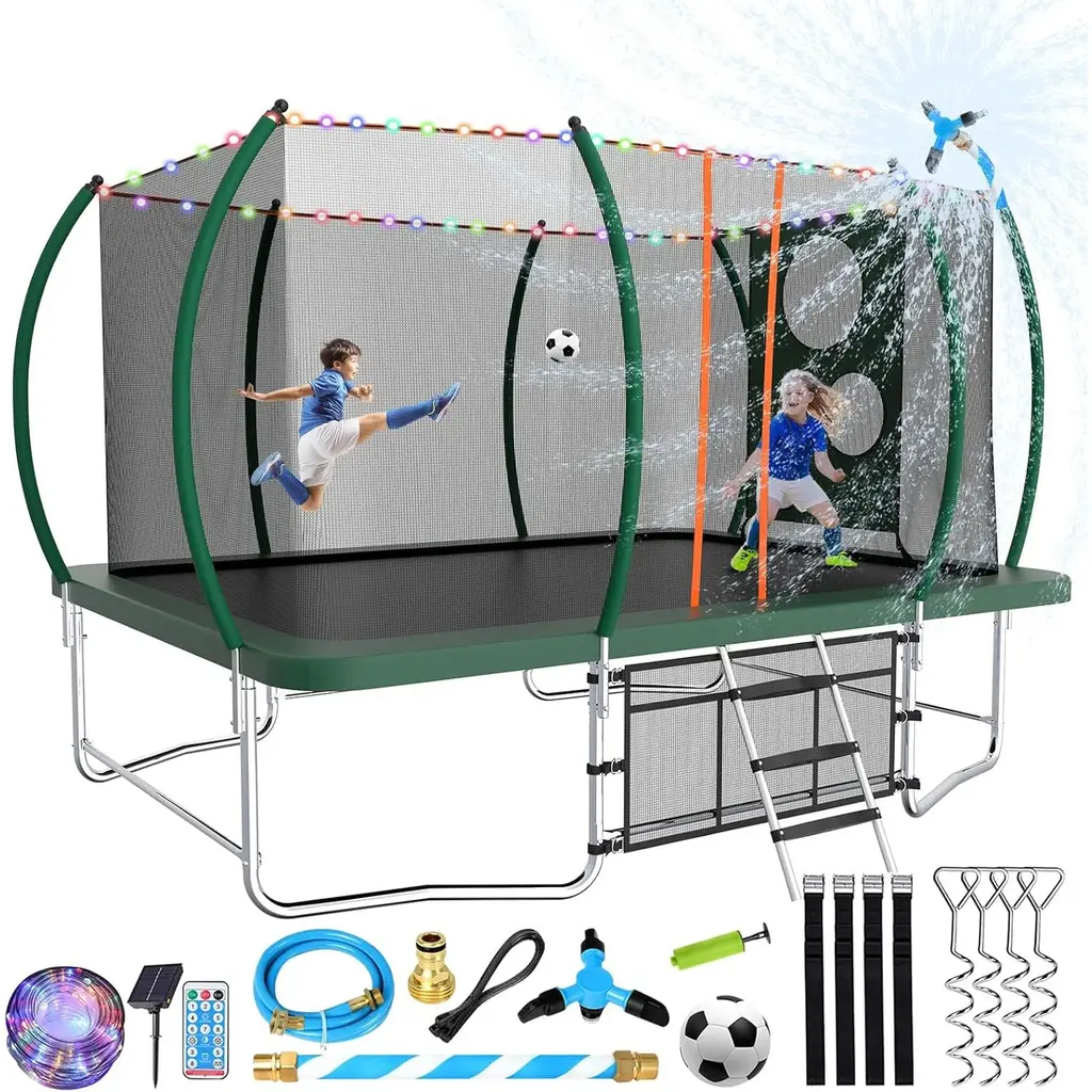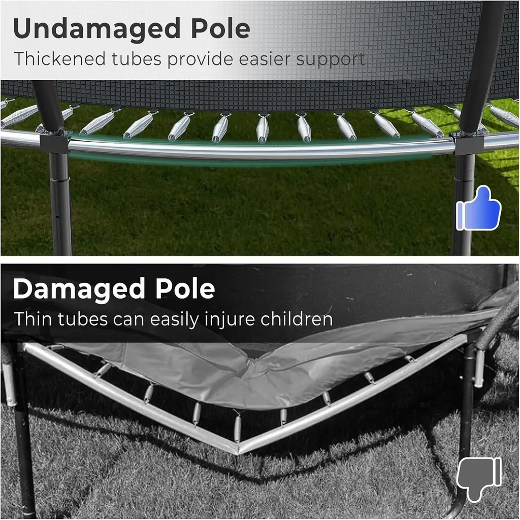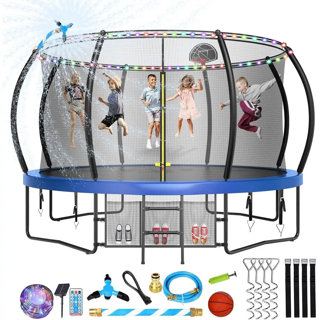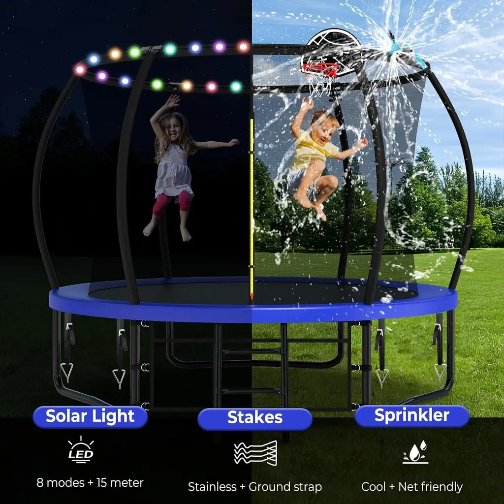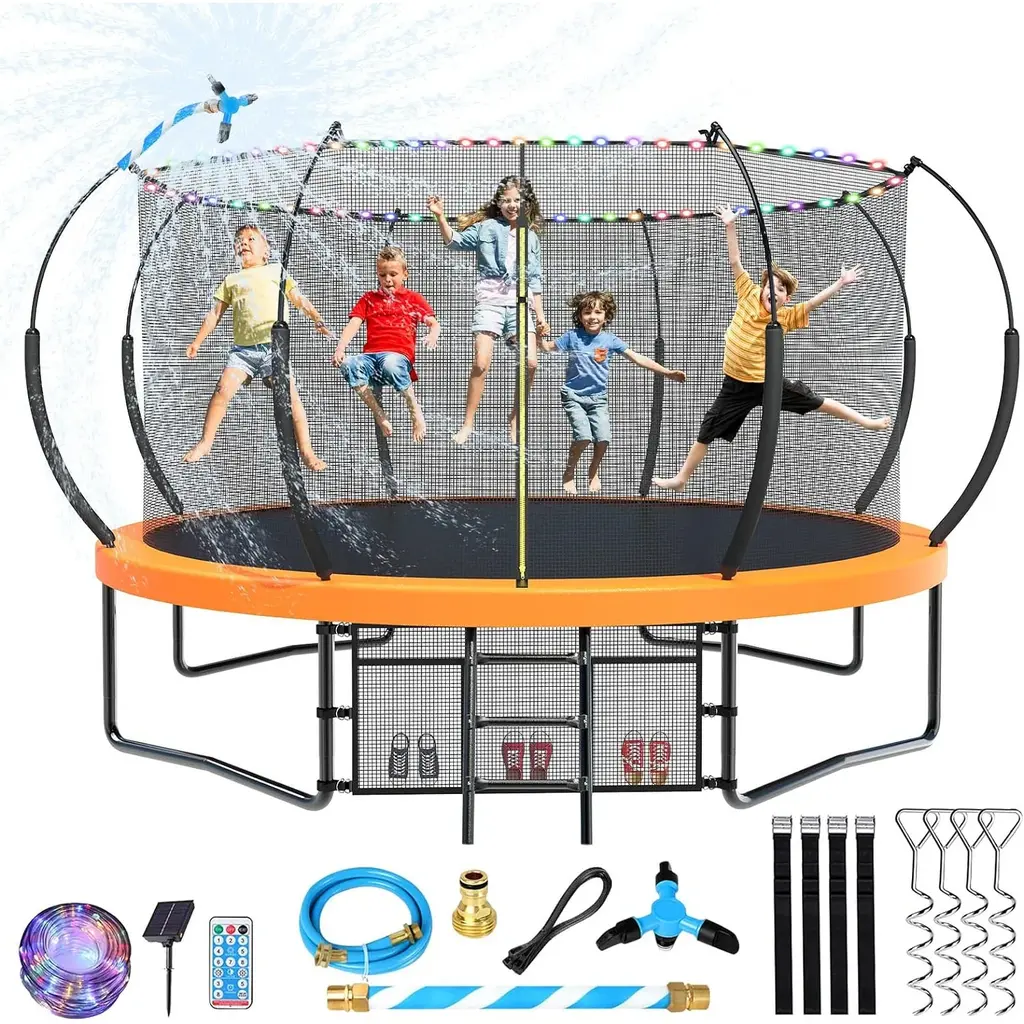【Safety Above All】Pumpkin trampoline is crafted with curved poles, and designed with high-quality netting to prevent accidents and injuries. Safety pads cover the springs to ensure kids enjoy the fun without risk, offering peace of mind for parents【Complete Trampoline Set】This 10ft trampoline package includes everything you need for year-round entertainment: a sprinkler for cool summer fun, stakes for added stability, and light for nighttime jumping, promising endless fun and laughter for the whole family【Durable and Stable Construction】Featuring heavy-duty galvanized steel with T-joints for increased frame stability, the outdoor trampoline ensures a secure jumping experience. Its stability is enhanced by multiple W-shaped legs, providing a firm foundation for jumpers【Exceptional Bounce and Longevity】With industry-leading springs and a premium bounce mat, 10 foot trampoline delivers exceptional jumping performance. The materials are tested for resilience and can withstand extensive use, ensuring a lasting addition to your backyard【Easy Assembly & Weatherproof Build】Featuring a galvanized steel frame with powder-coated legs, our trampoline ensures resilience against the elements. Its design stands up to both rain and snow, allowing for year-round enjoyment without the need for disassembly