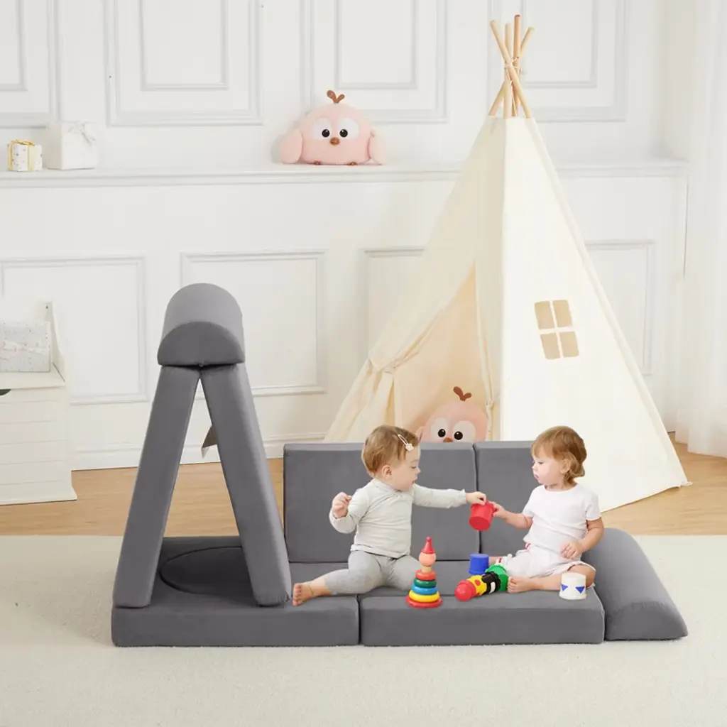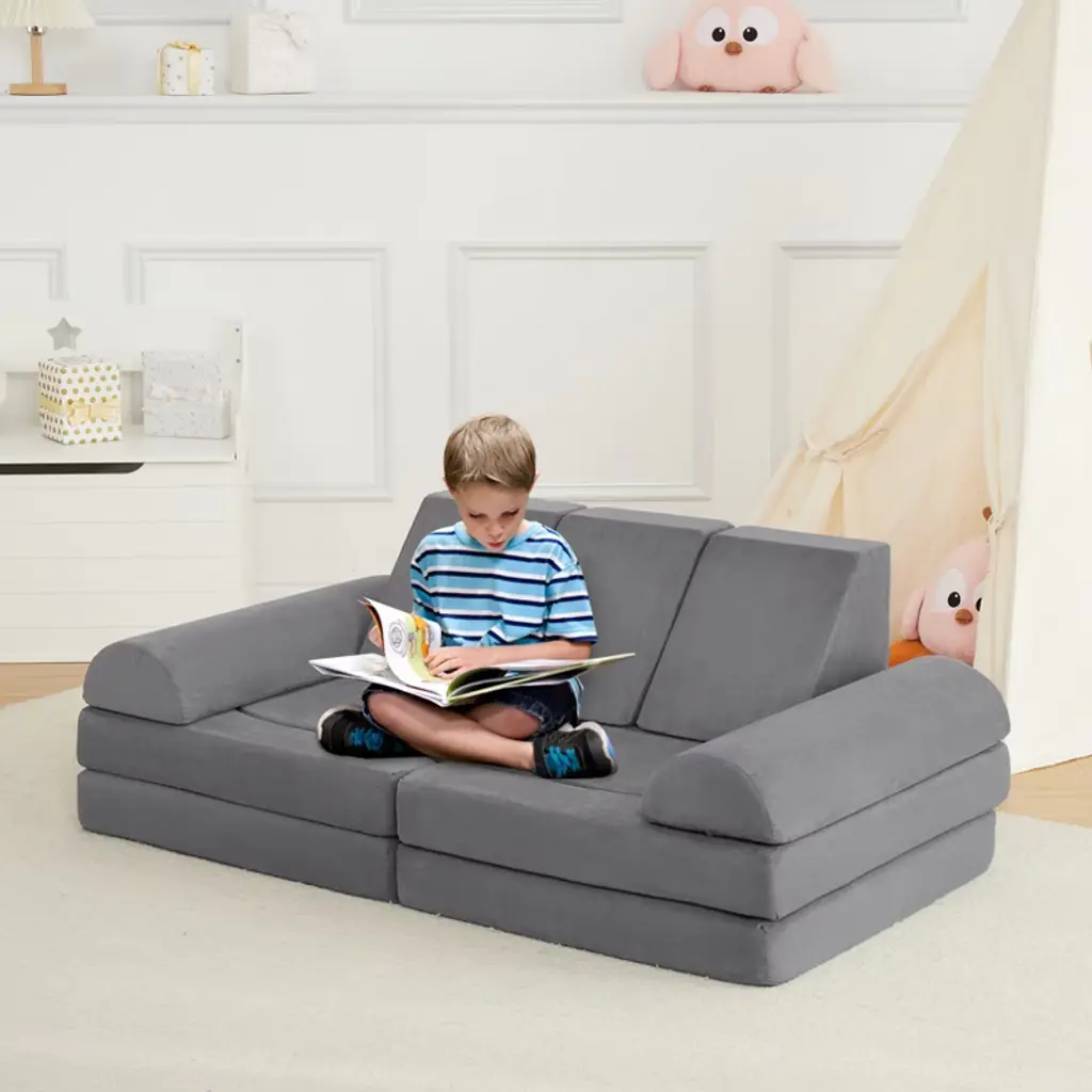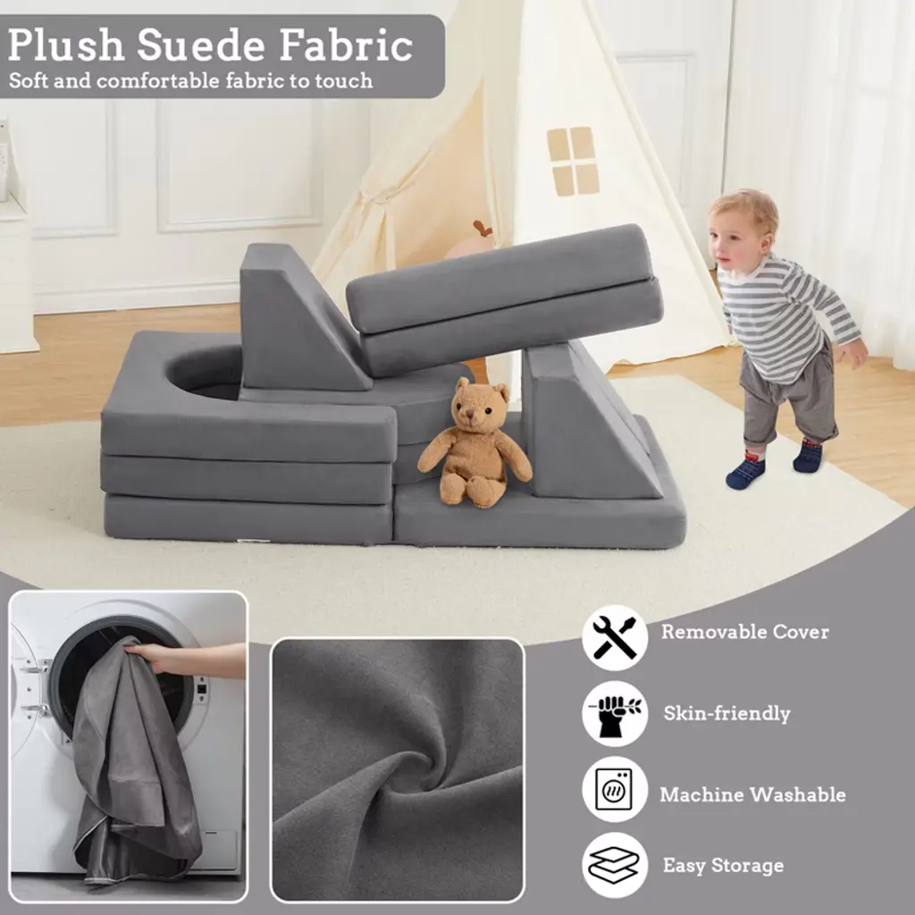 This modular kids' play sofa set encourages endless creativity, allowing children to build forts, castles, or cozy recliners. Made with high-density sponge and plush suede covers, it provides both comfort and durability. The removable, machine-washable covers make cleaning easy, while soft edges and rounded corners ensure safety. Ideal for inspiring imagination and supporting safe, interactive play for children 12 months and up.