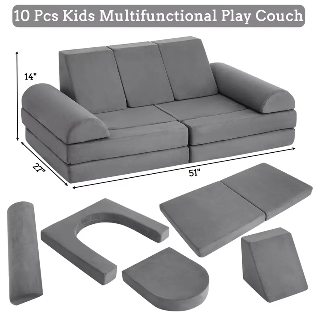 10pcs Kids Play Couch, Soft Foam Sofa With Machine Washable Cover, Thick Cushion Fort Building Set For Indoor Playroom, Dark Grey