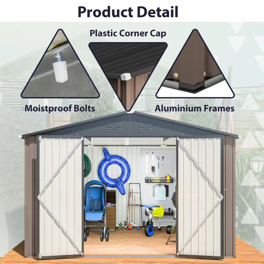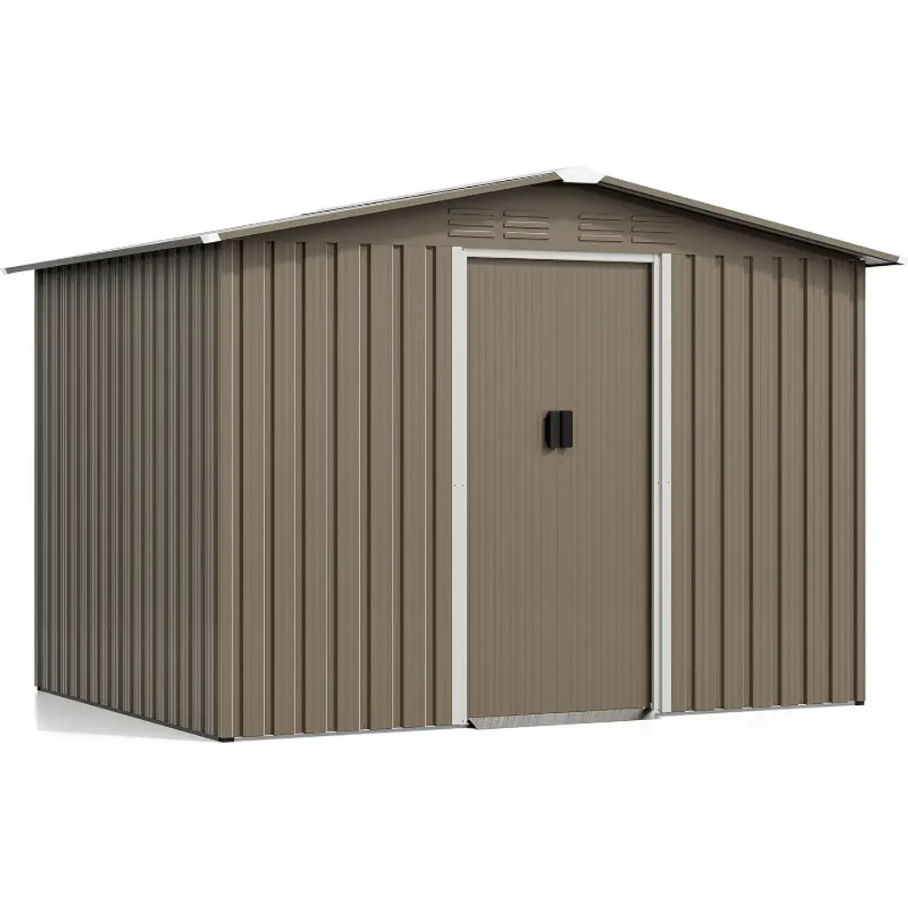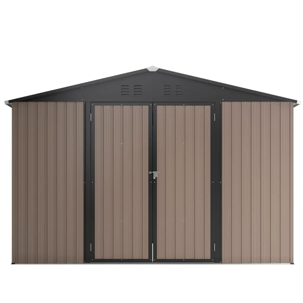 10'x10' Brown Metal Storage Shed For Ourdoor Steel Yard Shed With Design Of Lockable Doors Utility And Tool Storage