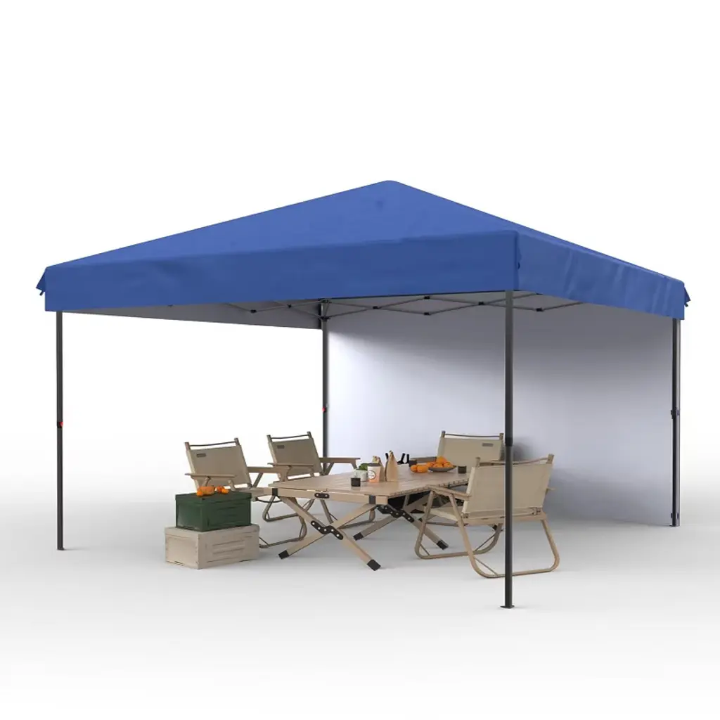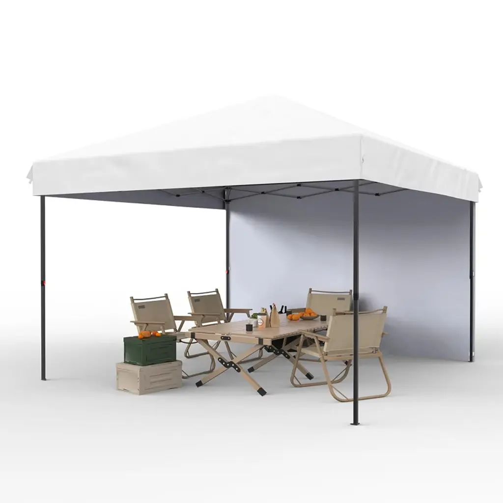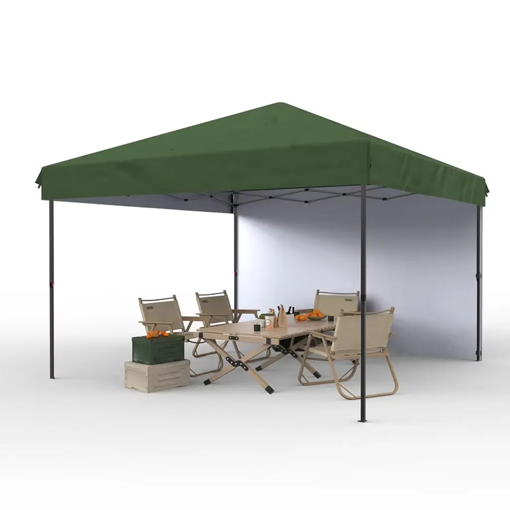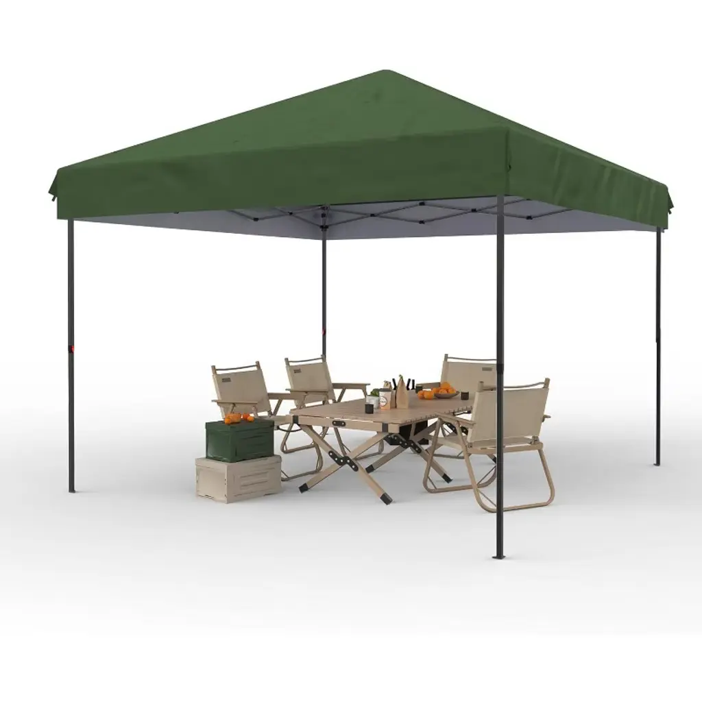 Product Name: Pop Up Canopy TentProduct Dimensions:Item Package Dimensions L x W x H(in.): 48.43 x 8.27 x 9.06Item Dimensions L x W x H(in.): 120 x 120 x 72Product advantages:1.Durable & Sturdy Design: This pop-up canopy features a reinforced steel frame with industrial-grade rust-proof coating, ensuring long-term outdoor use without deformation or fading. The thickened canopy fabric effectively blocks sunlight and rain, making it a reliable choice for markets, camping, and outdoor activities.2.Airflow & Climate Control: Our pop-up canopy features dual-layer removable mesh panels that promote excellent cross ventilation while maintaining privacy. The silver-coated canopy fabric reflects heat effectively, creating a noticeably cooler shaded area that stays comfortable even on hot summer days.3.Quick & Easy Setup: With a unique one-touch deployment system, this pop-up canopy can be set up solo in under 10 minutes. The included wheeled carry bag makes transportation and storage of all accessories effortless.4.Versatile for Multiple Uses: From weekend market stalls to backyard parties, this pop-up canopy’s spacious coverage meets various needs. The customizable removable sidewalls allow flexible adjustments for different occasions.5.Complete Accessory Kit: Each pop-up canopy includes 8 ground stakes, 4 sandbags, and spare parts to ensure stability on any terrain. The well-designed drainage system effectively prevents rainwater pooling.