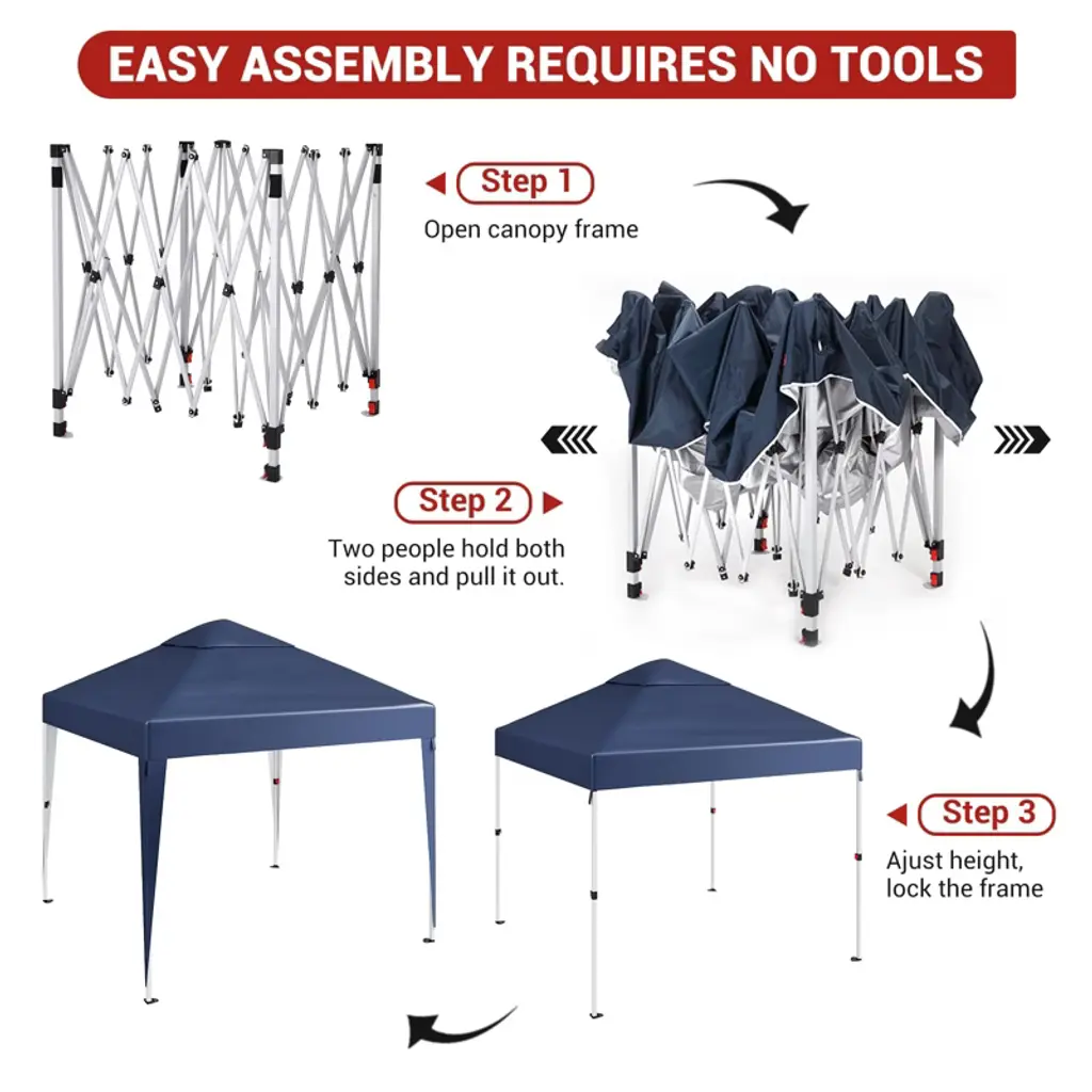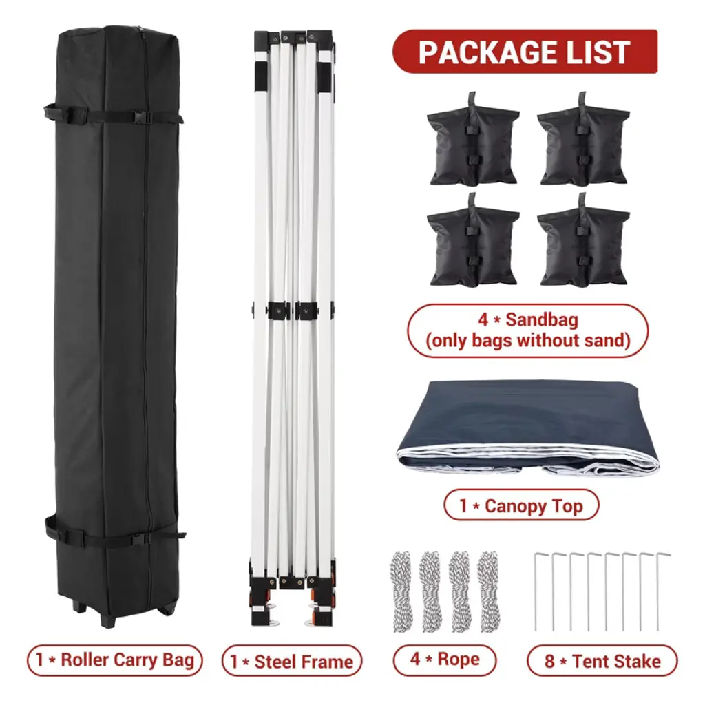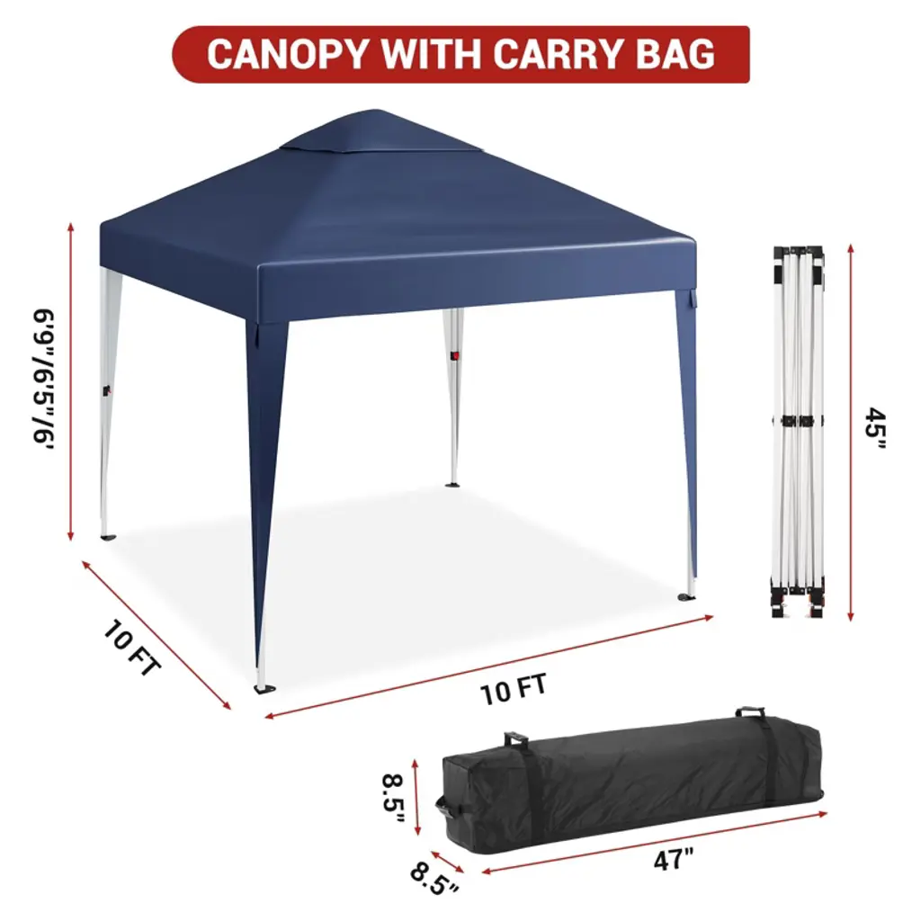 10 x 10 Pop Up Canopy TentExperience outdoor gatherings like never before with the spacious and durable pop up canopy tent, designed for comfort and convenience in any setting!Highlights at a Glance:Easy and quick setupPortable with wheeled carrying bagSpacious coverage for gatheringsAdjustable height optionsDurable, rust-resistant frameStable with included accessoriesVersatile for various outdoor eventsSpecifications:Size: 10 x 10 FtAdjustable Heights: 6'9"/6'5"/6'Roller Bag Size: 47 x 8.5 x 8.5 inMaterial: Steel, 210D Silver Coated TarpRecommended Uses For Product: Commercial Events, Party, Camping Friendly Note:For best results, follow the assembly instructions included. Simply take the frame out of the carrying bag, expand it, and secure the canopy tent using the push buttons. Ensure all connections are properly locked for stability.Use the included sandbags, ground stakes, and ropes to secure the canopy during windy conditions. In case of severe weather or storms, it's recommended to disassemble the canopy to prevent damage.1 x Pop Up Canopy Tent