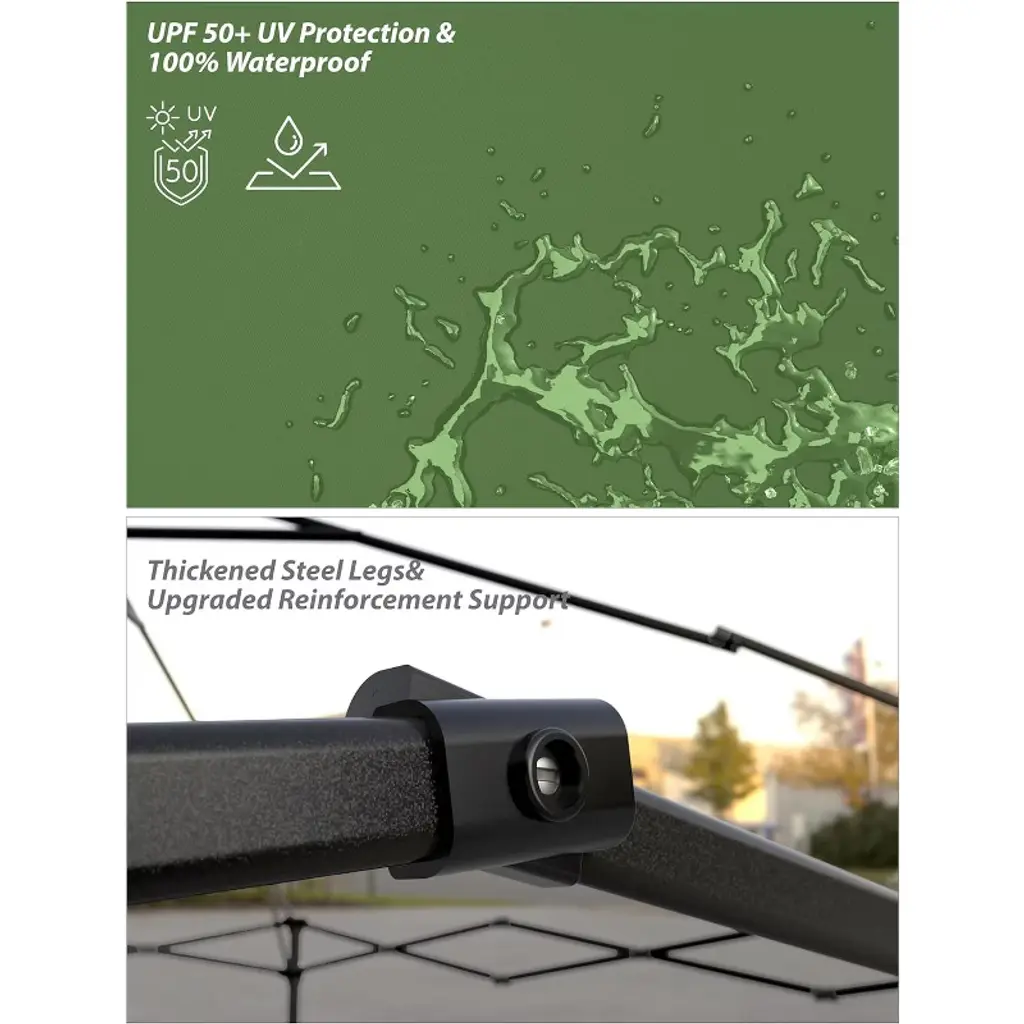 Feature:Crafted from 210D Oxford fabric, this outdoor canopy tent is built to withstand various weather conditions. The superior material is both water-resistant and UV-protected, ensuring that you stay dry and protected from harmful sun rays. With its robust metal construction, this backyard tent is designed for long-lasting use, making it a reliable addition to your outdoor activities.The foldable design allows for easy setup and takedown, making it perfect for on-the-go events. It can be set up in minutes, providing instant shade and shelter wherever you need it. Without side walls, this party tent offers an open and airy feel, making it ideal for a variety of applications. Use it for family gatherings, outdoor events, farmer's markets, craft fairs, or even camping trips. Its versatility makes it suitable for both personal and commercial use.The modern design of the sun shelter adds a touch of elegance to your outdoor space. The package includes the folding canopy tent along with a carrying bag for easy transport and storage. All necessary components for assembly are included, ensuring a hassle-free setup Specification:Size: 10x10 FT Color: GreenTop Cover Material: 210D Oxford FabricFrame Material: MetalWater Resistance Level: WaterproofUltraviolet Light Protection: YesPacking List: 1x Frame1x Canopy1 x Wheeled Bag4 x Guy Ropes4 x Sandbags8 x Ground Stakes Note:To prevent damage to the canopy and potential hazards to individuals and property, avoid assembling or leaving the fully assembled canopy in adverse weather conditions. It is recommended to store the product in a clean, dry location, protected from humidity, direct sunlight, frost and dust, and keep it out of children's reach.