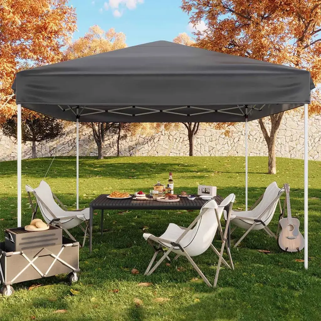 Ready-to-go awning - commercial shelter in minutes! Easily shade anywhere, anytime! This durable 10'x10' pop-up tent deploys on its own in minutes by one or two people, without tools. Simply remove the assembled frame and canopy from the tent bag, unzip the bag, drape the fabric over the frame, extend the tent legs, and it's ready to go! The tent features a powder-coated steel frame (20% thicker than standard tents) and a 210D waterproof/UPF 50+ fabric on the top that blocks 99% of UV rays. The tent comes with adjustable legs (5.9'-6.56'), vents, and removable sidewalls (sold separately). A wheeled duffel bag and 4 wind ropes are also included for ultimate portability and stability. Why professionals choose this 10ft x 10ft heavy duty pop up awning: 🔥 Easy to open – easy and effortless to operate 🔥 Rainproof – absorbs water like a tarp 🔥 Take it anywhere – fits in any trunk (30 lbs) 🔥 Versatile – great for markets/BBQs/sports/emergencies Stop paying top dollar for flimsy awnings! This awning outlasts those flimsy competitors and costs less.