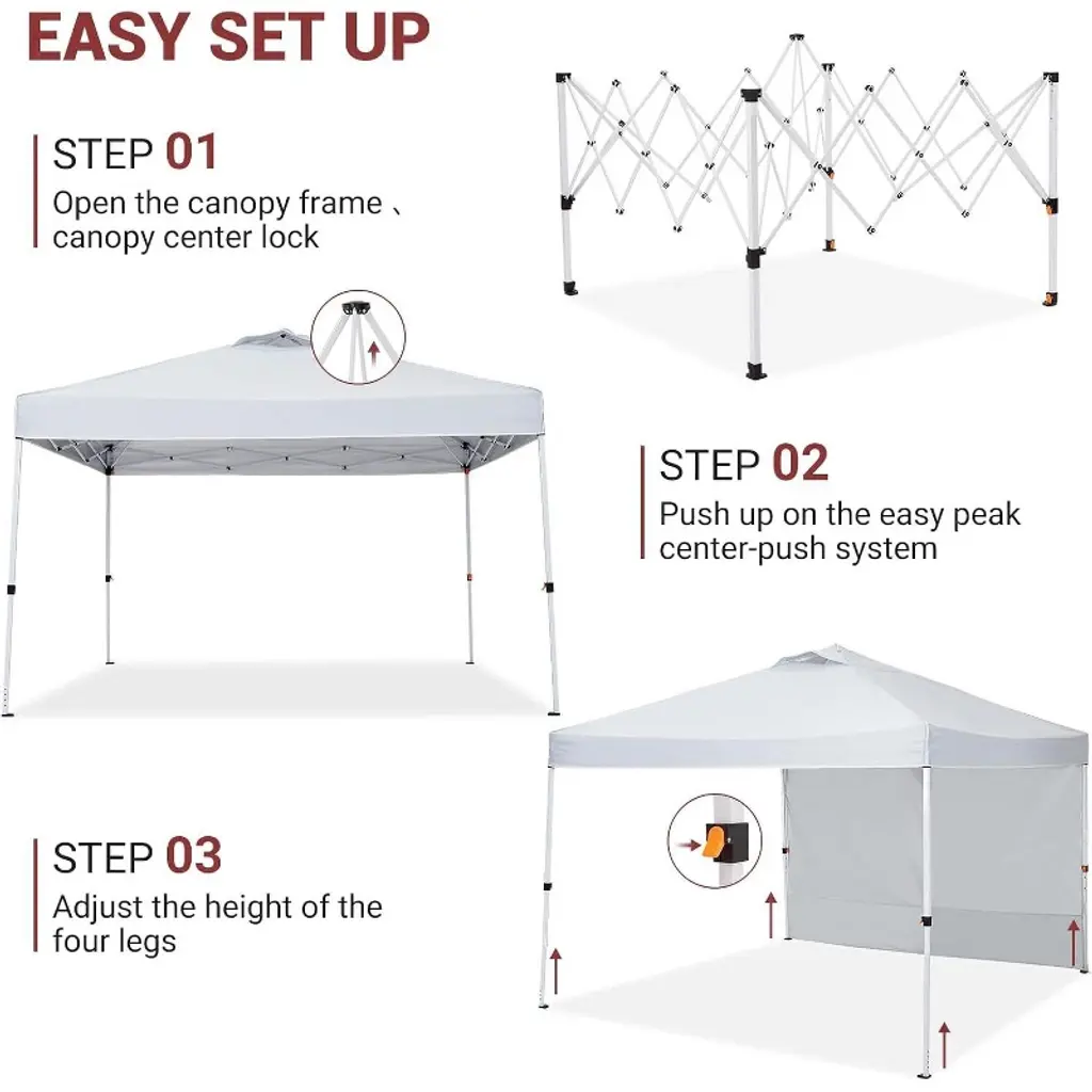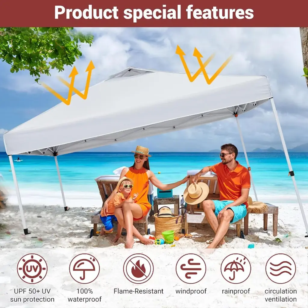 ONE-TO-ONE EASY SETUP: Our 10x10 pop-up awning tent features one-touch center-lock technology. With a simple push, the center hub locks the pole into place. Two people can set up in seconds without any tools. Three adjustable height settings with soft, pinch-free buttons ensure convenience and safety, perfect for camping, beach outings, craft fairs, tailgate parties, farmers markets, outdoor BBQs, and more. EASY STORAGE & CARRYING: Our no-lift system makes folding, storing, and transporting the 8x8 tent a breeze, and the lightweight canopy goes anywhere with the 600x300D wheeled tote, and the integrated wheels on the legs make the Pop-Up shelter tent easy to move even after it's set up, just lift the side without wheels, perfect for tailgate parties, the beach, the park, or anywhere you start having fun! RAIN AND SUN PROTECTION: The beach tent comes with UPF 50+ UV protection to ensure cooler and safer shade, this pop-up tent features a 150D Oxford cloth canopy top, waterproof and flame retardant (CPAI-84) material, integrated vents prevent wind and rain accumulation, reducing the risk of fabric tearing. ACCOMMODATES MULTIPLE PEOPLE AT ONCE: With a canopy area of 8' x 8', this tent provides 100 square feet of shade and can comfortably accommodate up to 7-8 people, turning any outdoor space into a cozy haven. Perfect for weddings, parties, camping, marketing events, or relaxing with friends over tea. PREMIUM STEEL FRAME: The pop-up canopy is designed for outdoor use, the corrosion-resistant steel trus frame comes with M-5 hardened through-bolt reinforcement components and nylon plastic connecting hardware, pre-assembled and can be installed without any tools, designed to support up to 120 pounds, perfect for long-term outdoor use at markets, festivals and exhibitions.