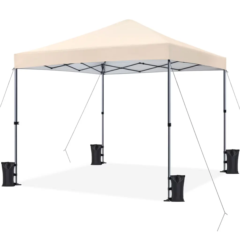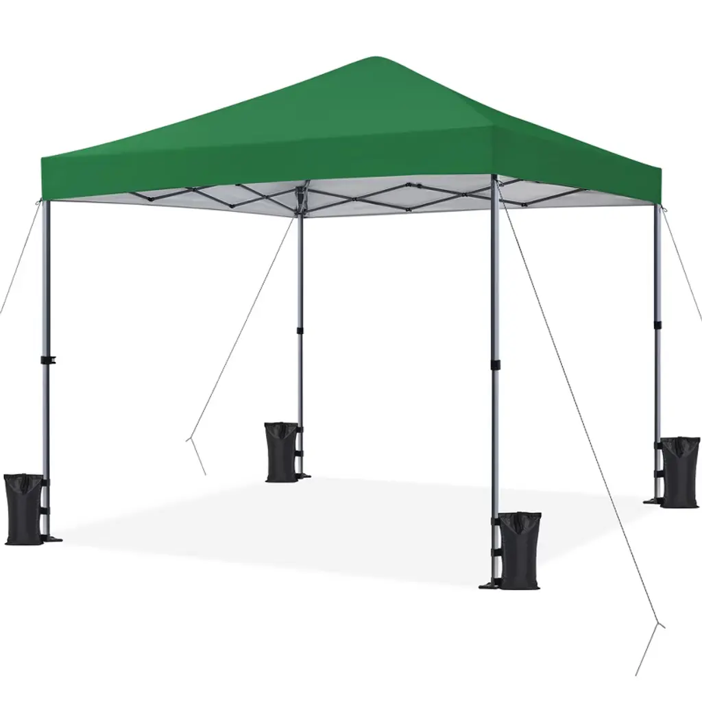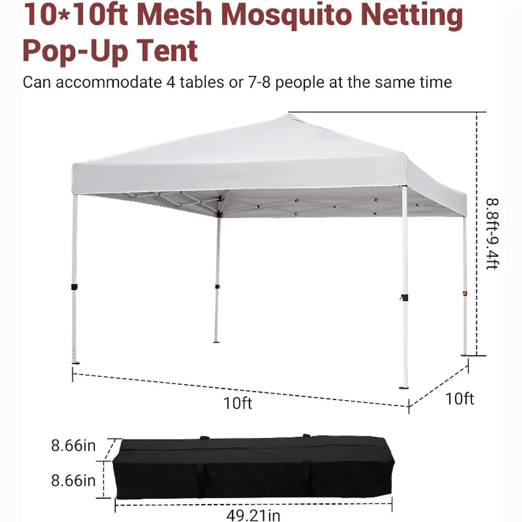 ONE-TO-ONE EASY SETUP: Our 10x10 pop-up awning tent features one-touch center-lock technology. With a simple push, the center hub locks the pole into place. Two people can set up in seconds without any tools. Three adjustable height settings with soft, pinch-free buttons ensure convenience and safety, perfect for camping, beach outings, craft fairs, tailgate parties, farmers markets, outdoor BBQs, and more. EASY STORAGE & CARRYING: Our no-lift system makes folding, storing, and transporting the 8x8 tent a breeze, and the lightweight canopy goes anywhere with the 600x300D wheeled tote, and the integrated wheels on the legs make the Pop-Up shelter tent easy to move even after it's set up, just lift the side without wheels, perfect for tailgate parties, the beach, the park, or anywhere you start having fun! RAIN AND SUN PROTECTION: The beach tent comes with UPF 50+ UV protection to ensure cooler and safer shade, this pop-up tent features a 150D Oxford cloth canopy top, waterproof and flame retardant (CPAI-84) material, integrated vents prevent wind and rain accumulation, reducing the risk of fabric tearing. ACCOMMODATES MULTIPLE PEOPLE AT ONCE: With a canopy area of 8' x 8', this tent provides 100 square feet of shade and can comfortably accommodate up to 7-8 people, turning any outdoor space into a cozy haven. Perfect for weddings, parties, camping, marketing events, or relaxing with friends over tea. PREMIUM STEEL FRAME: The pop-up canopy is designed for outdoor use, the corrosion-resistant steel trus frame comes with M-5 hardened through-bolt reinforcement components and nylon plastic connecting hardware, pre-assembled and can be installed without any tools, designed to support up to 120 pounds, perfect for long-term outdoor use at markets, festivals and exhibitions.