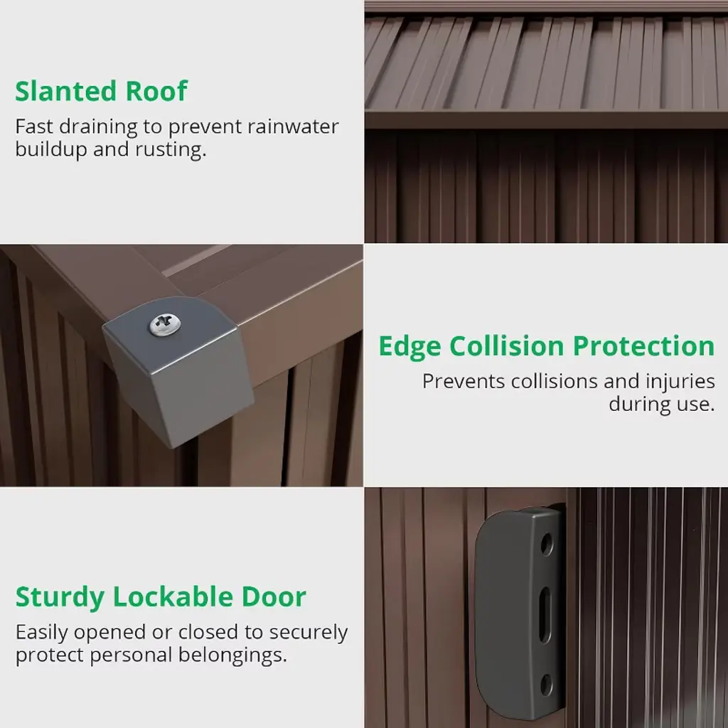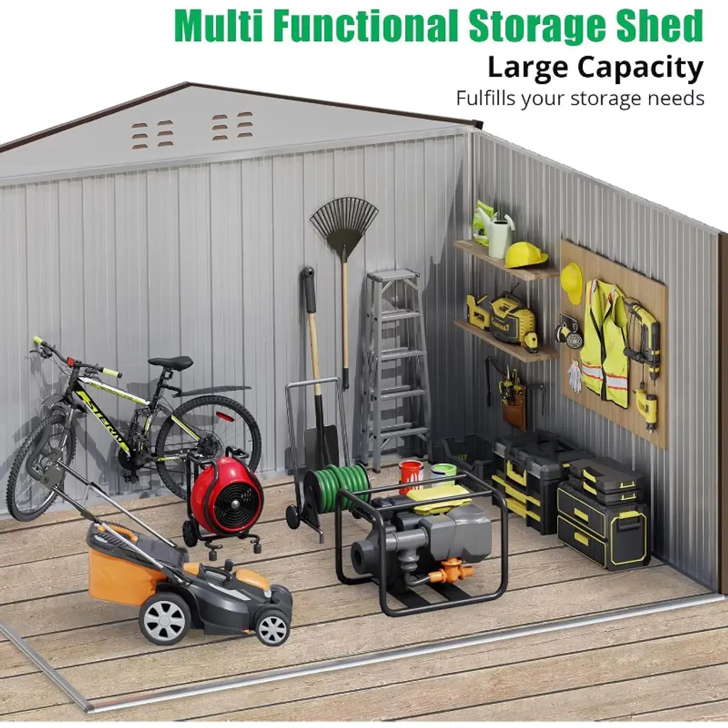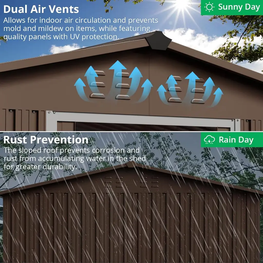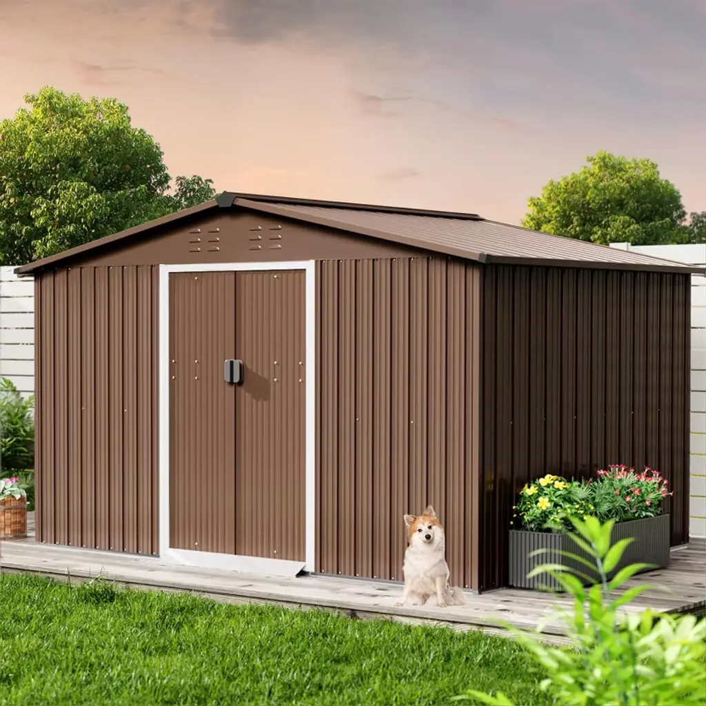 10x10ft Outdoor Waterproof Metal Storage Shed With Lockable Door And Vents, Large Garden Tool Shed For Tool Equipment Garbage Can Bike Mower, Brown