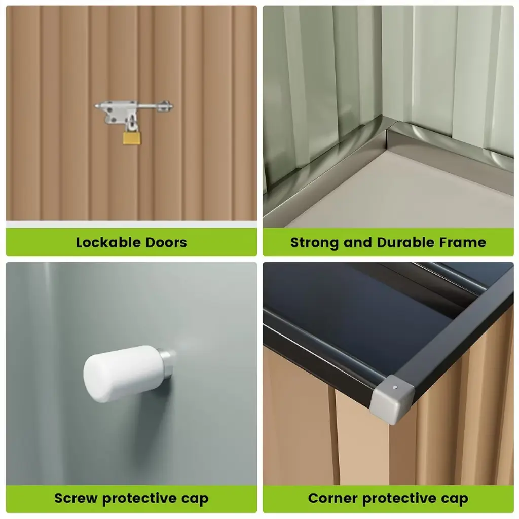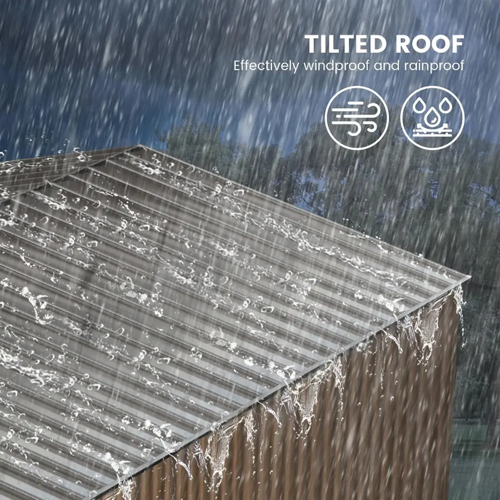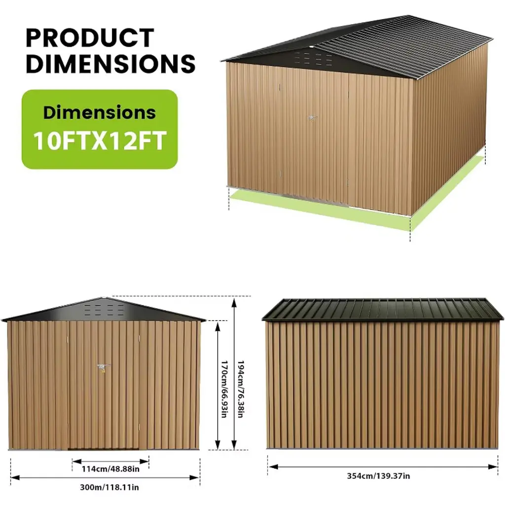 Product DescriptionKeep your backyard clutter-free and your tools secure with the Outdoor Storage Shed. Its spacious design and durable construction provide a reliable solution for organizing your outdoor essentials.Product Feature【Effortless Assembly & Maintenance】Simplified setup, minimal upkeep. Our sheds offer easy easy assembly and low maintenance, freeing up more time for you to enjoy.【Weather-Resistant Durability】Crafted for resilience. Weatherproof materials ensure your items stay safe and dry, Enduringthougn all seasons entortessly.【Unleash Spacious Storage】Step into a world of grand storage space. Our designs not only offer ample room for all your essentials but also blend in strength for lasting durability, Spacious living, Simplified.Product informationColor: Gray, BrownMaterial: Alloy SteelProduct Dimensions: 139.37"D x 118.11"W x 76.38"HItem Weight: 122.7 poundsWater Resistance Level: WaterproofDoor Style: Single Hinged, LockableAssembly Required: YesPackage List1 x Metal Storage Shed1 x User Manual