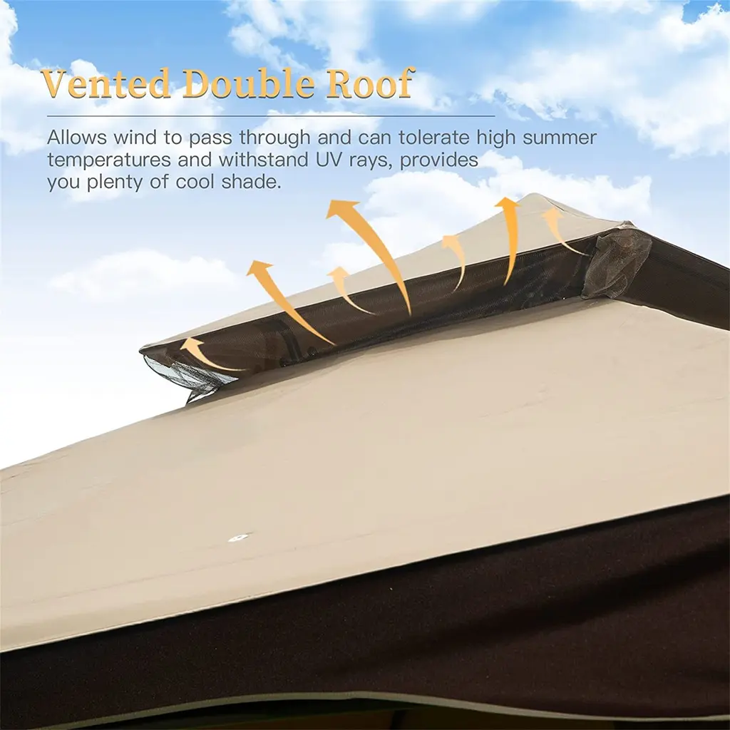 10'x13' Gazebo, Outdoor Gazebo With Mosquito Netting, Metal Frame Double Roof Soft Top Tent - Brown
