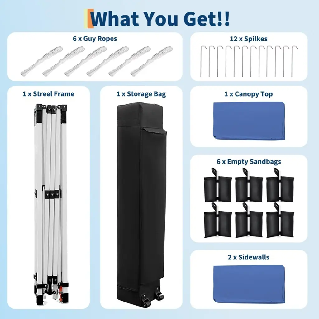 【Effortless Setup and Takedown】 This canopy can be set up or taken down in just a few minutes with the help of one or two people, all without the need for any tools. Simply remove the fully assembled frame and top from the bag, pull it open, drape the fabric over the frame, extend the legs, and you’re ready to go! ⏱️ 【Excellent Quality】 Constructed from 210D premium Oxford fabric and rust-resistant metal trusses, this pop-up canopy is both durable and provides protection against 98% of UV rays, ensuring you stay safe from the sun. ☀️ 【Easy to Store and Carry】 The 10x20ft pop-up canopy comes with a roller bag, making it easy to store while saving space and ensuring portability. Perfect for on-the-go use! ? 【Multifunctional Canopy】 The number of side walls can be adjusted to fit various usage scenarios. This 10x20 pop-up canopy is versatile and suitable for a wide range of activities, including camping, trade shows, picnics, gatherings, barbecues, sports events, arts and crafts, and other outdoor events. ? 【Packing List】 This canopy tent package includes: 1 steel frame, 1 canopy top, 4 guy ropes, 6 empty sandbags, 8 spikes, and 1 newly-designed storage wheel bag. If this 10x20 pop-up canopy does not meet your outdoor needs, we provide excellent after-sales service and are dedicated to addressing any issues or questions you may have. ?️