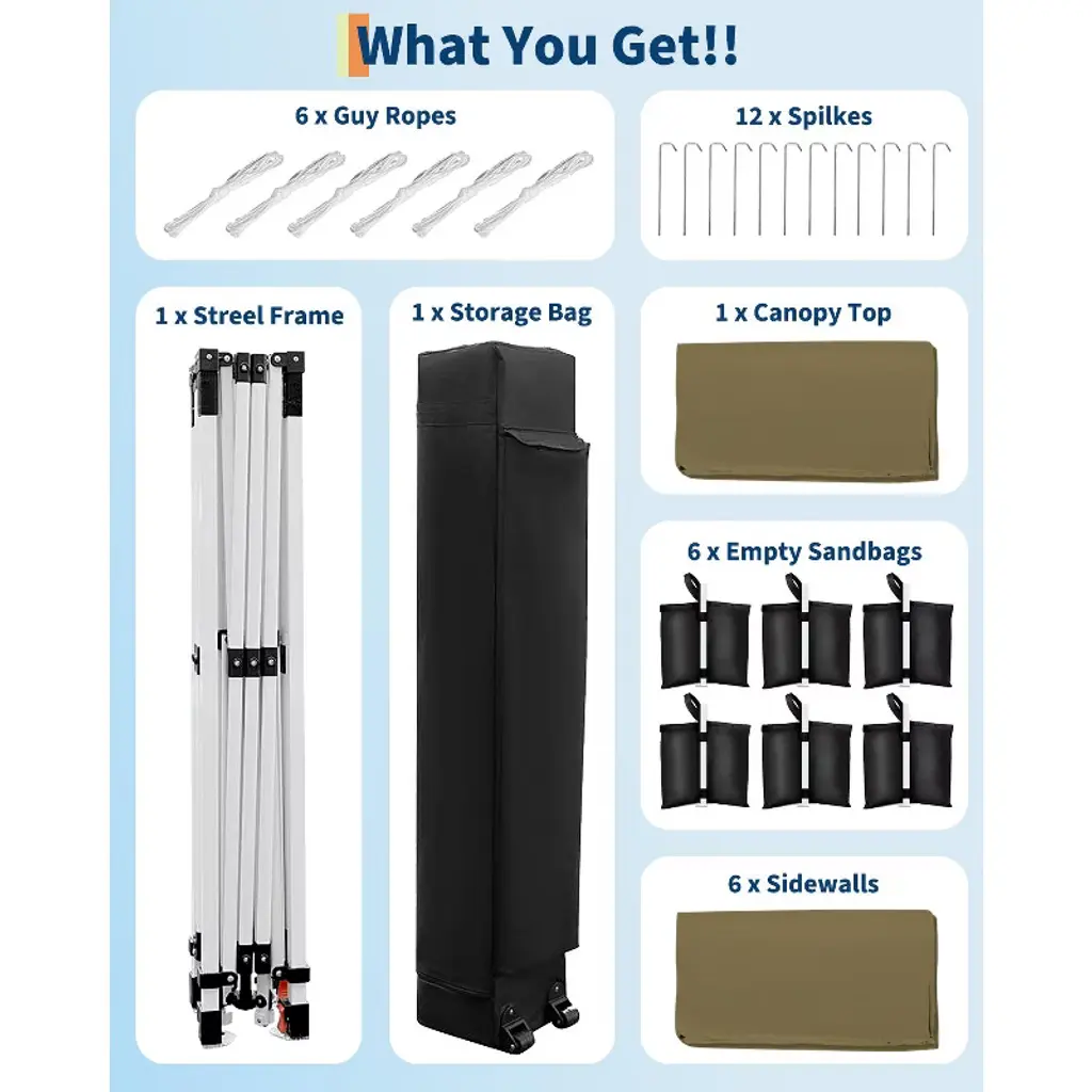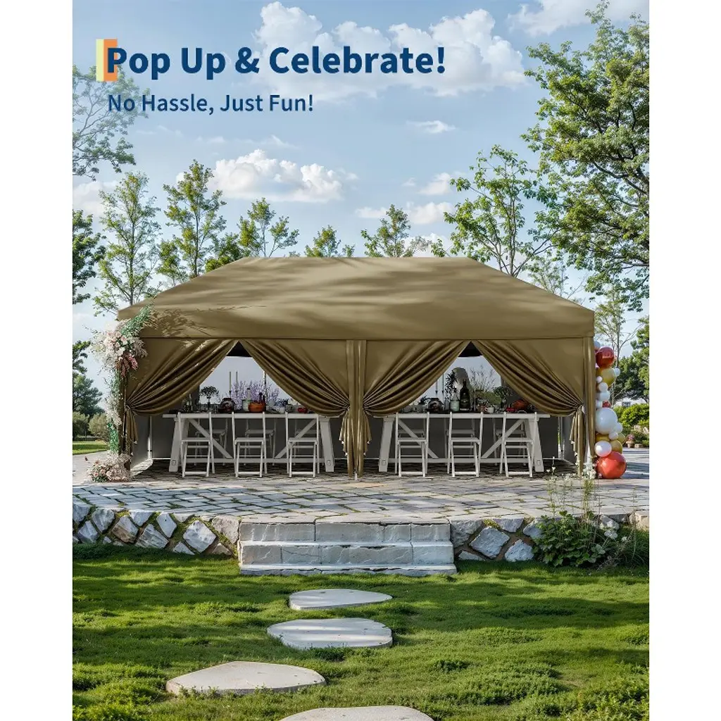 10x20 Ft Heavy-duty Pop-up Outdoor Canopy With 6 Walls, 3 Heights. Includes Bag, Weights, Stakes & Ropes,brown
