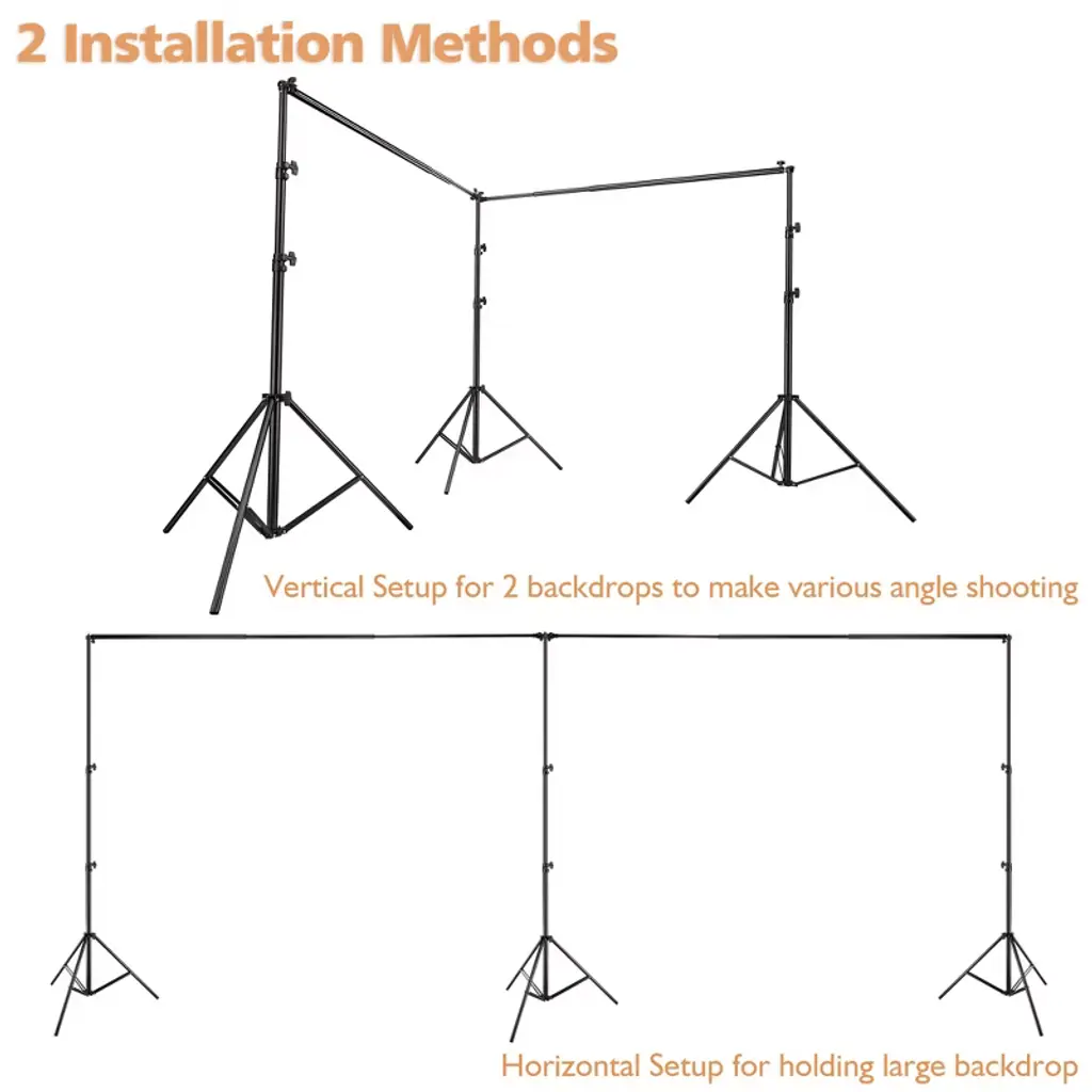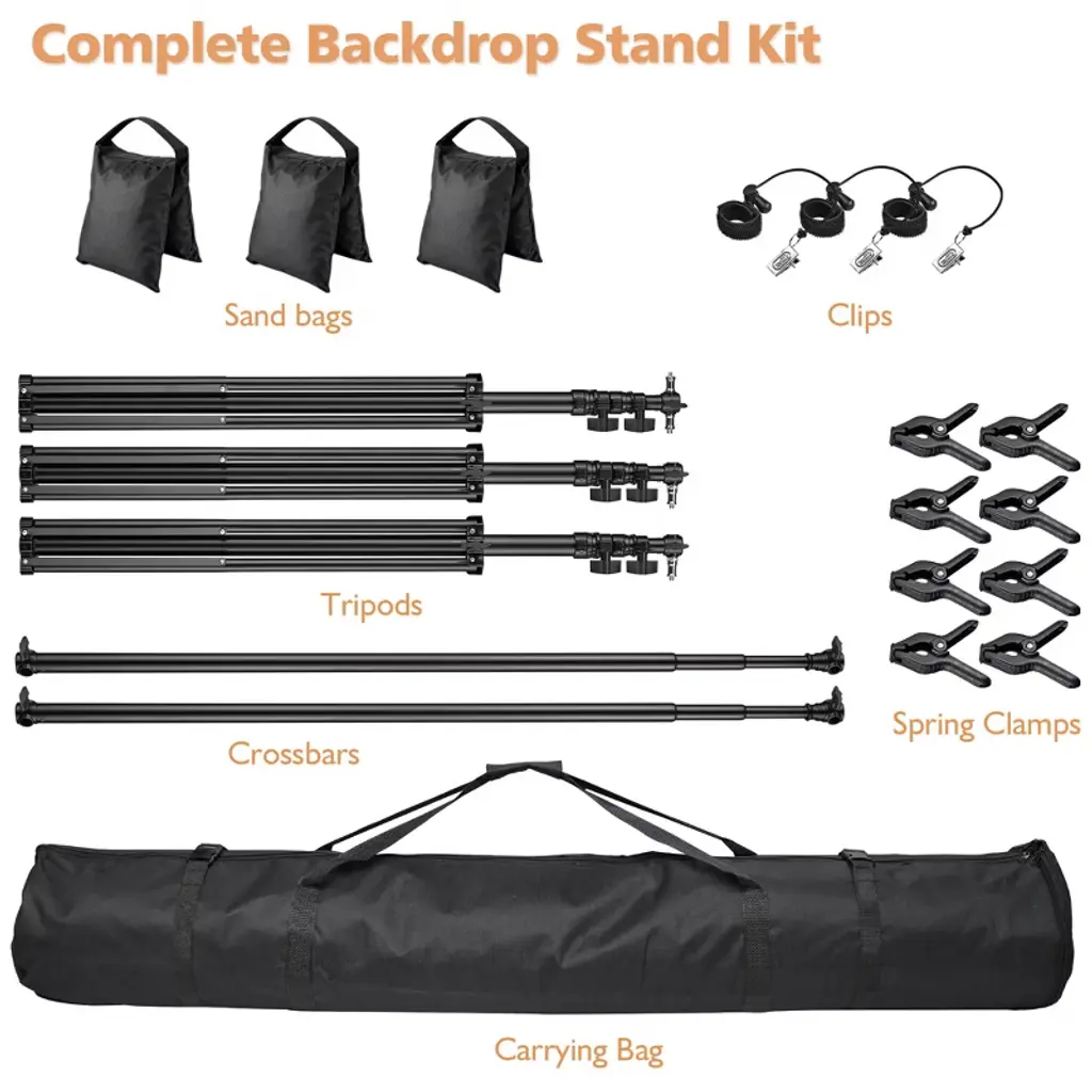Features: - 2-Way Installation - 10x20 Ft Backdrop Stand Kit features 2 installation methods including Horizontal Setup for holding large backdrop for full body or multi-person photography, and Right-angled Setup for creating 2 backgrounds, allowing you to shoot from more angles, ideal for studio photography, broadcasting, video shooting, weddings and events- Set Up in Minutes - Easy installation within a few minutes with no tools required, simply by extending the telescopic crossbar and adjusting the suitable height, then turning the knobs on the tripods to lock- Adjustable Width & Height - Features 2 width adjustable crossbars with a range between 8 1/2 to 20 1/3 ft, and the height adjustment range of the tripod is 4 to 10 1/3 ft to fit stages and studios of different sizes- Durable - Features aluminum tripods and crossbars for rust resistance and strong support, ideal for holding canvas, muslin, or paper backdrops; Comes with 3 sandbags to stabilize the stand, along with spring clamps and clips to securely fix the backdrop on the stand - Portable - Features a lightweight design with retractable crossbars and foldable tripods, along with a carry bag for easy storage and transportationSpecifications:- Max. Installed Dimension(LxWxH): 20 1/3 ft x 4 ft x 9 5/6 ft- Min. Installed Dimension(LxWxH): 8 1/2 ft x 4 ft x 4 ft- Extended Tripod Dimension(Dia.xH): 4 ft x 10 1/3 ft- Folded Tripod Dimension(Dia.xH): 4"" x 41 15/16""- Crossbar Adjustment Range: 8 1/2 to 20 1/3 ft- Carrying Bag Size(Dia.xH): 8 1/4"" x 45 1/4""- Crossbar Weight Capacity: 6.6 Lbs- Each Tripod Weight Capacity: 24.9 Lbs- Net Weight: 23.15 LbsPackage Contents:- 3x Tripods- 2x Crossbars- 1x Carrying Bag- 3x Sandbags- 8x Spring Clamps- 3x Clips- 1x ManualNotice: - Please note that the backdrops showing in the pictures are NOT included.