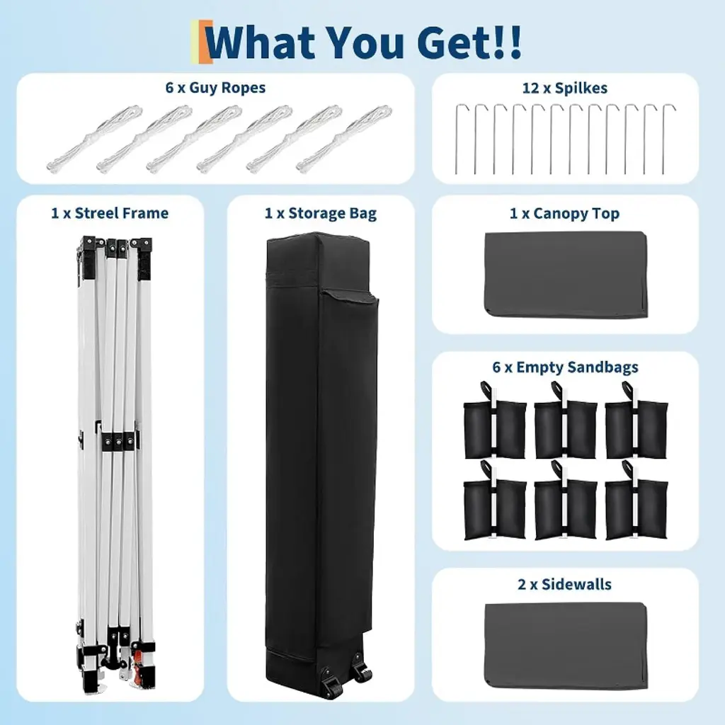 【Effortless Setup and Takedown】 This canopy can be set up or taken down in just a few minutes with the help of one or two people, all without the need for any tools. Simply remove the fully assembled frame and top from the bag, pull it open, drape the fabric over the frame, extend the legs, and you’re ready to go! ⏱️ 【Excellent Quality】 Constructed from 210D premium Oxford fabric and rust-resistant metal trusses, this pop-up canopy is both durable and provides protection against 98% of UV rays, ensuring you stay safe from the sun. ☀️ 【Easy to Store and Carry】 The 10x20ft pop-up canopy comes with a roller bag, making it easy to store while saving space and ensuring portability. Perfect for on-the-go use! ? 【Multifunctional Canopy】 The number of side walls can be adjusted to fit various usage scenarios. This 10x20 pop-up canopy is versatile and suitable for a wide range of activities, including camping, trade shows, picnics, gatherings, barbecues, sports events, arts and crafts, and other outdoor events. ? 【Packing List】 This canopy tent package includes: 1 steel frame, 1 canopy top, 4 guy ropes, 6 empty sandbags, 8 spikes, and 1 newly-designed storage wheel bag. If this 10x20 pop-up canopy does not meet your outdoor needs, we provide excellent after-sales service and are dedicated to addressing any issues or questions you may have. ?️