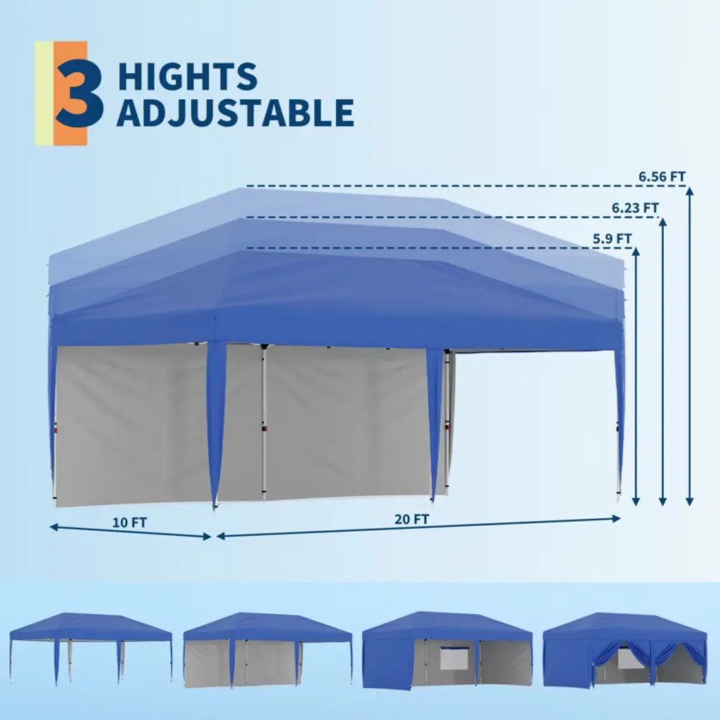 10x20 Heavy Duty Pop Up Canopy Tent W/roller Bag, 4 Weight Bags, 8 Stakes & 6 Guy Ropes - 3 Height Adjustable,blue