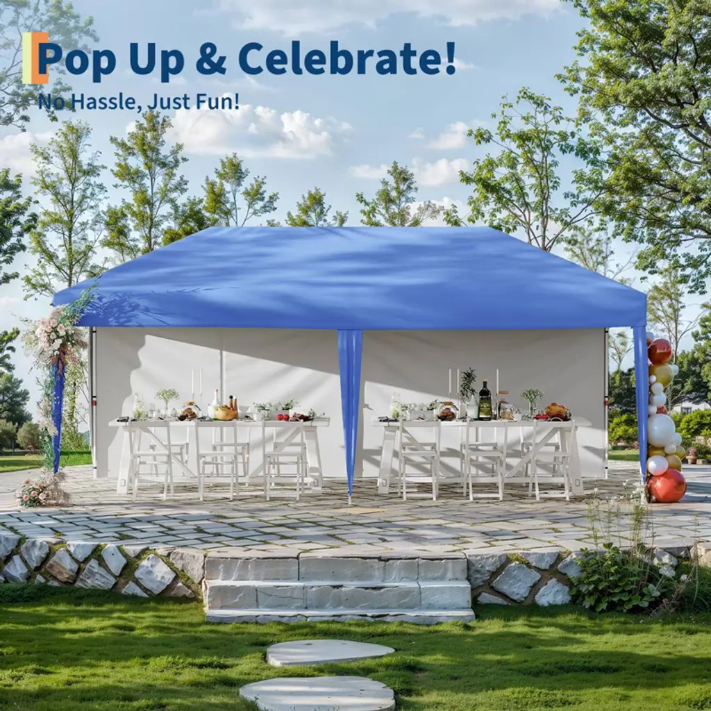 10x20ft Commercial Pop-Up Awning with Two Back Walls - Semi-Enclosed! Versatility at its best! This heavy-duty awning measures 3x6m (10x20ft) and includes two 210D Oxford fabric back walls for wind protection/privacy while keeping the sides open. Features a pre-assembled steel frame (installs in 5 minutes), waterproof PU coated roof (UPF 50+) and anti-lift ventilation system. Includes a sunshade bag with wheels and ground stakes. Ideal hybrid solution: ✅ Strategic back protection – protects equipment/crew ✅ Unobstructed access – opens on both sides for easy access ✅ Commercial grade construction – 210D corner reinforcements ✅ Multi-venue use – food trucks, loading docks, stages, camping ✅ Compact and portable – packs into a 52" wheeled suitcase Ideal for: Vendors, outdoor workstations, picnics, camping and other events that require rear privacy but don't require full enclosure.