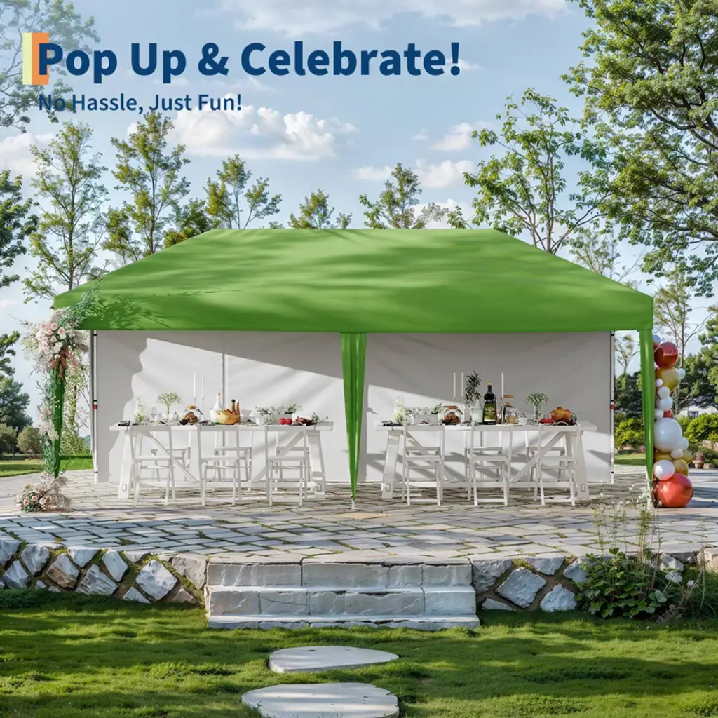 10x20ft Commercial Pop-Up Awning with Two Back Walls - Semi-Enclosed! Versatility at its best! This heavy-duty awning measures 3x6m (10x20ft) and includes two 210D Oxford fabric back walls for wind protection/privacy while keeping the sides open. Features a pre-assembled steel frame (installs in 5 minutes), waterproof PU coated roof (UPF 50+) and anti-lift ventilation system. Includes a sunshade bag with wheels and ground stakes. Ideal hybrid solution: ✅ Strategic back protection – protects equipment/crew ✅ Unobstructed access – opens on both sides for easy access ✅ Commercial grade construction – 210D corner reinforcements ✅ Multi-venue use – food trucks, loading docks, stages, camping ✅ Compact and portable – packs into a 52" wheeled suitcase Ideal for: Vendors, outdoor workstations, picnics, camping and other events that require rear privacy but don't require full enclosure.