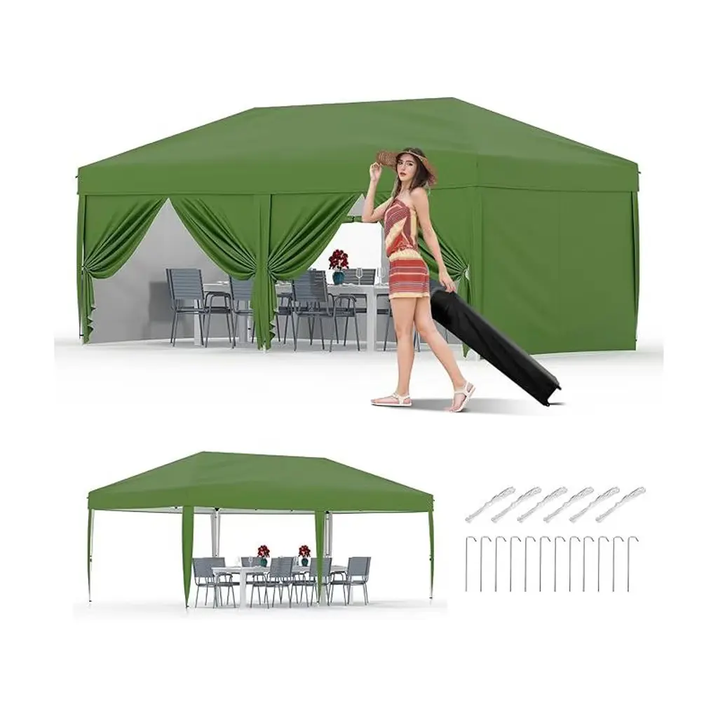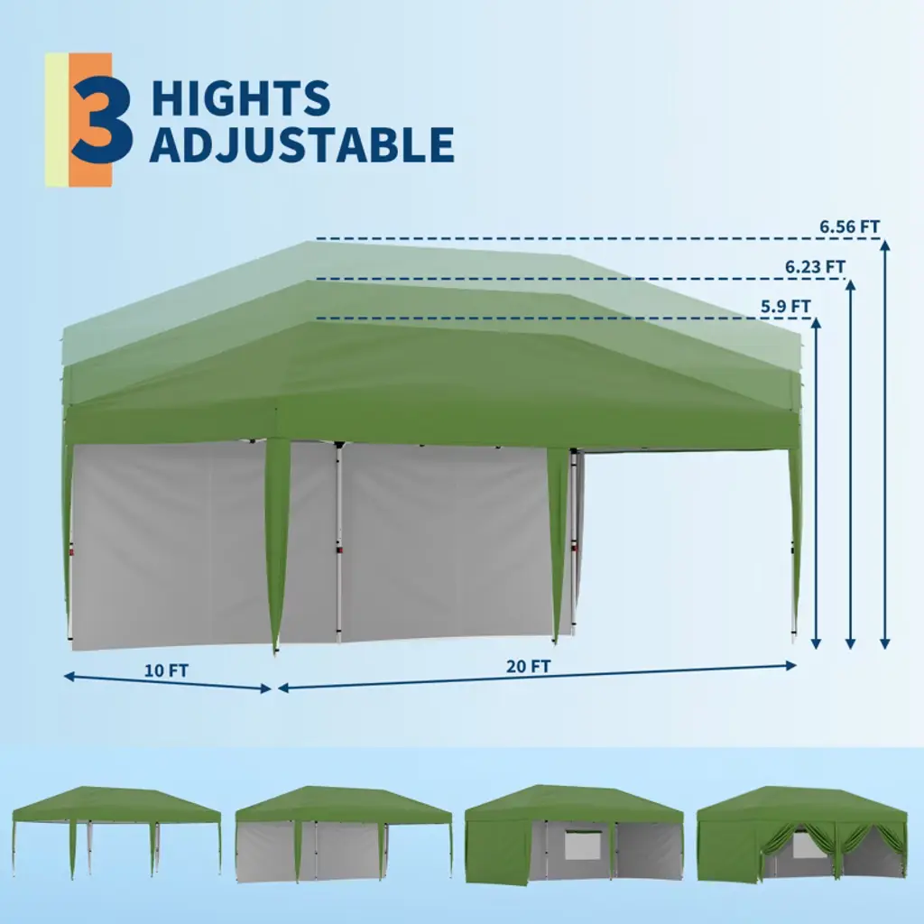 10x20 Heavy Duty Pop Up Canopy Tent W/roller Bag, 4 Weight Bags, 8 Stakes & 6 Guy Ropes - 3 Height Adjustable,green