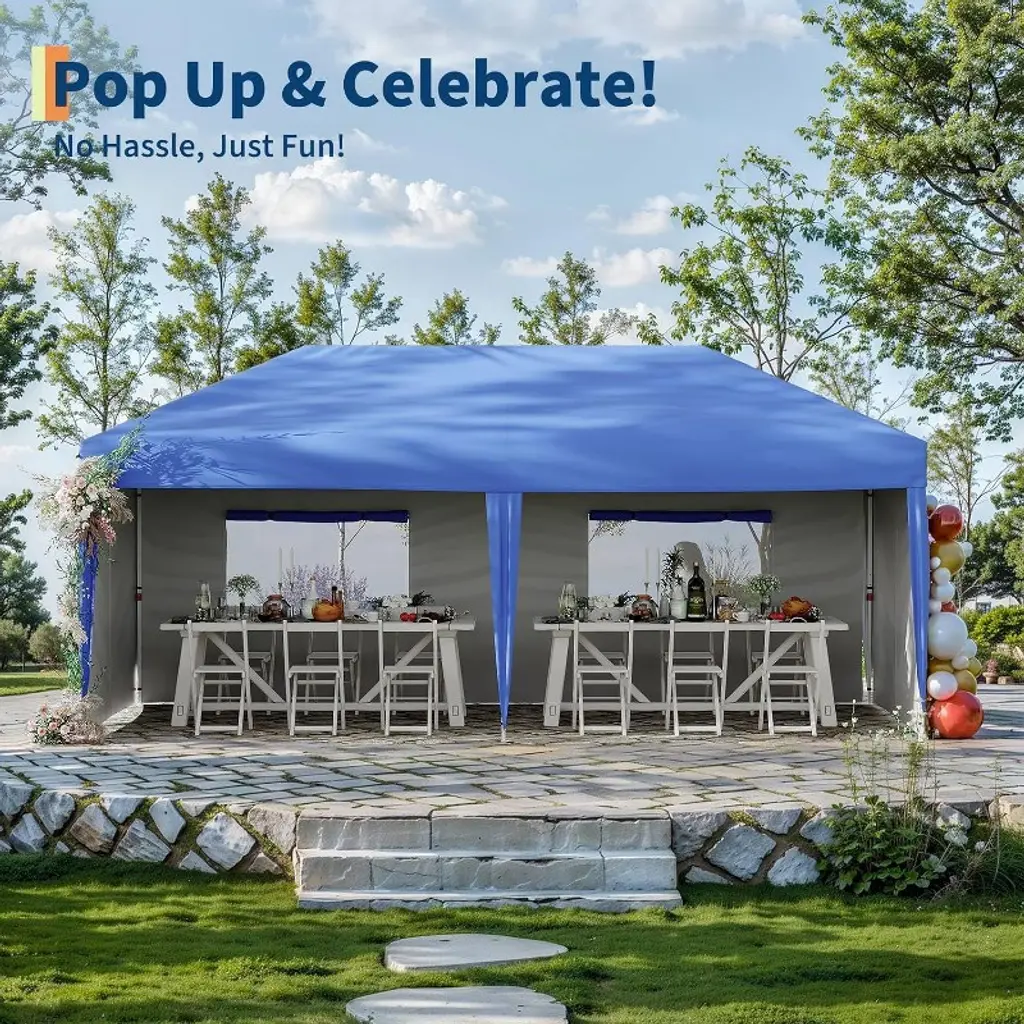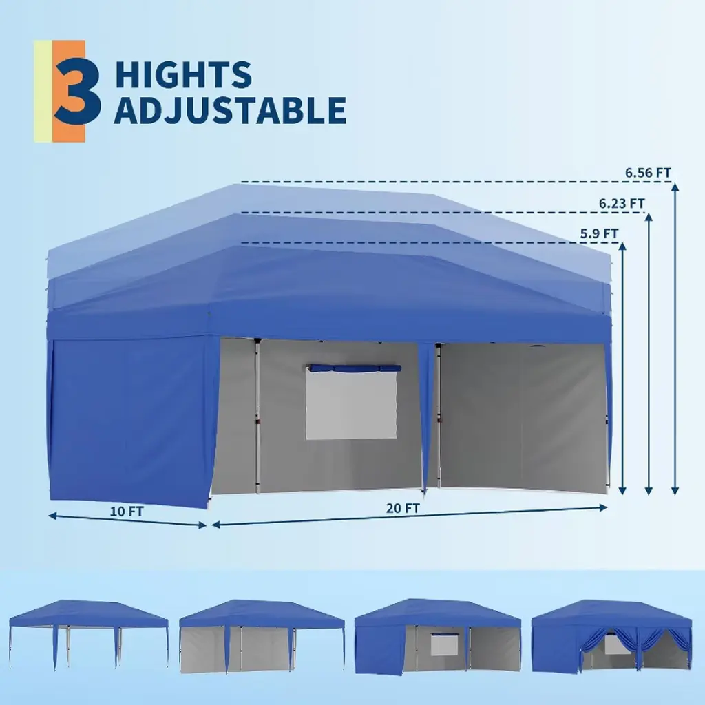 【Effortless Setup and Takedown】 This canopy can be set up or taken down in just a few minutes with the help of one or two people, all without the need for any tools. Simply remove the fully assembled frame and top from the bag, pull it open, drape the fabric over the frame, extend the legs, and you’re ready to go! ⏱️ 【Excellent Quality】 Constructed from 210D premium Oxford fabric and rust-resistant metal trusses, this pop-up canopy is both durable and offers protection against 98% of UV rays, ensuring you stay safe from the sun. ☀️ 【Easy to Store and Carry】 The 10x20ft pop-up canopy comes with a roller bag, making it easy to store while saving space and ensuring portability. Perfect for your outdoor adventures! ? 【Multifunctional Canopy】 The number of side walls can be adjusted to fit various usage scenarios. This 10x20 pop-up canopy is versatile and suitable for a wide range of activities, including camping, trade shows, picnics, gatherings, barbecues, sports events, arts and crafts, and other outdoor occasions. ? 【Packing List】 This canopy tent package includes: 1 steel frame 1 canopy top 4 guy ropes 6 empty sandbags 8 spikes 1 newly-designed storage wheel bag If this 10x20 pop-up canopy does not meet your outdoor needs, we provide excellent after-sales service and are dedicated to addressing any issues or questions you may have. ?️