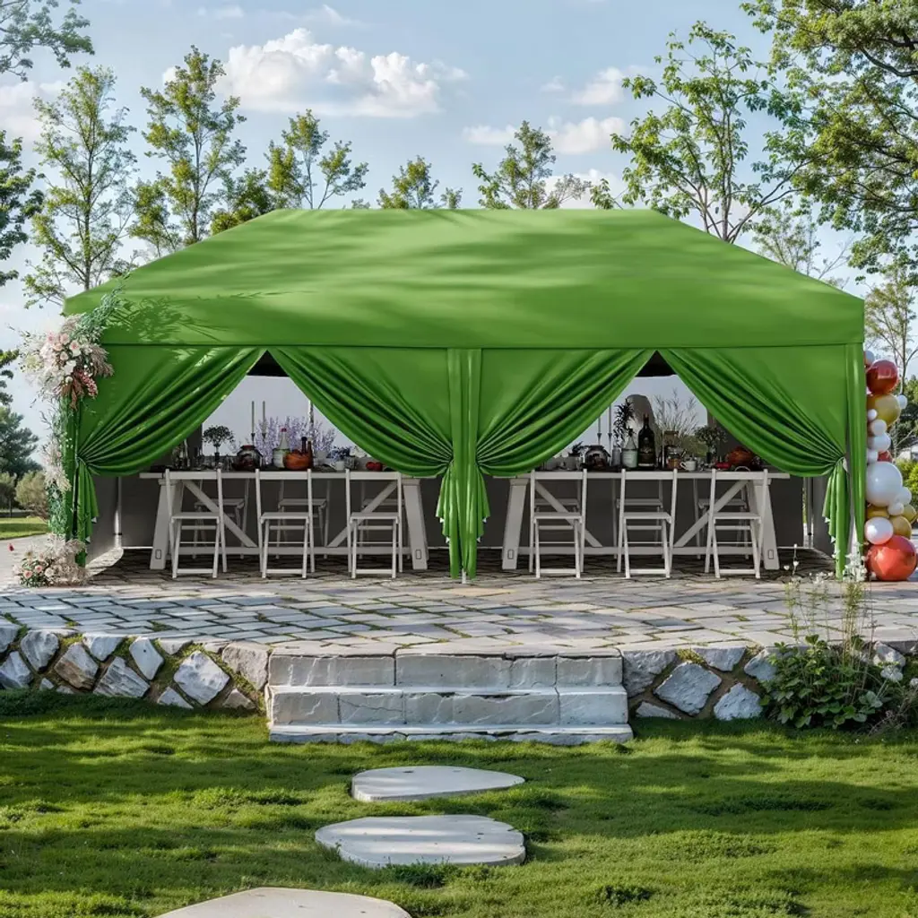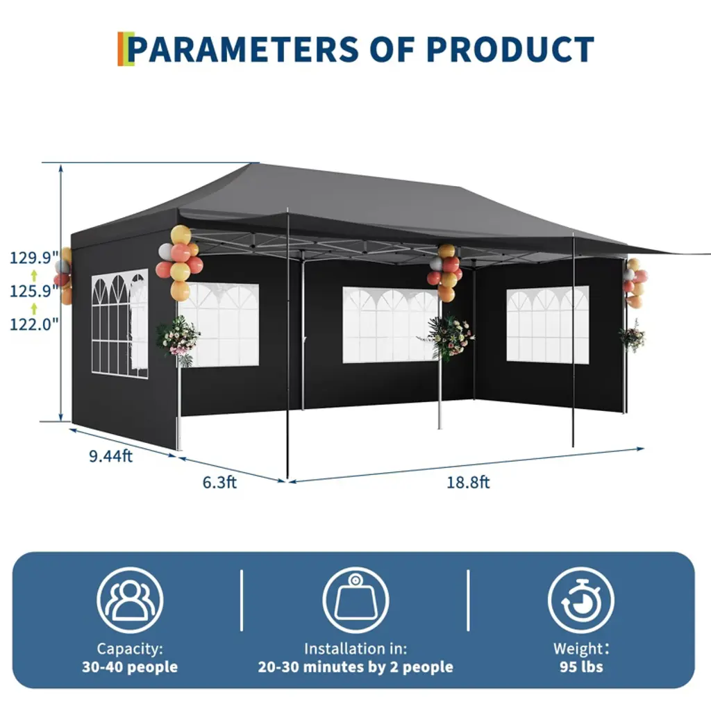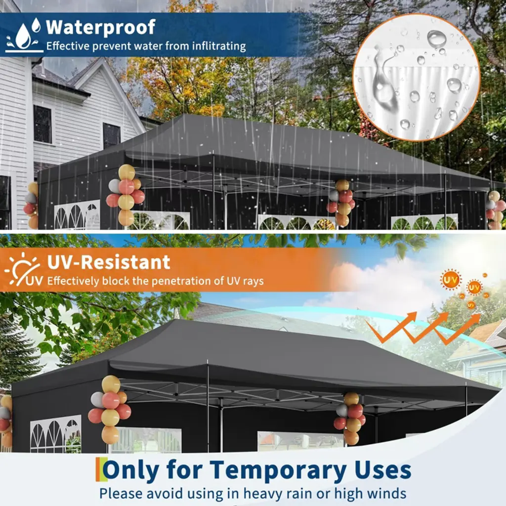 Professional-Grade Shelter for Large-Scale EventsThis industrial-strength 10x20 canopy tent delivers 314 sq ft of protected space - 40% larger than standard models - making it ideal for weddings, markets, and outdoor festivals. The upgraded 1.3" steel frame and 420D PU-coated fabric provide unmatched durability against wind, rain, and UV exposure.Key Features1. Expanded 314 sq ft Coverage - Fits 6 banquet tables or 40+ guests2. Military-Grade Fabric - 420D Oxford with PU3000mm waterproof + UPF50+3. 6 Removable Walls - Includes 4 clear windows + 1 zippered door4. 3 Height Adjustments - 122"/125"/129" ceiling options5. Pro Stabilization System - 6 sandbags + 18 stakes + 6 guy ropes6. Commercial Transport Bag - 600D Oxford wheeled caseTechnical Specifications Frame: 1.3" powder-coated steel (40% thicker than standard) Fabric: 420D Oxford (PU3000mm/UV50+) Wind Rating: Withstands 25mph winds when anchored Included: 6 sidewalls (4 windows + 1 door) 3 support poles Waterproof roller bag Full anchoring kit Why Event Pros Choose This Canopy? Larger Coverage - Extra 114 sq ft compared to standard 10x20 tents? Stronger Construction - Thicker frame tubes resist bending? Better Visibility - Clear windows maintain sightlines? Faster Setup - Pre-assembled truss systemPerfect for caterers, vendors, and wedding planners needing professional shelter that's easy to transport yet built to last.