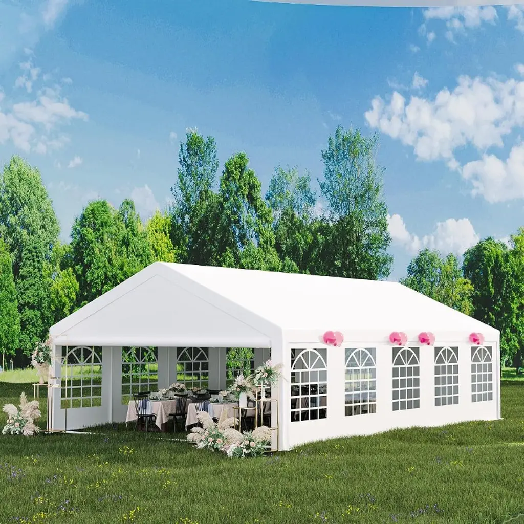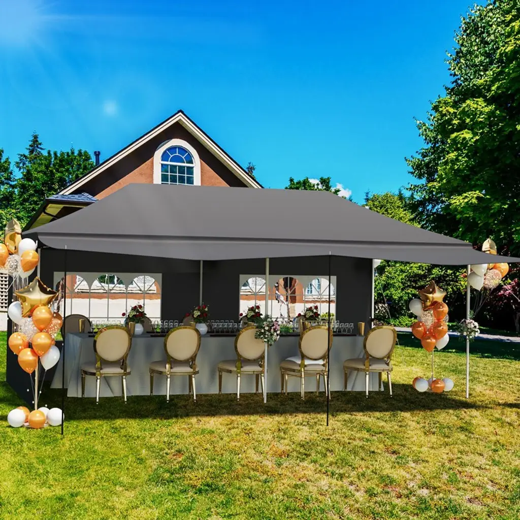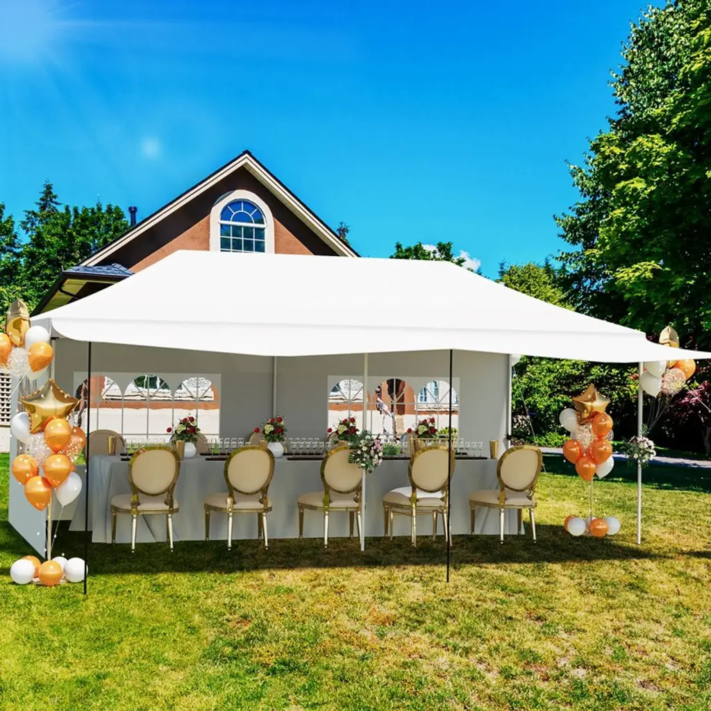 Professional-Grade Shelter for Large-Scale EventsThis industrial-strength 10x20 canopy tent delivers 314 sq ft of protected space - 40% larger than standard models - making it ideal for weddings, markets, and outdoor festivals. The upgraded 1.3" steel frame and 420D PU-coated fabric provide unmatched durability against wind, rain, and UV exposure.Key Features1. Expanded 314 sq ft Coverage - Fits 6 banquet tables or 40+ guests2. Military-Grade Fabric - 420D Oxford with PU3000mm waterproof + UPF50+3. 6 Removable Walls - Includes 4 clear windows + 1 zippered door4. 3 Height Adjustments - 122"/125"/129" ceiling options5. Pro Stabilization System - 6 sandbags + 18 stakes + 6 guy ropes6. Commercial Transport Bag - 600D Oxford wheeled caseTechnical Specifications Frame: 1.3" powder-coated steel (40% thicker than standard) Fabric: 420D Oxford (PU3000mm/UV50+) Wind Rating: Withstands 25mph winds when anchored Included: 6 sidewalls (4 windows + 1 door) 3 support poles Waterproof roller bag Full anchoring kit Why Event Pros Choose This Canopy? Larger Coverage - Extra 114 sq ft compared to standard 10x20 tents? Stronger Construction - Thicker frame tubes resist bending? Better Visibility - Clear windows maintain sightlines? Faster Setup - Pre-assembled truss systemPerfect for caterers, vendors, and wedding planners needing professional shelter that's easy to transport yet built to last.