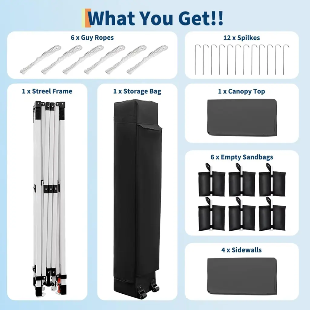 Enjoy effortless mobility and reliable outdoor shelter with this 10x20 Pop-Up Canopy Tent featuring a durable roller bag for compact storage and easy transport. Its collapsible frame fits comfortably in car trunks or SUV cargo areas, making it perfect for quick setups at picnics, music festivals, campsites, and more. Constructed with premium 210D Oxford fabric and rust-proof metal trusses, this pop-up canopy provides excellent UV protection (UPF 50+) while resisting wind, rain, fabric fraying, and corrosion. The reinforced frame ensures stable structural integrity through all seasons. Designed for instant shelter deployment, the tool-free assembly allows one or two people to set up the tent quickly by unpacking the frame, extending the legs, and securing the canopy in minutes. This rapid setup and collapse system is ideal for sudden weather changes or on-the-go adventures. Customize your coverage with adjustable sidewalls, tailoring protection for backyard cookouts, outdoor markets, vendor booths, or family reunions. Included sandbags, stakes, and guy ropes provide stable anchoring without bulky equipment, while three adjustable height settings adapt to wind conditions and varied gathering needs. This complete shelter system delivers a professional, all-weather-ready solution that easily transitions from tailgates to craft fairs. Dimensions: 10 ft x 20 ft footprint, adjustable height settings Material: 210D Oxford fabric with waterproof coating; rust-resistant metal frame What You Get: One 10x20 pop-up canopy tent, 4 removable sidewalls, roller bag, 8 stakes, 6 sandbags, 4 guy ropes, and assembly instructions After-Sales Service: Customer support available for setup assistance and product inquiries