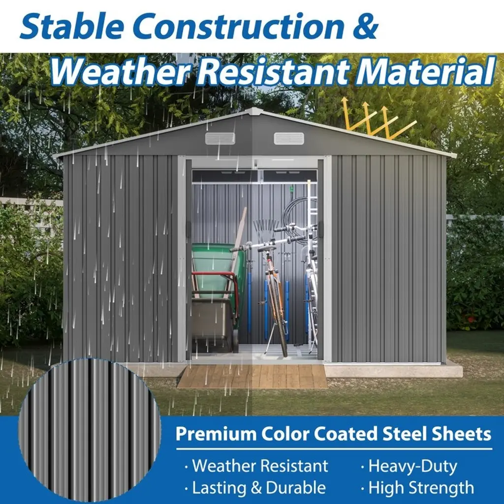 Product Features · Multi-Purpose Storage Shed This roomy 10 x 8 shed provides versatile storage, suitable for items like bikes, lawnmowers, ladders, and tools. It can also function as a cozy pet area or a practical garbage enclosure.· All-Weather Use This shed is built to endure any weather with its rust-resistant, UV-resistant galvanized steel construction. Its steep roof efficiently sheds rain and snow, while ventilation vents maintain airflow and prevent moisture buildup.· Sliding Doors and Padlock Pad-lockable sliding doors for easy entry and exit.· Stay Organized Outdoors This backyard shed keeps your yard, basement, or garage clutter-free by providing extra space to hide waste and large equipment. Everything you need will be well-organized and easily accessible.· Easy to Setup Equipped with clear assembly instructions, this garden shed is recommended for installation by 1-2 people. All parts included in your package come pre-numbered. The pre-cut and pre-drilled panels simplify the assembly. NOTE: This storage shed is sent in 2 packages for shipping convenience.Assembled Length (in.): 119.56Assembled Width (in.): 97.24Assembled Height (in.): 76.10Weight (lbs.): 202.00Notes:Assembly RequiredThis product will ship to you in multiple boxes.Disclaimers & Disclosures:Contact US:After-sales Email Address: dhalcomb@doorise.comIf the item comes with any defect, damage(include damaged in transit) or missing partsand, please contact us with detailed images for free replacement or refund.