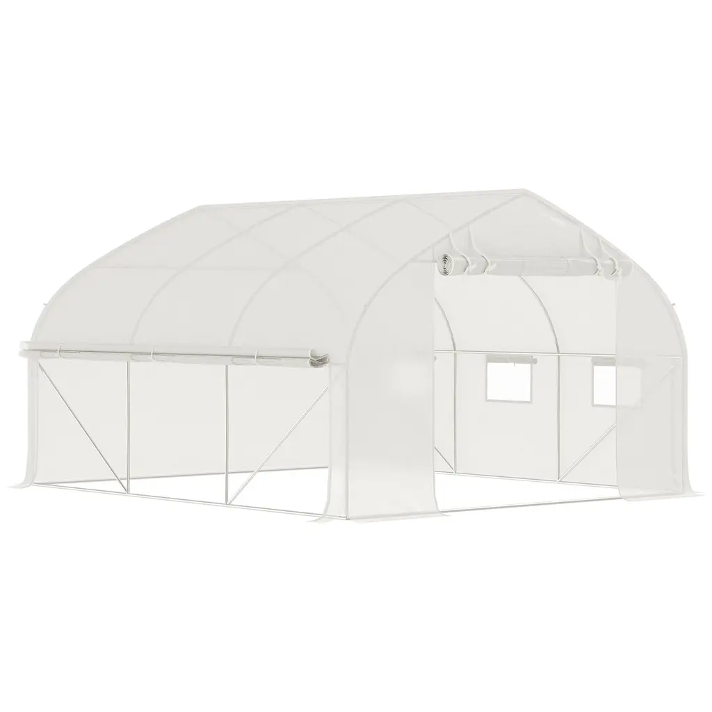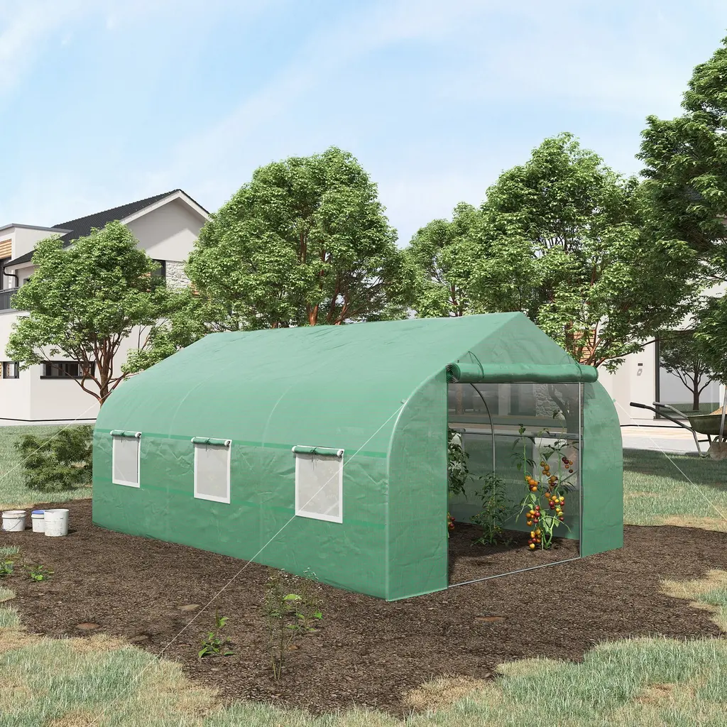 Bring your fruits, vegetables, herbs, and flowers together into a safe and temperate space with our outdoor greenhouse. Extend the growing season, shielding plants from extreme temperatures. Use our greenhouse as your own personal plant nursery or grow tropical; it's all up to you.Our greenhouses are constructed of solid steel with a galvanized finish to resist chipping and peeling. They also have four slant bracing tubes, a front crossbar, and middle-reinforced tubes to help overall stability.Our greenhouse protects plants from wind, rain, and cold with a 140 GSM PE cover, a material that lets in 85% of nourishing sunlight without the worry of UV scorching. Featuring a tear-resistant reinforcement grid, our greenhouse is outdoor-ready. Attach the cover to the frame by making use of the included tethers and tape. Ventilate your outdoor greenhouse without letting in unwanted winged things with net-protected doors and windows. With a net-protected door, you can get in and out without worrying about your plants. Open either and reach optimal heat and humidity at two speeds.Easily anchor our large greenhouse to the soil with the four included spiral stakes and tie it down with the ropes. NOTE: To prolong the life of your greenhouse tent, please take it down before inclement weather (windy, rainy, snowy, hail, etc.)