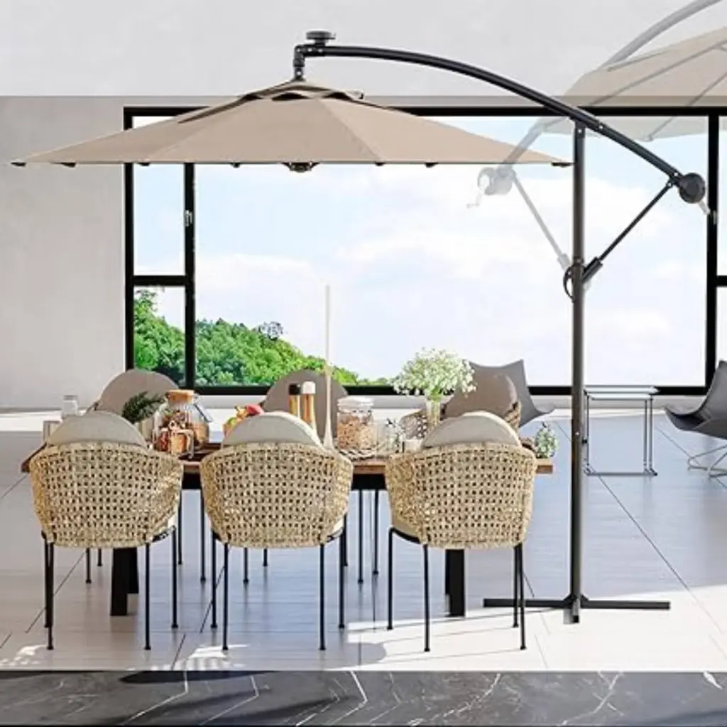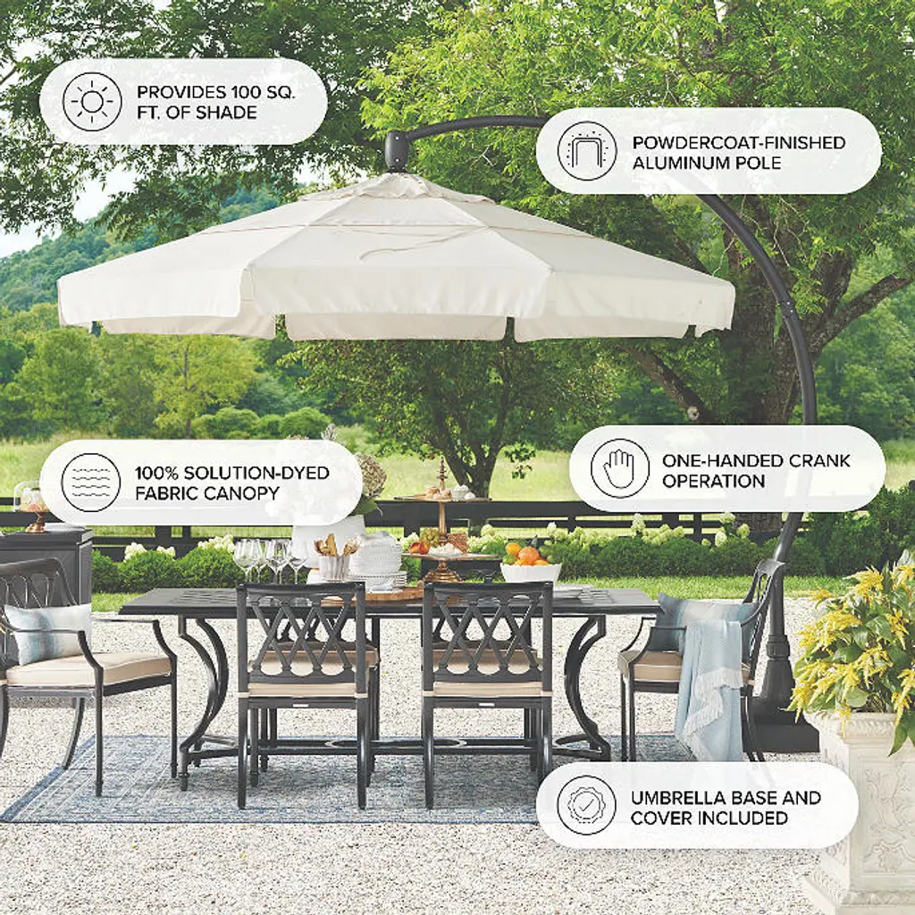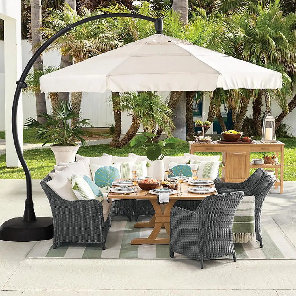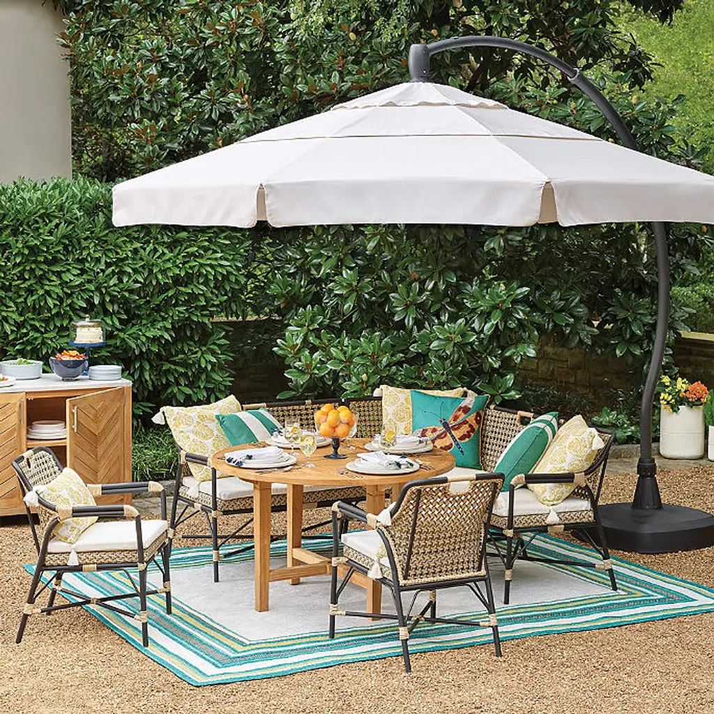 From dawn to dusk, the Side-mount Umbrella blocks the sun's glare as it moves across the sky, virtually shading you from all angles of the sun. This resort-quality, cantilever umbrella easily tilts and pivots 360° around the base, requiring no maintenance. 11' dia. cantilever design provides 100 sq. ft. of shade at virtually any angleLightweight yet sturdy powdercoat-finished, 2-3/4" dia. aluminum poleOne-handed crank operation glides the umbrella up and into a horizontal or angled positionDouble-vented, marine-grade canopy is made of 100% solution-dyed polyester to resist the damaging effects of sun, mildew, and dirtCanopy is machine washable; air dry onlySpot clean canopy with warm water (no higher than 100°F) and a mild natural soap; rinse thoroughly to remove soap and air dryBase lends solid, wind-defying support when filled with water and sand (water and sand not included)Always close umbrella when not in use and in inclement weather Umbrella becomes a tipping hazard at 20 MPH and will tip over starting around 25MPH Bases should be filled with sand-water mixture or p-gravel (not included). For cold climates where temperatures drop below 32 degrees, DO NOT add water. Use a minimum 5 bags of sand. Basic umbrella cover included Imported Assembly required At Frontgate, our primary focus is quality. We guarantee that every product we sell will stand up to the supreme test – our customers' satisfaction. To learn more about our policies, visit our Shipping & Processing, Returns & Exchanges and Warranty & Price Guarantee pages.