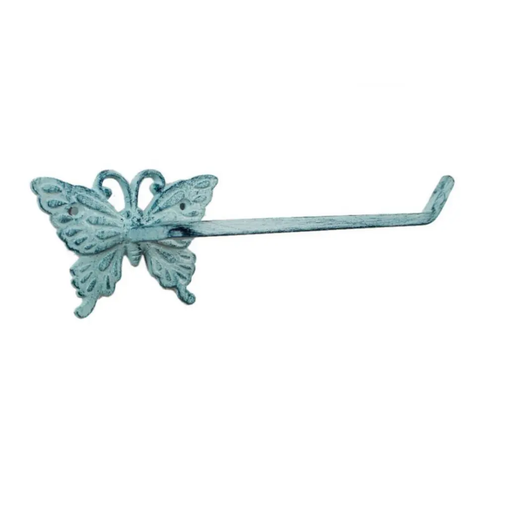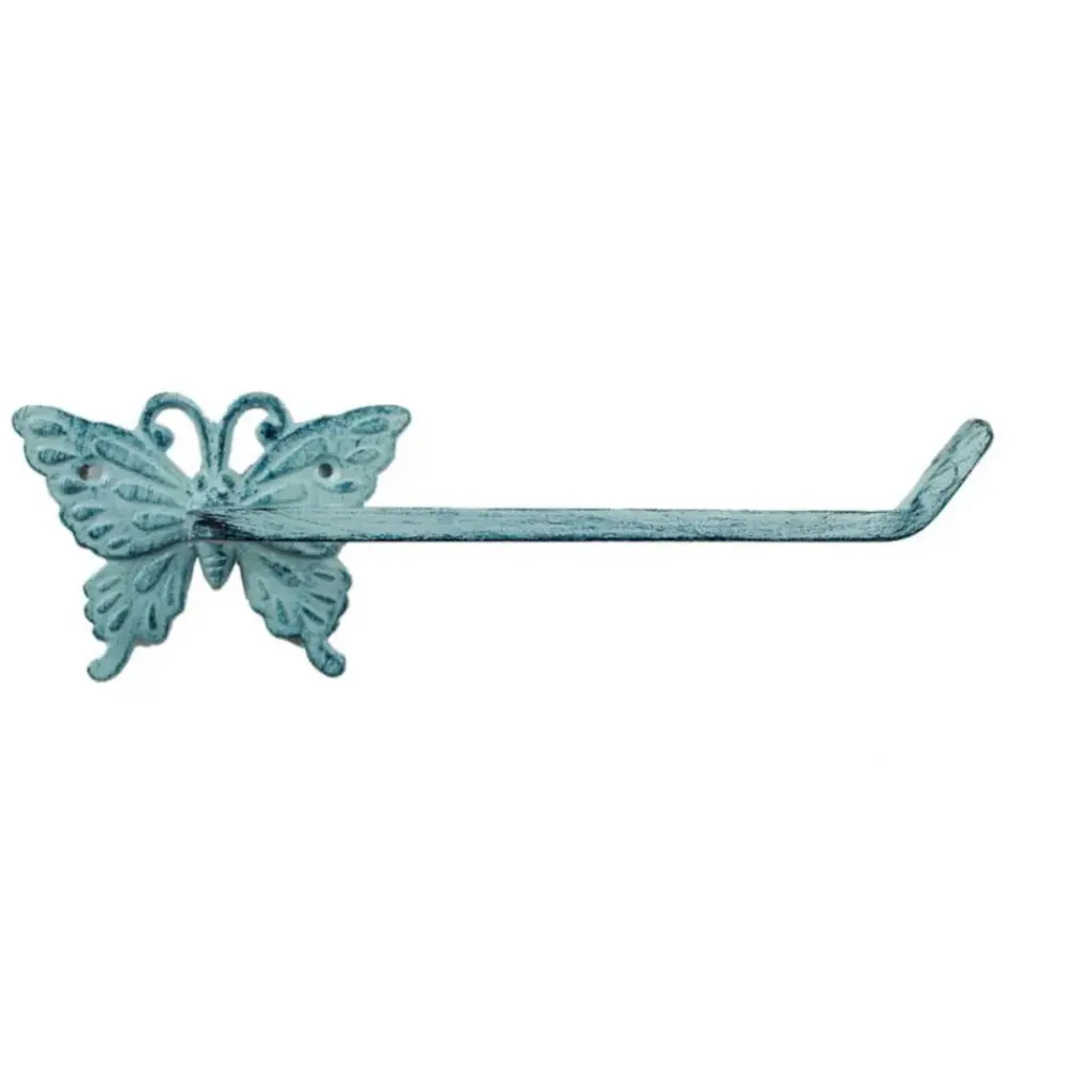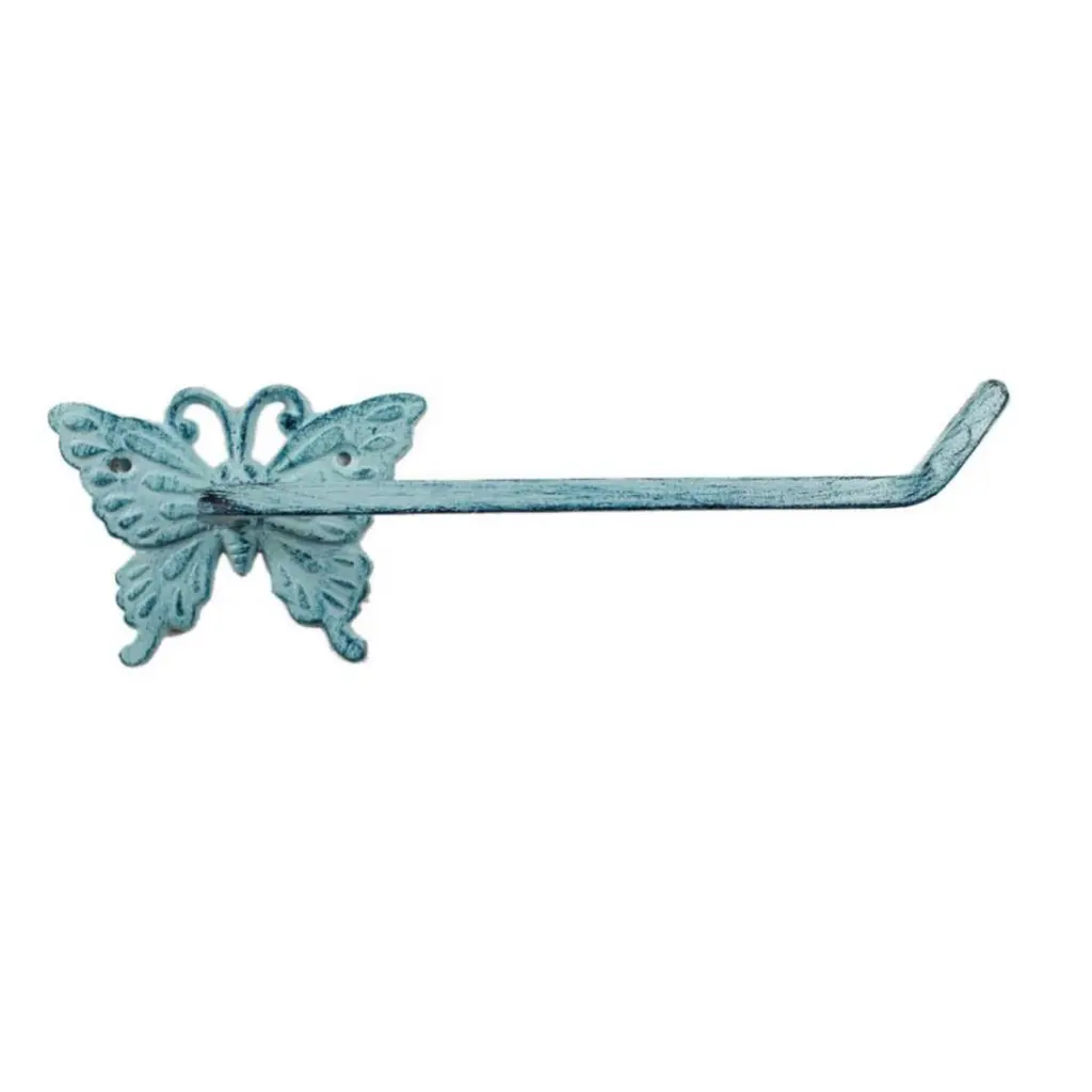 Specification: Description: Add a touch of charm and functionality to your bathroom with this Dark Blue / Brown Cast Iron Butterfly Toilet Paper Holder. Measuring 11" L x 3" W x 3" H, this unique holder is crafted from durable cast iron, offering a solid and sturdy design that will stand the test of time. Its exquisite butterfly motif brings a garden-inspired look to any space, making it not just a practical accessory, but also a decorative piece that will impress guests. Perfect for hanging toilet paper, this functional and decorative holder is easy to mount, though screws are not included. Bring a magical touch to your home with this handcrafted, heavy-duty toilet paper holder that blends style with purpose.
