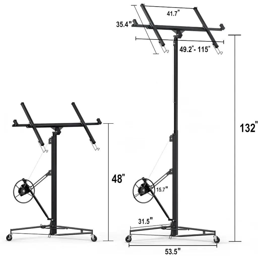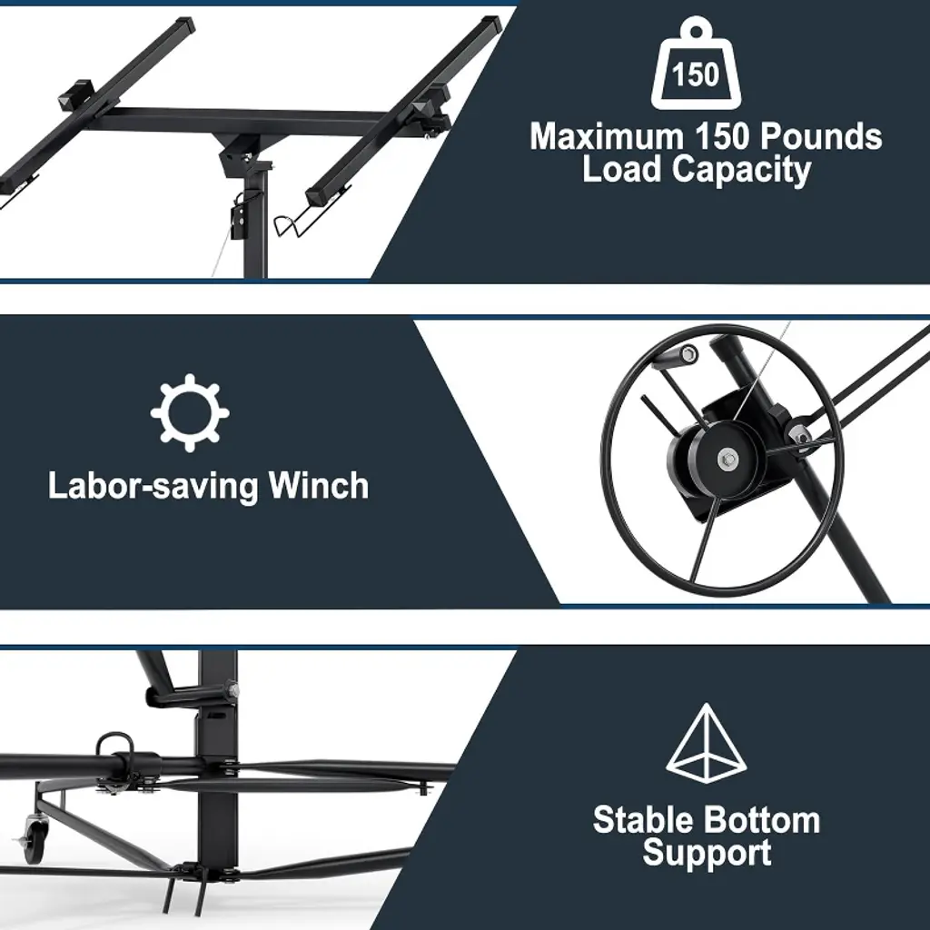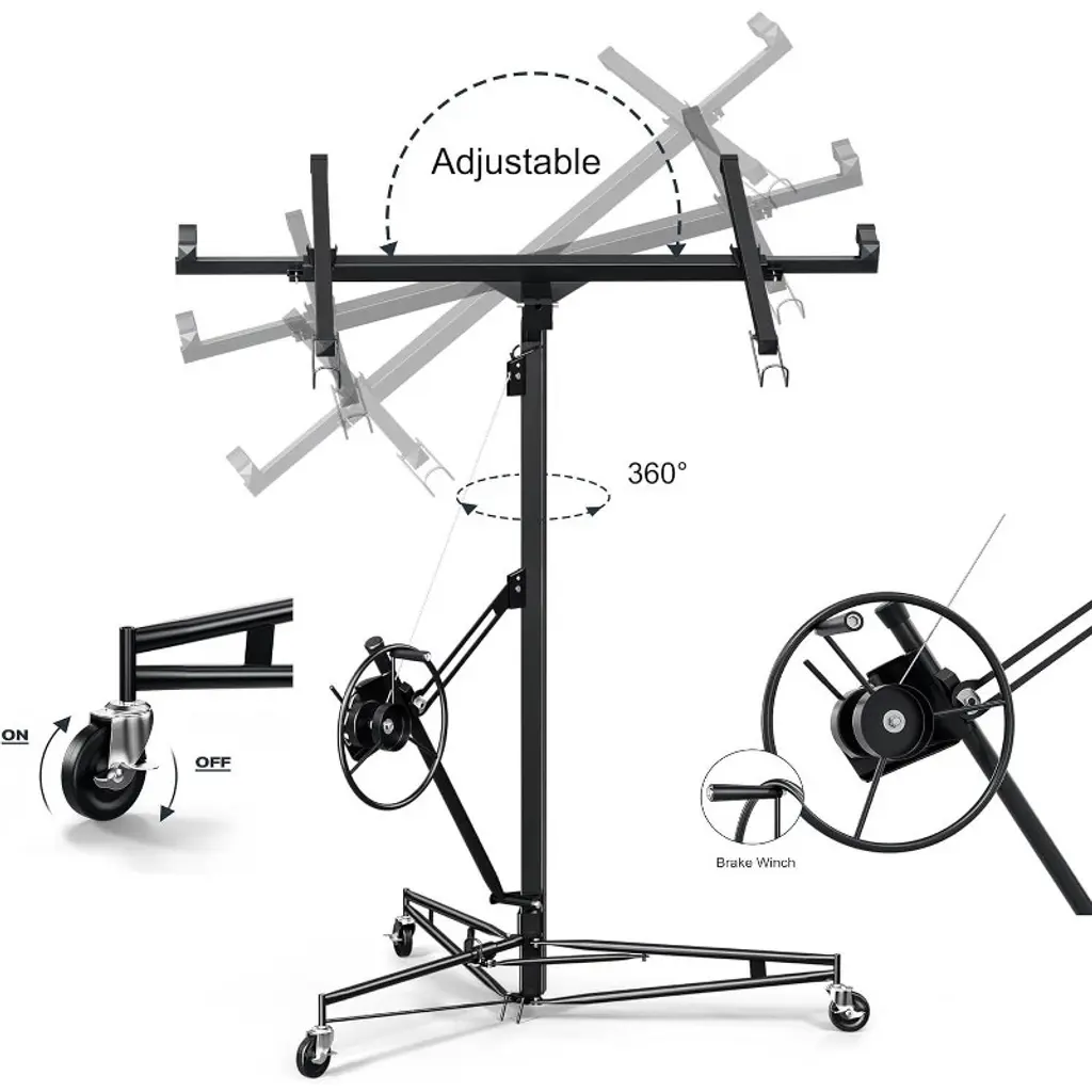 150 LBS Capacity Drywall Hoist:This drywall lift is constructed from durable steel,Can load 150 capacity drywall hoist. It features a built-in winch and braking system that ensures smooth and controlled lifting of drywall panels. The triangular base structure enhances stability, preventing wobbling or tilting during operation.