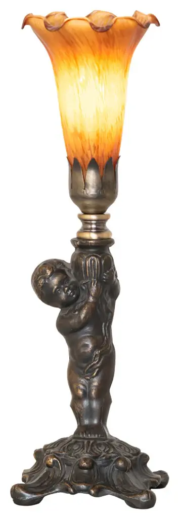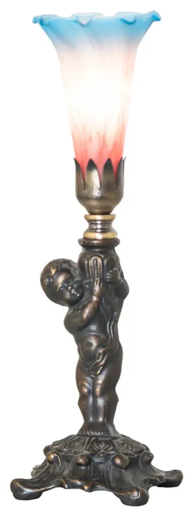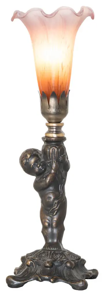 Recreating the famous Tiffany design from the early 1900s. This accent lamp features a stunning shade that is mouth blown of Pink Favrile-styled art glass. The Pond Lily shade is embraced by an elegant Twin Cherubs figurine cast metal base finished by hand in Antique Brass. The lamp design is perfect for homes and restaurants from Corona; Queens and Laurel Hollow; Long Island; New York; to Winter Park; Florida; to Chicago; Illinois. The Tiffany Pond Lily Mini Lamp is included in our American-designed; handcrafted Favrile Glass Collection. UL and cUL listed for dry locations. Each shade is a unique work of art with color variations based on natural ingredients inherent in the glass.