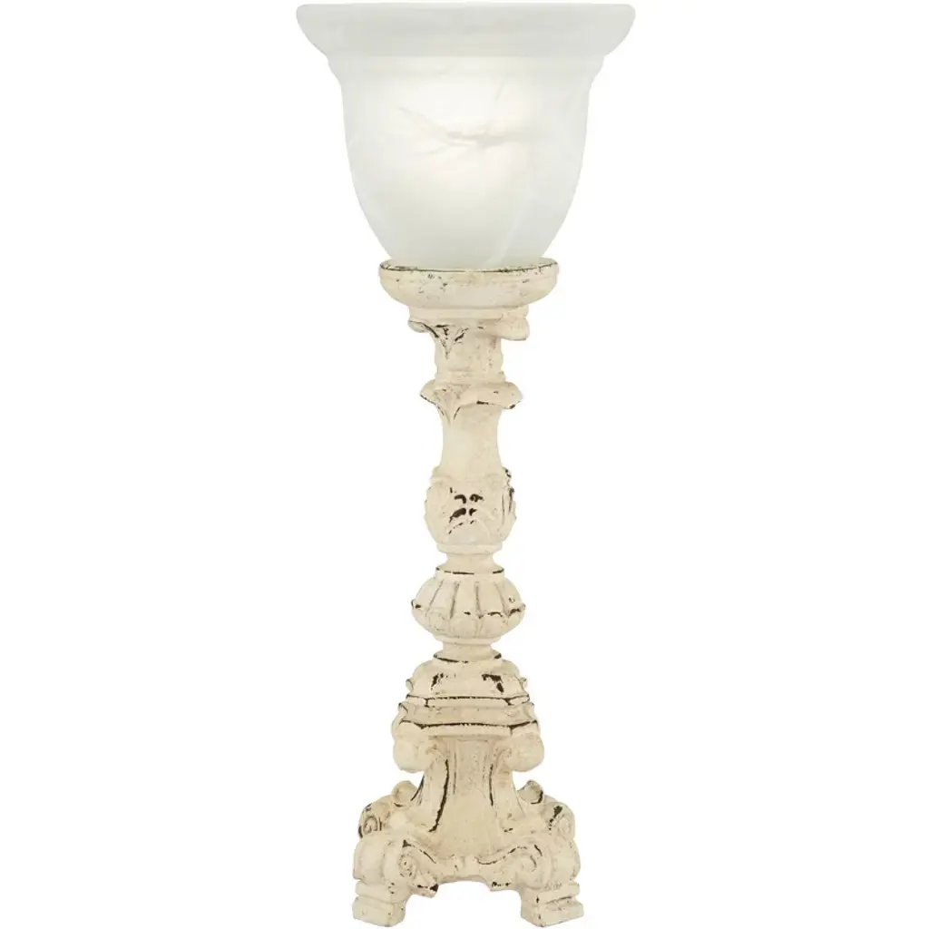 Recreating the famous Tiffany design from the early 1900s. This accent lamp features a stunning shade that is mouth blown of White Favrile-styled art glass. The Pond Lily shade is embraced by an elegant Twin Cherubs figurine cast metal base finished by hand in Antique Brass. Perfect for homes and restaurants from Corona; Queens and Laurel Hollow; Long Island; New York; to Winter Park; Florida; to Chicago; Illinois. The Tiffany Pond Lily Mini Lamp is included in our American-designed; handcrafted Favrile Glass Collection. UL and cUL listed for dry locations. Each shade is a unique work of art with color variations based on natural ingredients inherent in the glass.