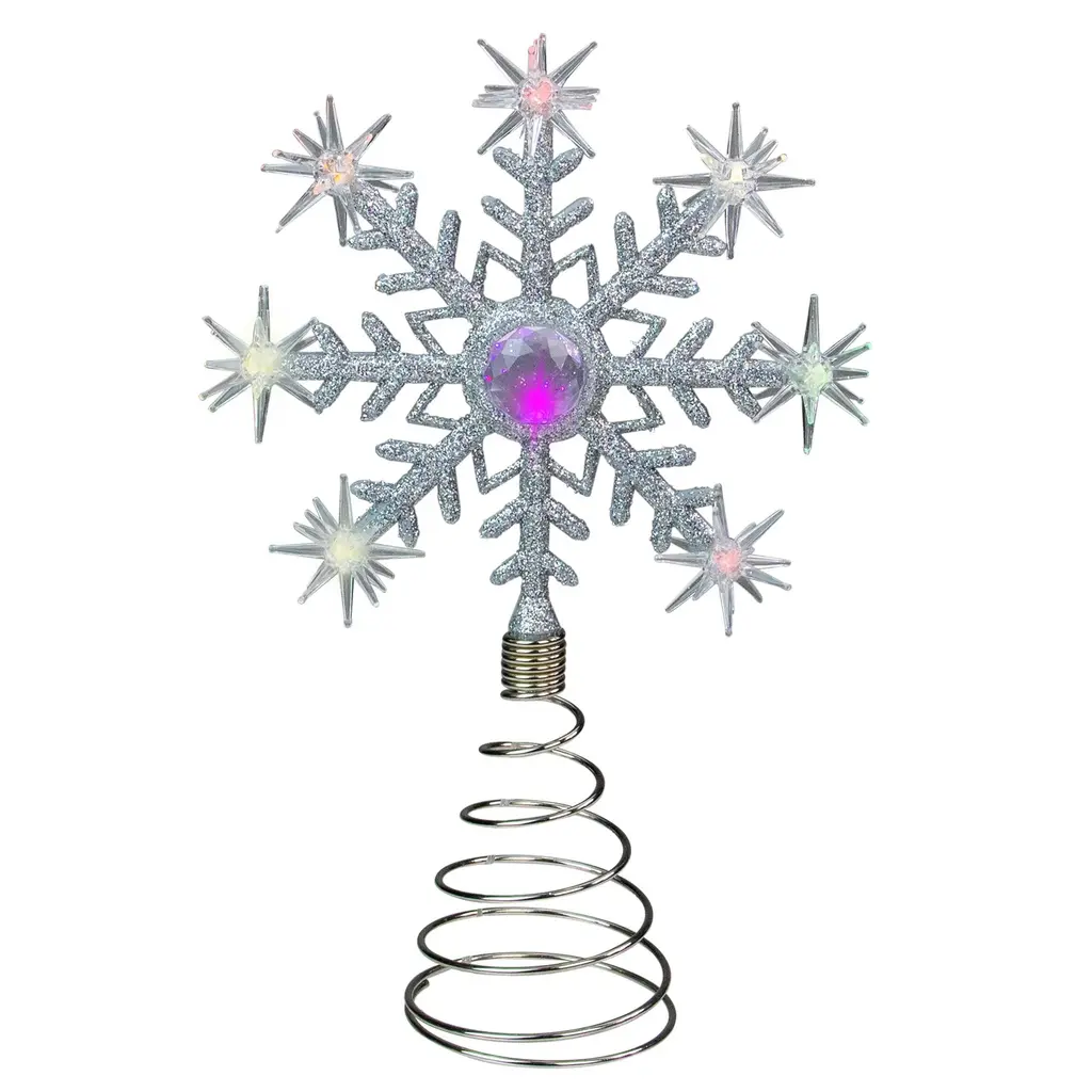 No Christmas tree is complete without a beautiful topper. This color-changing silver snowflake is the perfect addition to your tree. The LED lights twinkle randomly. Perfect for as traditional feel. Product Features: Color: color changing bulbs - red yellow purple teal and green Number of bulbs: 8 Bulb size: wide angle Bulb type: LED Requires 2 'AA' batteries - not included Double-sided design Super bright bulbs Recommended for indoor use only Dimensions: 11"H x 7.5"W x 1.5"D Material(s): plastic/metal
