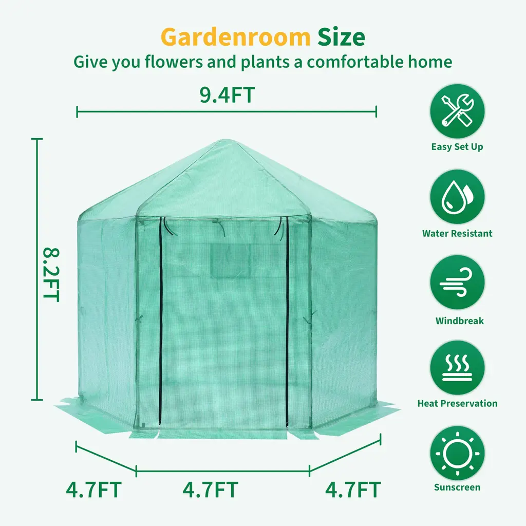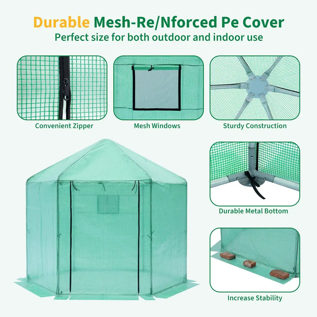 Our products are made of sturdy and durable materials, which have a certain degree of wind and weather resistance and can stably protect plants for a long time. Walk-in greenhouse upgraded polygonal reinforced and thickened. Polygonal overall stability is better, the top is linked with multiple support rods, the top force fastness is 3-4 times more than normal. Upgraded with 180g PE plaid fabric, plus fabric lining sewn to increase fastness and breakage resistance, using YKK zippers. The new model has a more spacious interior and higher height, so users feel more comfortable with the space when planting flowers inside.