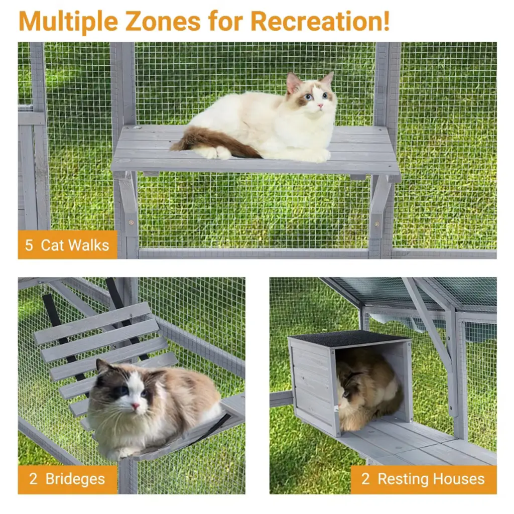 Giant Walk-In Pet Paradise This 110"L professional catio creates a 57 sq.ft safe outdoor playground for multiple pets with weather-resistant protection and interactive features. Key Features: ✔ Massive 60"H Interior - Fits 4+ adult cats comfortably ✔ Entertainment System - 7 trails + 2 bridges + dual sleeping houses ✔ Owner Accessible - Full-height door for easy cleaning/play ✔ Escape-Proof Security - 1/2" galvanized mesh + sliding bolt locks ✔ All-Weather Ready - Removable waterproof roof + UV protection Bonus: • Compatible with cat tunnels/doggy doors • Elevated kitten entry doors • Non-rust aluminum frame Perfect For: • Catteries & multi-pet homes • Rabbits/chickens needing protection • Cat parents wanting safe outdoor access