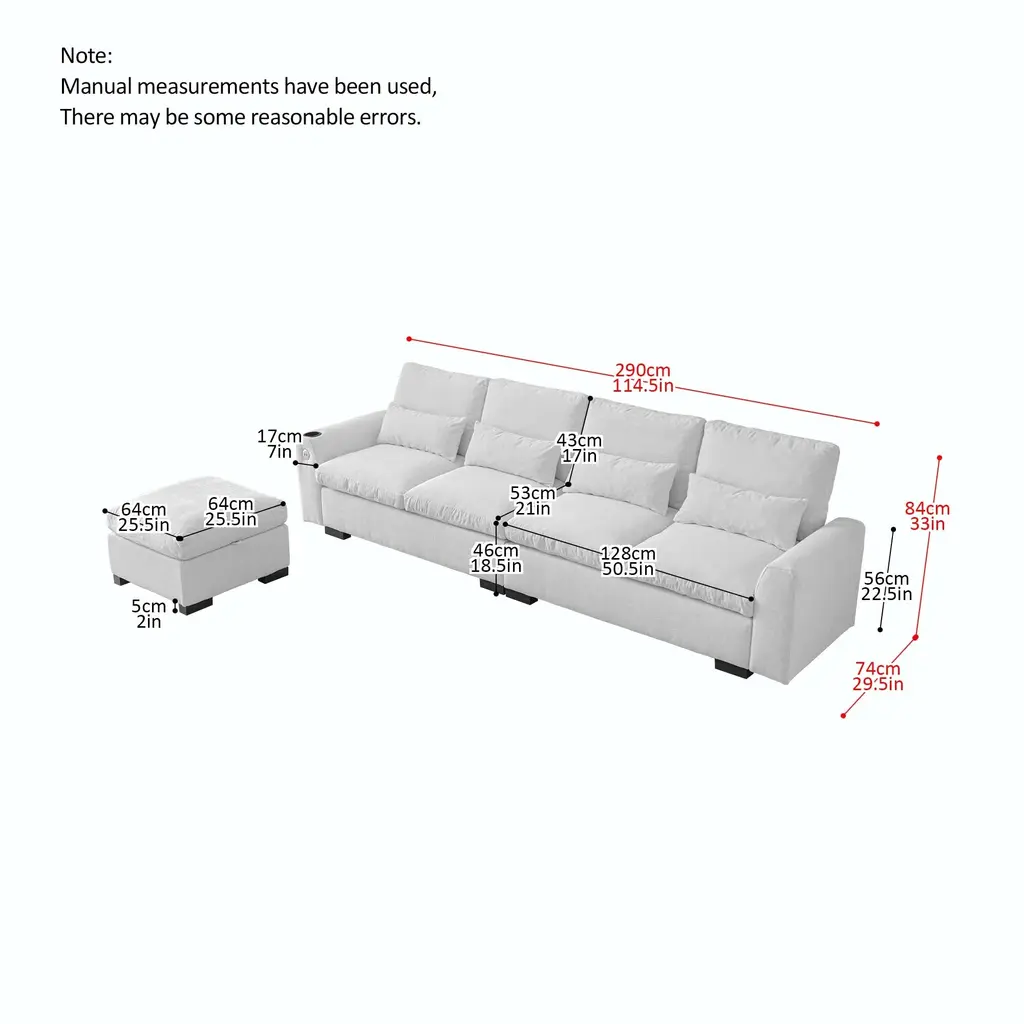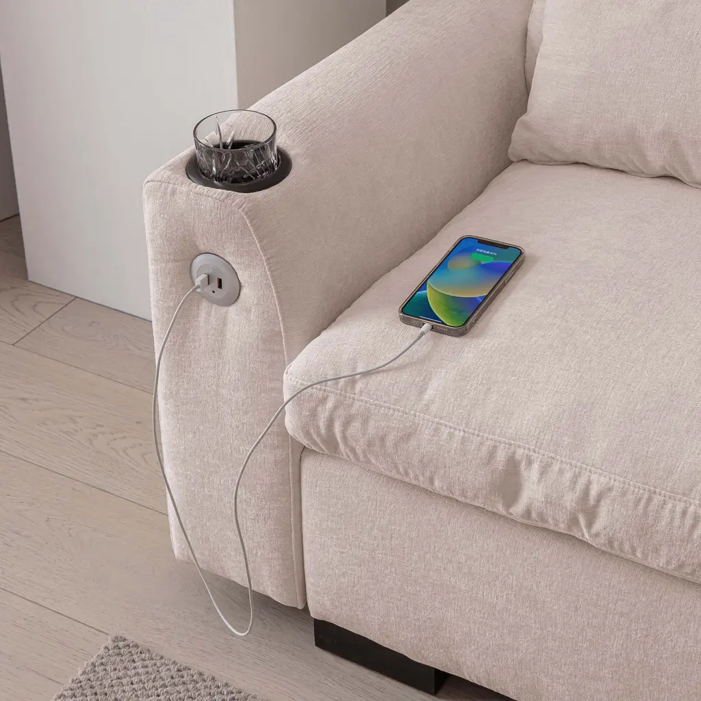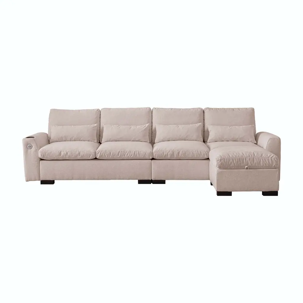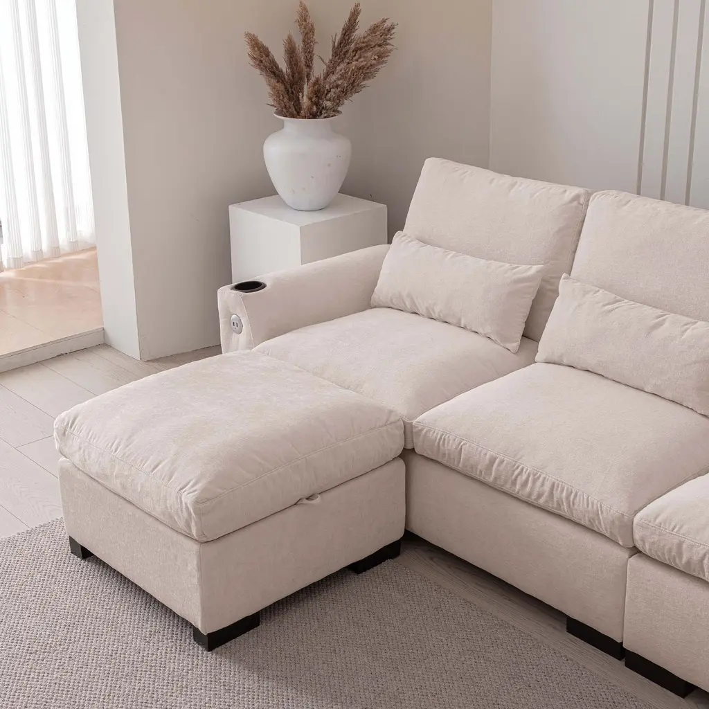 114.5"Modern Modular L Shaped Chenille Sofa Couch Reversible Ottoman With Storage Removable and Washable Cushions Sofa With USB Ports & Cup Holder For Living Room 【Product Features】 【Notes】1.Size Notice:Manual measurement has been used, there may be some reasonable errort, thanks for your understanding.2.Color Notice:Due to factors such as display equipment and shooting environment, the color of the item may be slightly different from the picture, which is a normal phenomenon, please refer to the actual item3.Assembly Notice:Please read assemble manual in advance. Please do not over-tighten nuts, as this may cause distortion or breakage.4.It is recommended to put a layer of foam or soft cushion on the floor when installing to avoid scratching the floor.5.If the item has any defects, damage or missing parts, please contact us with pictures or videos so that we can understand your needs and help you quickly, and always remember to retain its original packaging to ensure any return requests. We will try our best to solve any problems you may have.6.If you receive the wrong product, please attach the product picture, the infographic of the outer package and the picture containing SKUs, so that we can verify and quickly deal with it for you【Keep it looking its best】1.Fabric furniture Care;Dust regularly. Clean gently with a clean, slightly damp cloth. Professional cleaning is recommended.2.Wood Furniture Care:We recommend dusting frequently with a clean, soft, dry, lint-free cloth. Clean the surface by rubbing in the direction of the grain and wipe dry.3.Avoid direct sunlight.4.Avoid the use of all chemicals, household cleaners, abrasives, or cleaners that contain lemon, vinegar, or other acids that may damage the finish.5.Do not place hot appliances, such as curling irons and hot hair dryers directly on the countertop.6.Spot clean using distilled water and water-based cleaning agents, foam or mild water-free cleaning solvents. 7.Always test a small inconspicuous area first.8.Hardware may loosen over time; periodically check to make sure all connections are tight