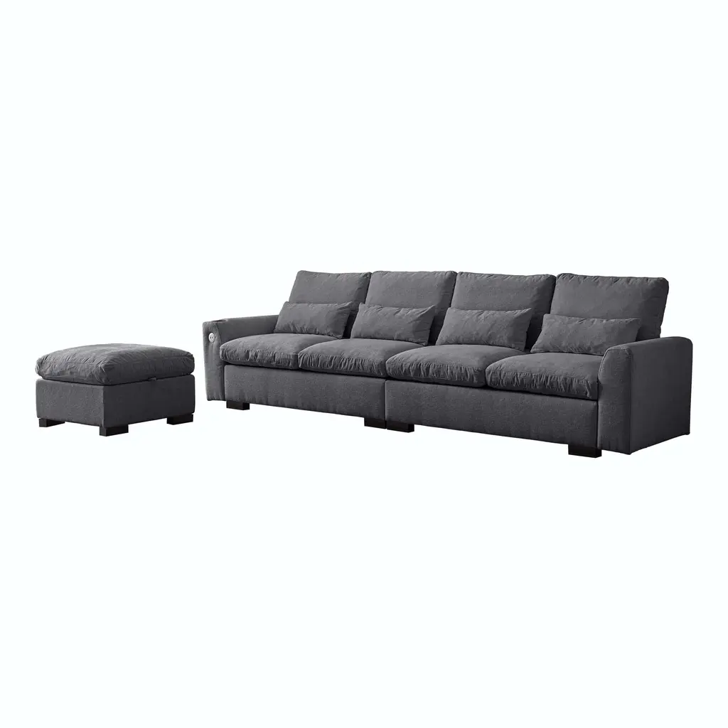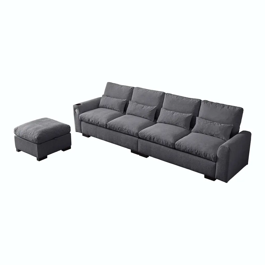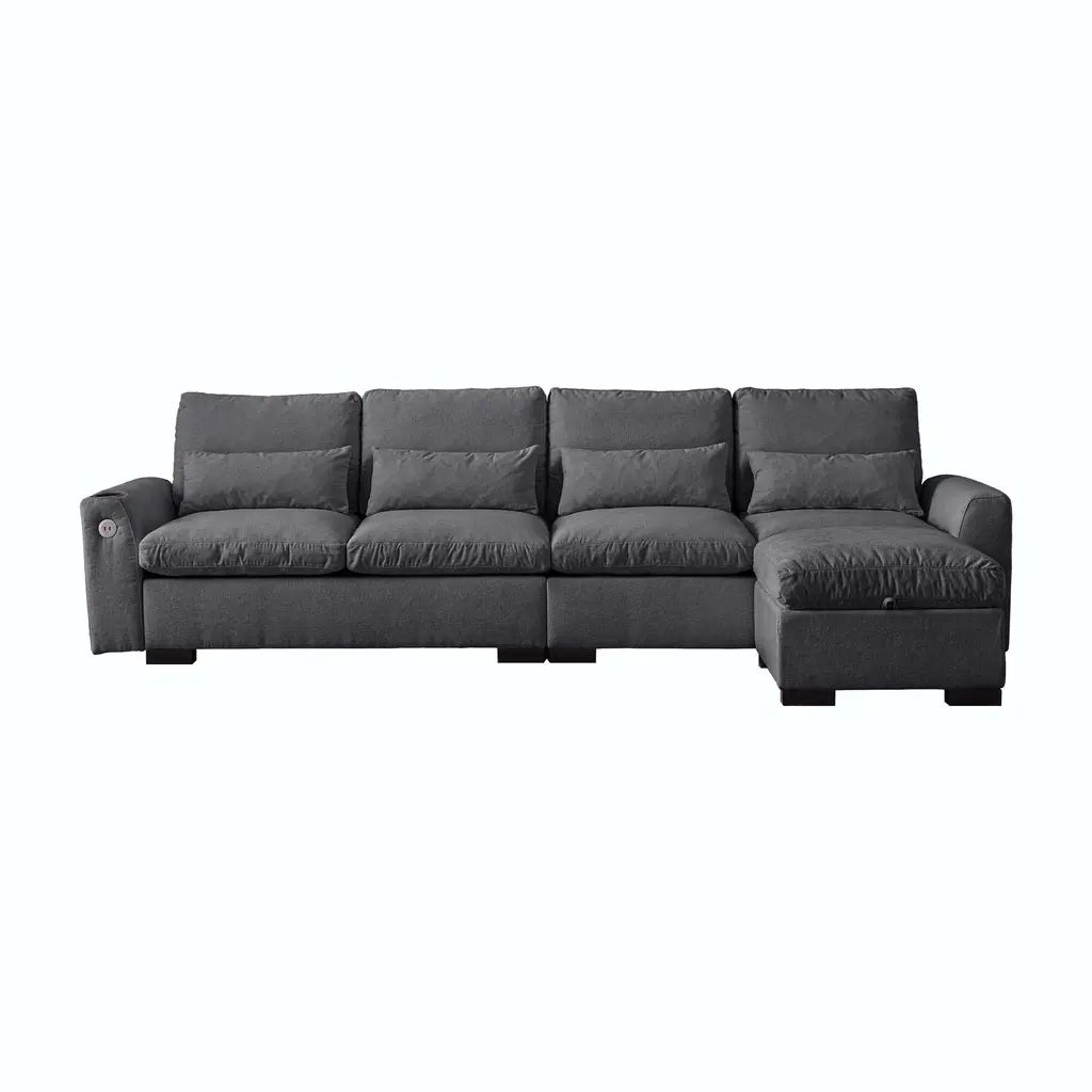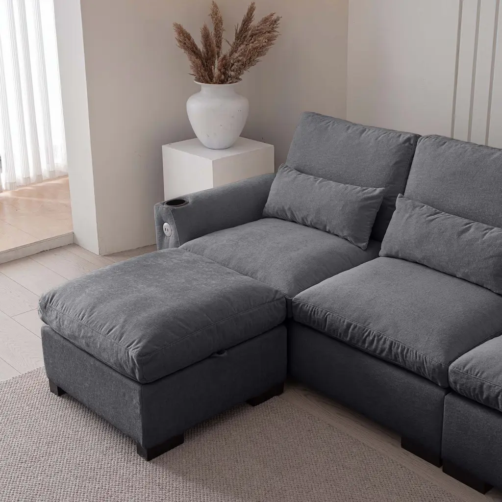 114.5"Modern Modular L Shaped Chenille Sofa Couch Reversible Ottoman With Storage Removable and Washable Cushions Sofa With USB Ports & Cup Holder For Living Room 【Product Features】 【Notes】1.Size Notice:Manual measurement has been used, there may be some reasonable errort, thanks for your understanding.2.Color Notice:Due to factors such as display equipment and shooting environment, the color of the item may be slightly different from the picture, which is a normal phenomenon, please refer to the actual item3.Assembly Notice:Please read assemble manual in advance. Please do not over-tighten nuts, as this may cause distortion or breakage.4.It is recommended to put a layer of foam or soft cushion on the floor when installing to avoid scratching the floor.5.If the item has any defects, damage or missing parts, please contact us with pictures or videos so that we can understand your needs and help you quickly, and always remember to retain its original packaging to ensure any return requests. We will try our best to solve any problems you may have.6.If you receive the wrong product, please attach the product picture, the infographic of the outer package and the picture containing SKUs, so that we can verify and quickly deal with it for you【Keep it looking its best】1.Fabric furniture Care;Dust regularly. Clean gently with a clean, slightly damp cloth. Professional cleaning is recommended.2.Wood Furniture Care:We recommend dusting frequently with a clean, soft, dry, lint-free cloth. Clean the surface by rubbing in the direction of the grain and wipe dry.3.Avoid direct sunlight.4.Avoid the use of all chemicals, household cleaners, abrasives, or cleaners that contain lemon, vinegar, or other acids that may damage the finish.5.Do not place hot appliances, such as curling irons and hot hair dryers directly on the countertop.6.Spot clean using distilled water and water-based cleaning agents, foam or mild water-free cleaning solvents. 7.Always test a small inconspicuous area first.8.Hardware may loosen over time; periodically check to make sure all connections are tight