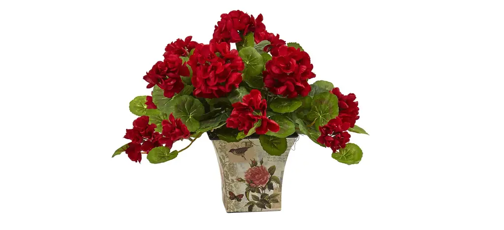 This pair of Geranium Flowering Silk Plants with Floral Planters is bold and beautiful. Its bright colored petals and green leaves create contrast with the muted colors on the floral planter. The intricacy of the Geranium's petals adds texture and depth to the arrangement. Perfect for end tables, bookshelves, night tables, and more.