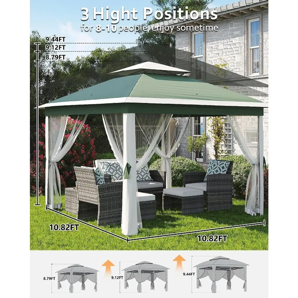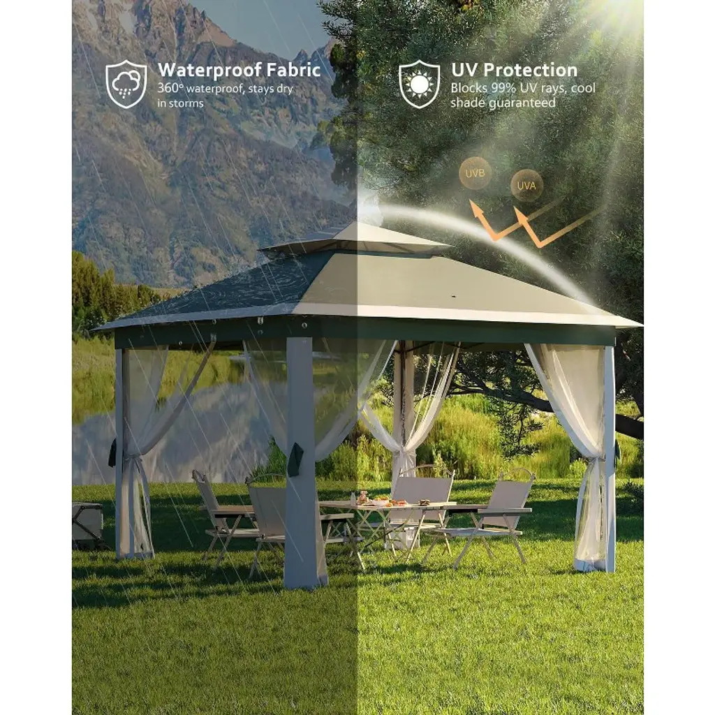 "4-Season Warrior: Snow-load reinforced roof + fade-resistant fabric (tested for 1500+ hours UV exposure). Bugs-Out Luxury: Fine-mesh nets seal seamlessly without frame gaps—enjoy candlelit dinners bite-free. Climate Control: Double roof reduces interior heat by 15°F; open walls maximize breezes or close nets for privacy. Entertainer’s Dream: Host 8 guests comfortably under rain or shine; perfect for wedding tents, farmers markets, or poolside cabanas. Smart Storage: Rolls flat into 40” bag (fits in car trunks); no tools needed for reassembly. Perfect For: Coastal homes battling salt/sun Mountain cabins needing snow/wind resistance Backyard weddings outdoor kitchens Deck owners seeking permanent shade with removable nets Glampers needing luxury shelter (fits over RVs/picnic tables)"