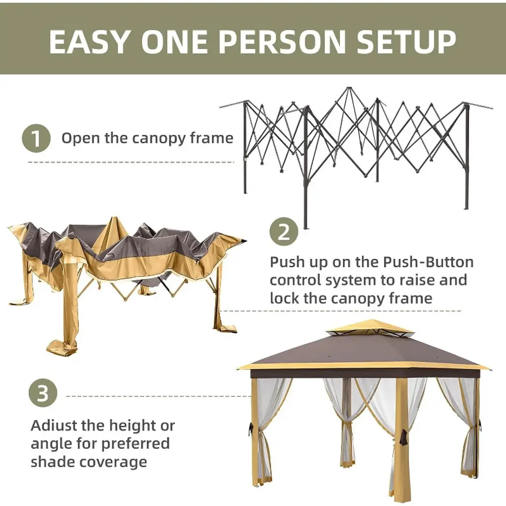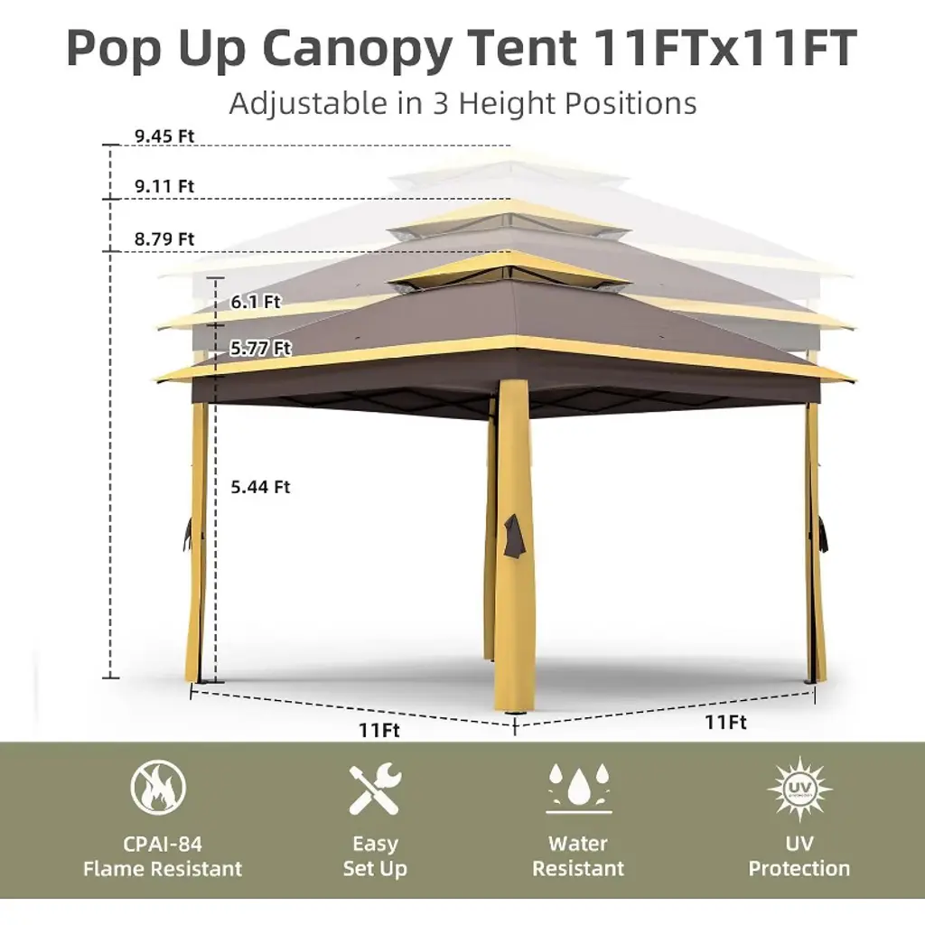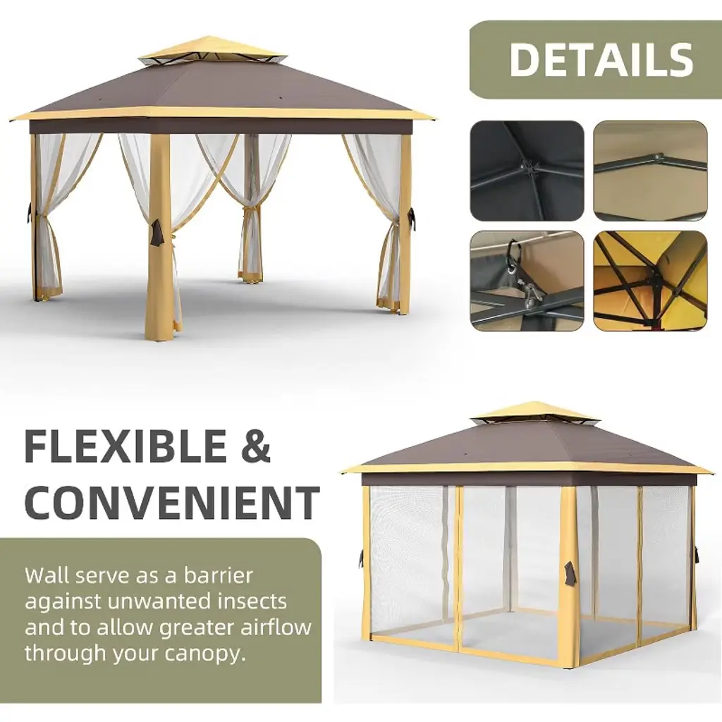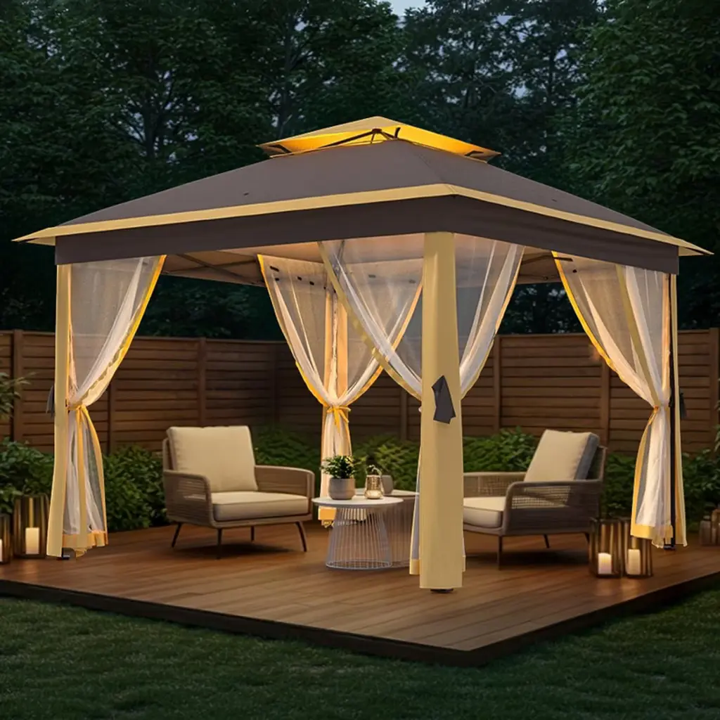 "4-Season Warrior: Snow-load reinforced roof + fade-resistant fabric (tested for 1500+ hours UV exposure). Bugs-Out Luxury: Fine-mesh nets seal seamlessly without frame gaps—enjoy candlelit dinners bite-free. Climate Control: Double roof reduces interior heat by 15°F; open walls maximize breezes or close nets for privacy. Entertainer’s Dream: Host 8 guests comfortably under rain or shine; perfect for wedding tents, farmers markets, or poolside cabanas. Smart Storage: Rolls flat into 40” bag (fits in car trunks); no tools needed for reassembly. Perfect For: Coastal homes battling salt/sun Mountain cabins needing snow/wind resistance Backyard weddings outdoor kitchens Deck owners seeking permanent shade with removable nets Glampers needing luxury shelter (fits over RVs/picnic tables)"